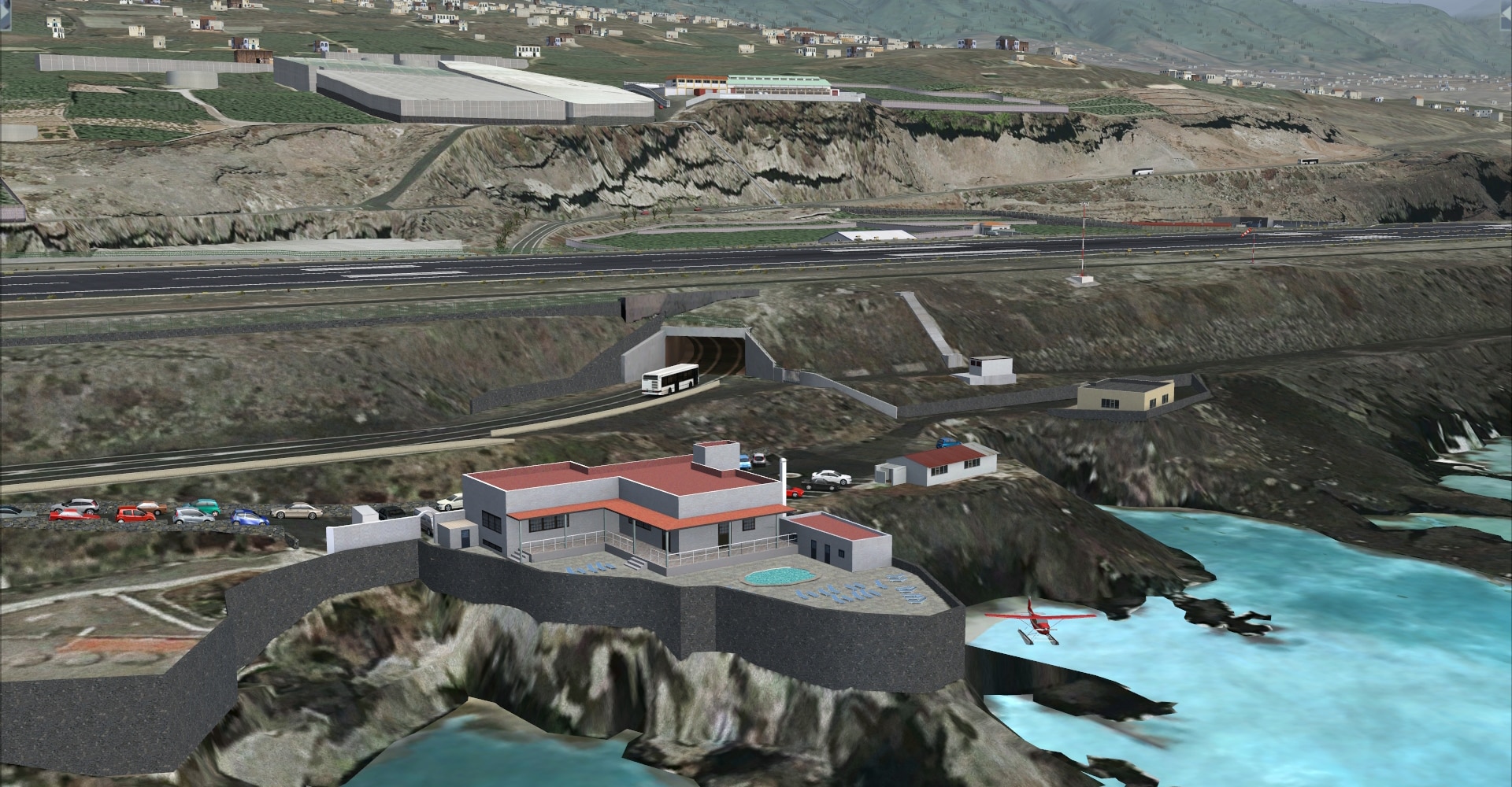 • Eigenes, detailliertes 3D-Höhenmodell im Flughafenbereich, inklusive der Tunnelunterführung, Brücken und Straßen sowie der ins Meer abfallenden Küste. Alle Gebäude und Straßen auf realen Höhen.