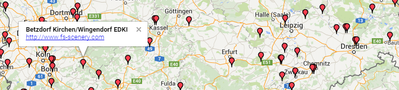 Die Seite Freewarescenery.com ist per se schon eine fantastische Seite mit Links zu tausenden Freeware-Addons auf der ganzen Welt. Nun gibt es praktische Übersichtskarten verschiedener Länder, die die entsprechenden Links auf einer Karte verorten. Natürlich auch für Deutschland.