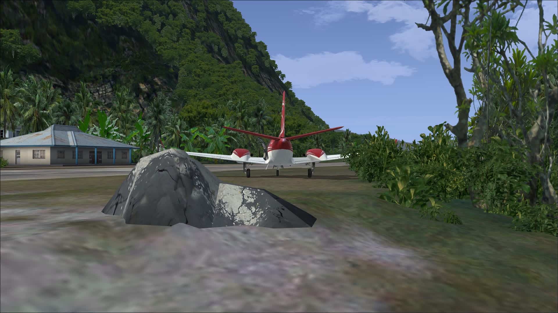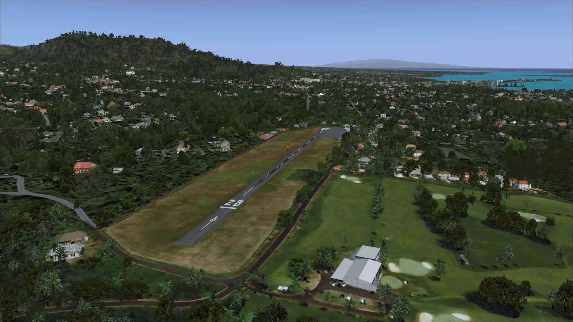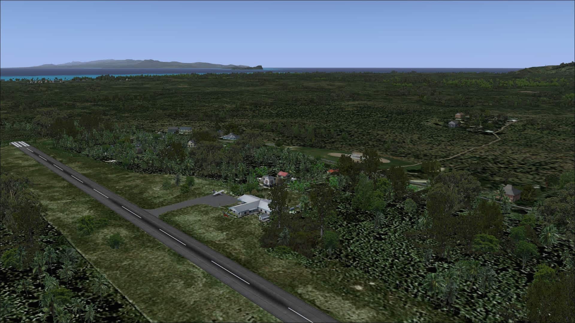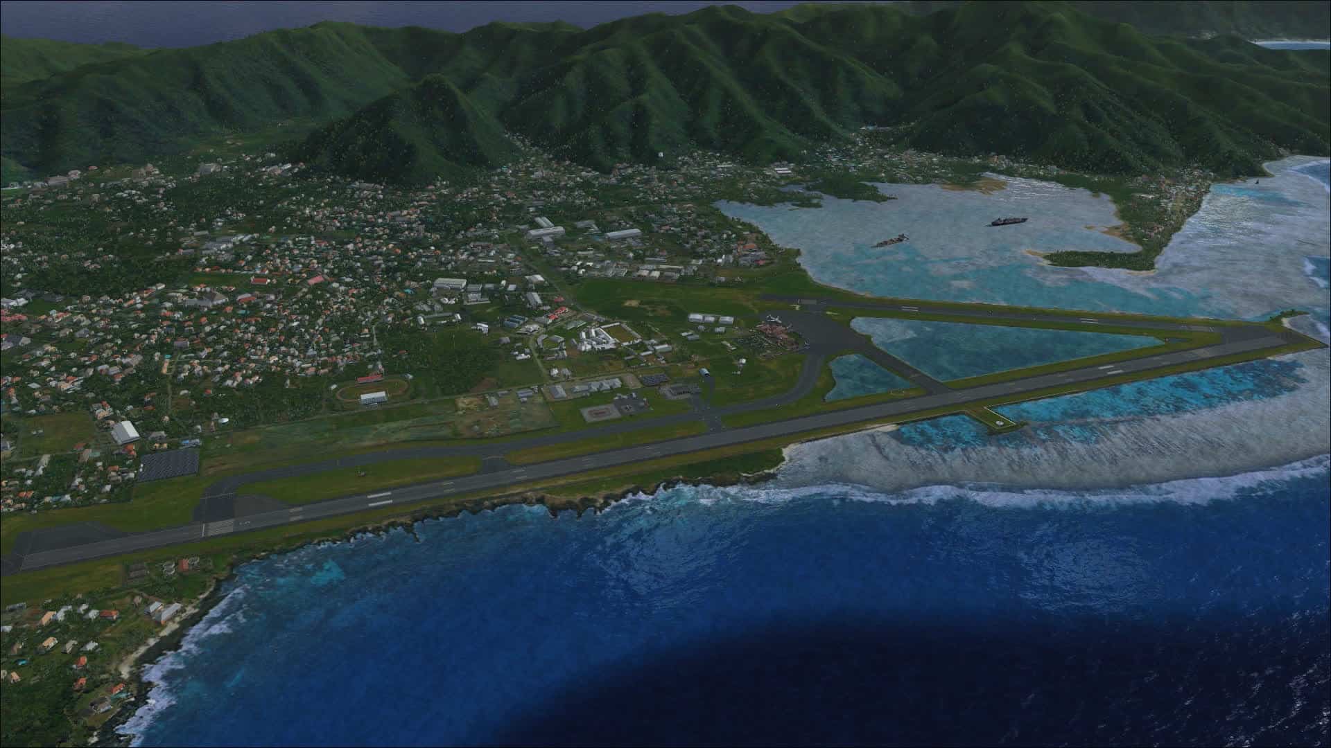 Der Flughafen von Apia ist zwar modelliert, aber die Landebahn scheint FSX-Default zu sein, und die Fototextur ist deutlich weniger hoch aufgelöst. Ein Qualitätsunterschied zu Pago Pago ist daher beim Landen erkennbar. Der Flughafen selbst (Vorfeld und Empfangsgebäude) ist aber ausgiebig mit Gebäuden, Menschen und Flugzeugen ausgestattet und auch aus der Nähe schön anzusehen. Schade eben, dass auch die Rollfeldtextur sehr grob ist. Aus dem Cockpit sieht die Wiese nicht wirklich schön aus.