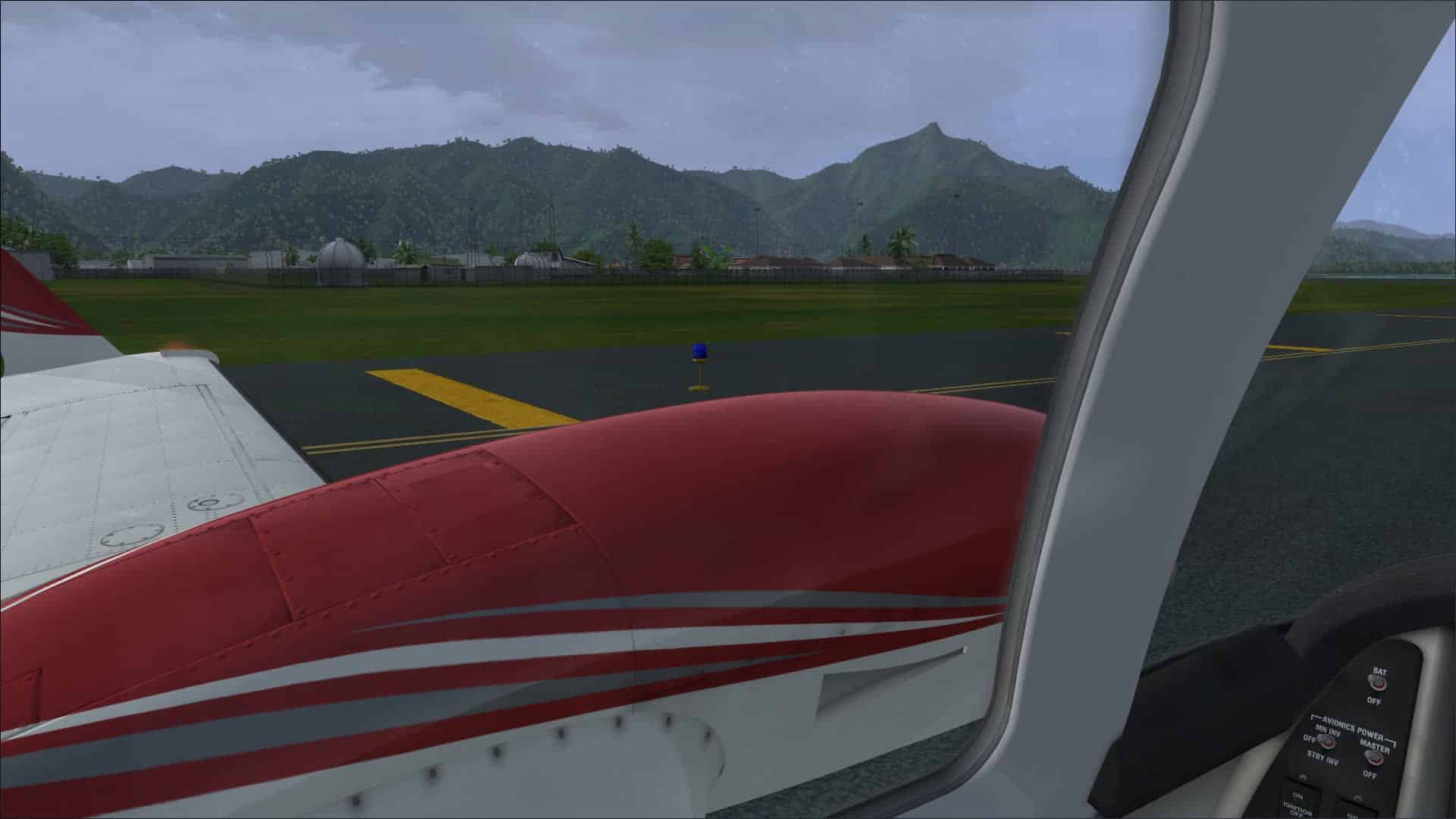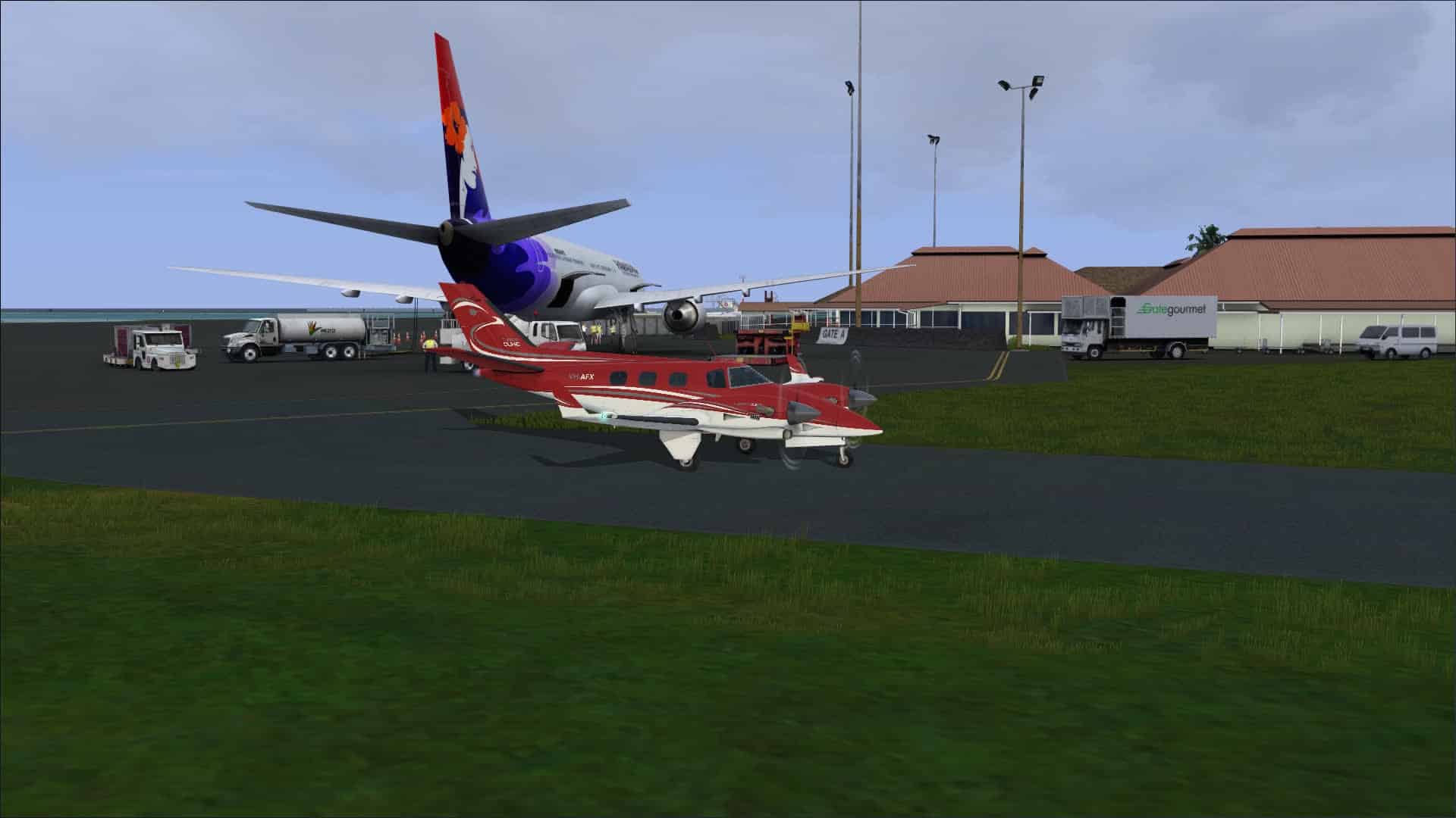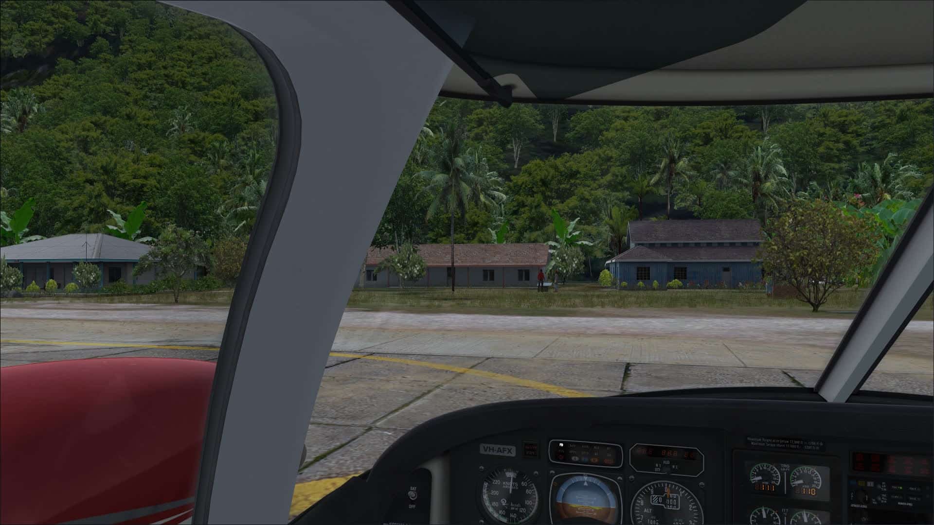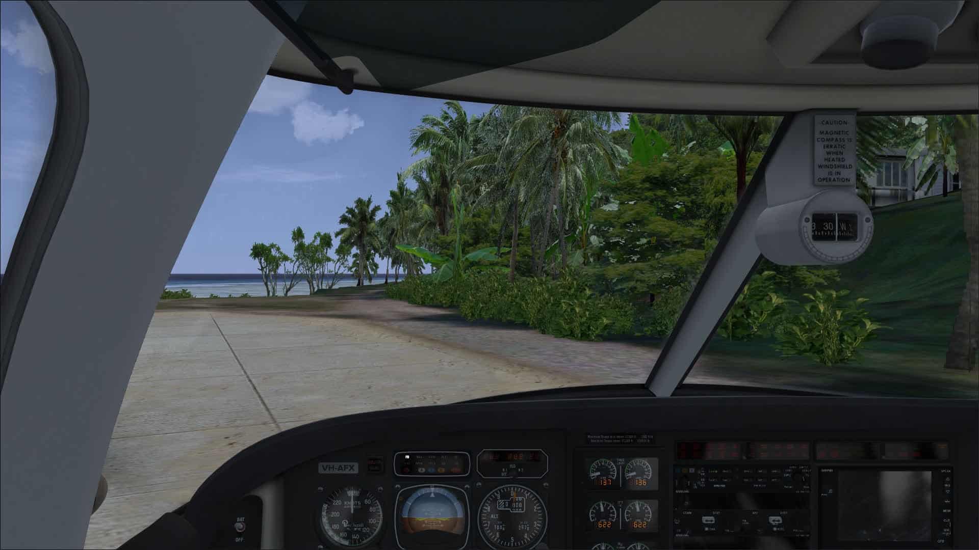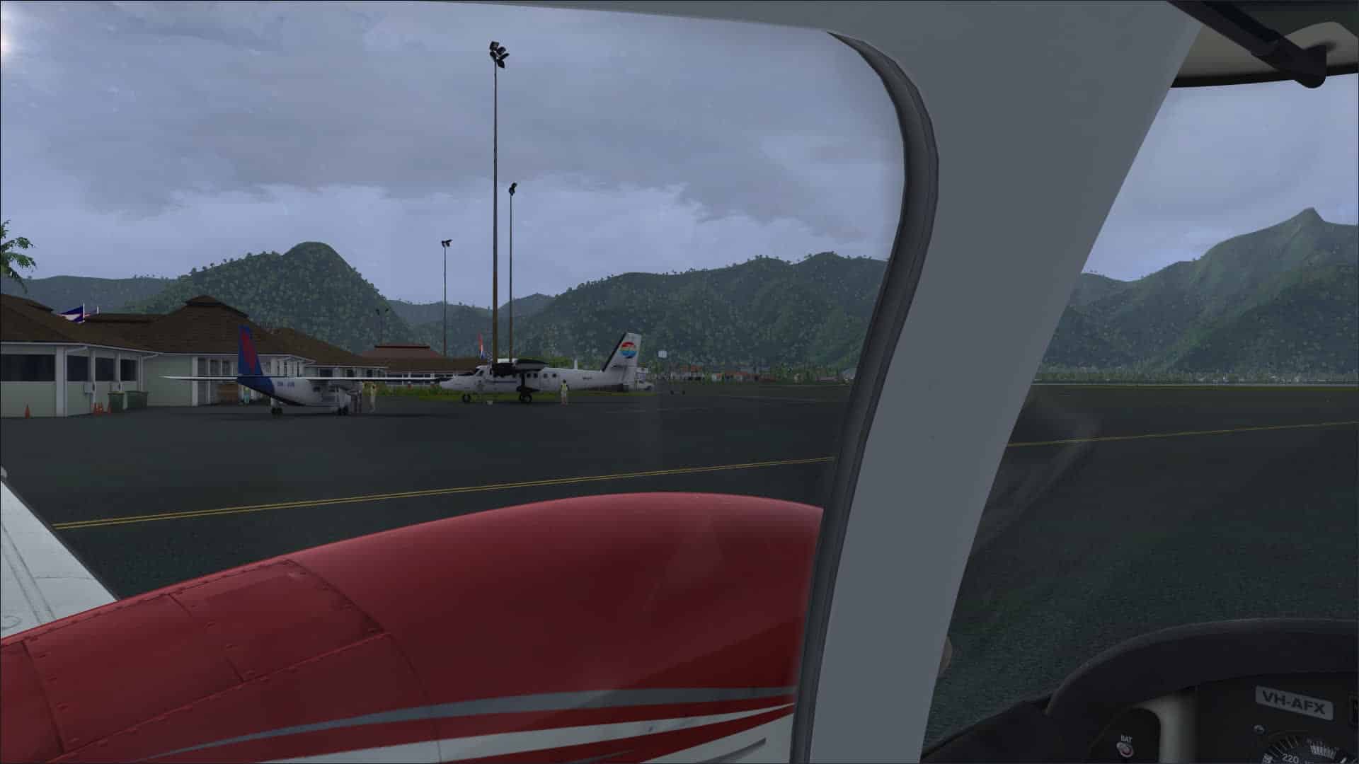Der Flughafen von Apia ist zwar modelliert, aber die Landebahn scheint FSX-Default zu sein, und die Fototextur ist deutlich weniger hoch aufgelöst. Ein Qualitätsunterschied zu Pago Pago ist daher beim Landen erkennbar. Der Flughafen selbst (Vorfeld und Empfangsgebäude) ist aber ausgiebig mit Gebäuden, Menschen und Flugzeugen ausgestattet und auch aus der Nähe schön anzusehen. Schade eben, dass auch die Rollfeldtextur sehr grob ist. Aus dem Cockpit sieht die Wiese nicht wirklich schön aus.