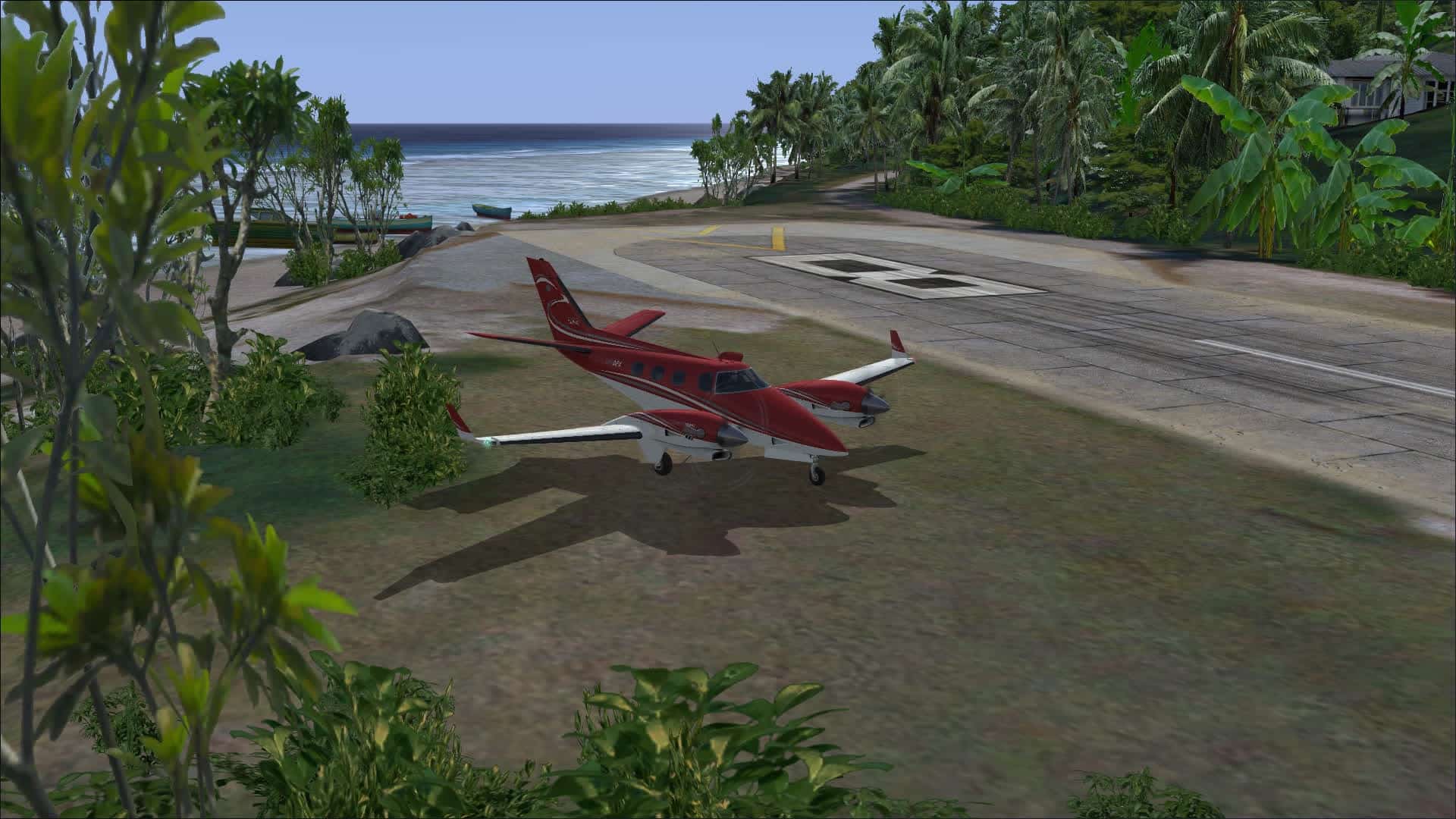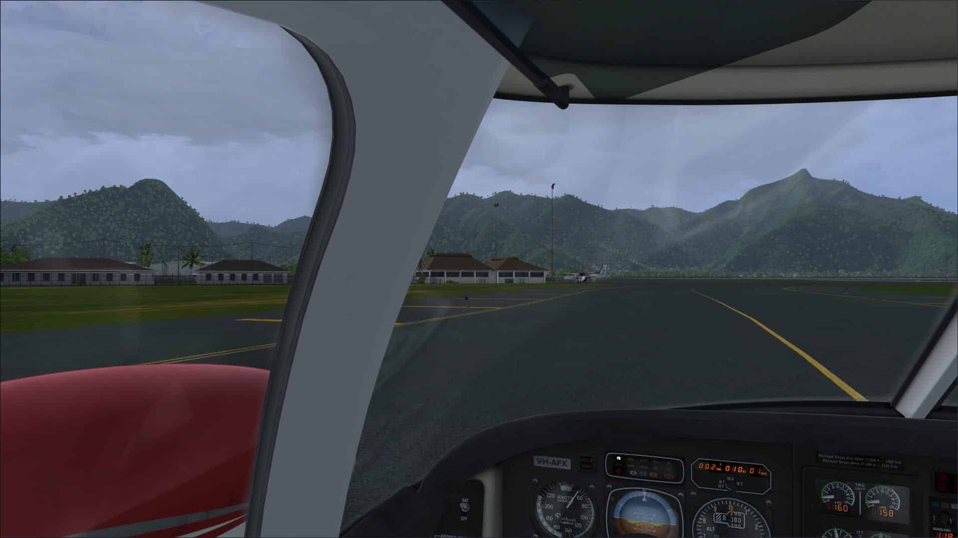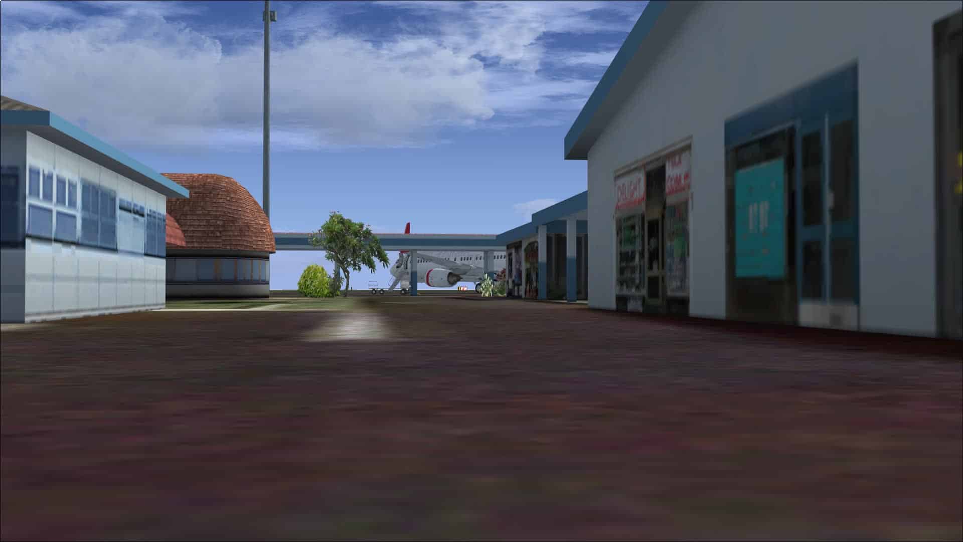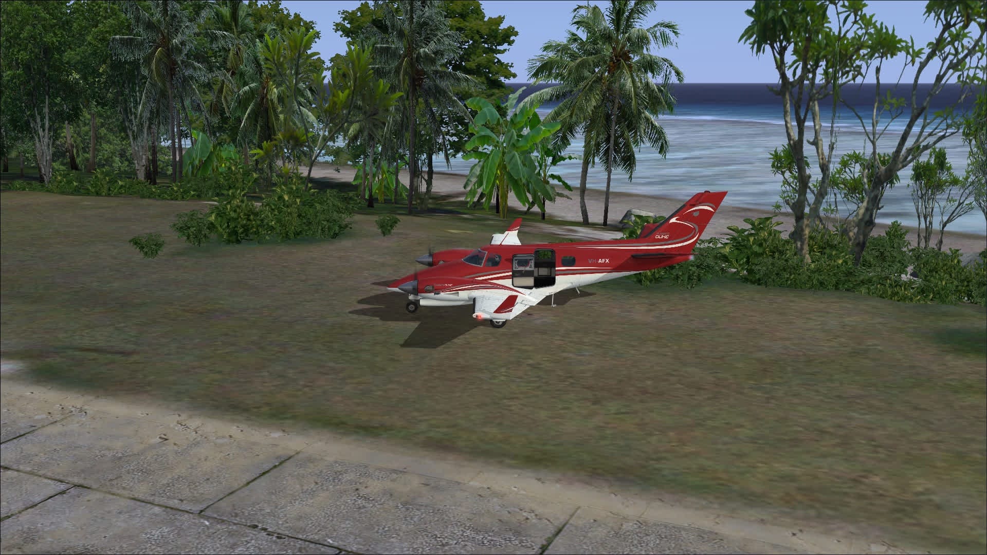 Der Flughafen von Apia ist zwar modelliert, aber die Landebahn scheint FSX-Default zu sein, und die Fototextur ist deutlich weniger hoch aufgelöst. Ein Qualitätsunterschied zu Pago Pago ist daher beim Landen erkennbar. Der Flughafen selbst (Vorfeld und Empfangsgebäude) ist aber ausgiebig mit Gebäuden, Menschen und Flugzeugen ausgestattet und auch aus der Nähe schön anzusehen. Schade eben, dass auch die Rollfeldtextur sehr grob ist. Aus dem Cockpit sieht die Wiese nicht wirklich schön aus.