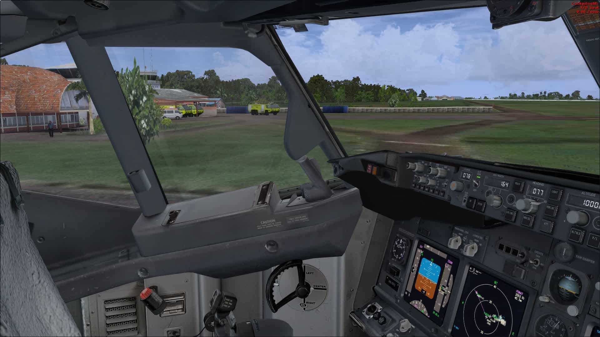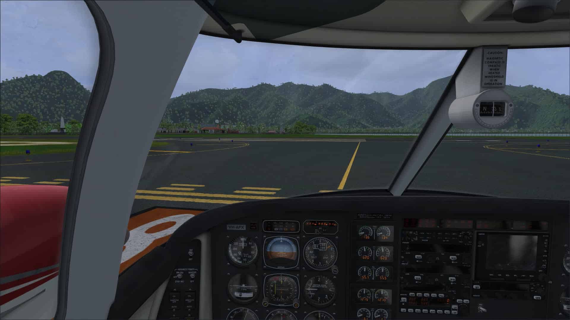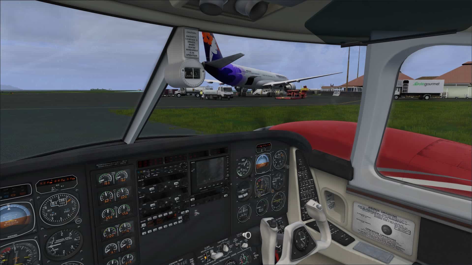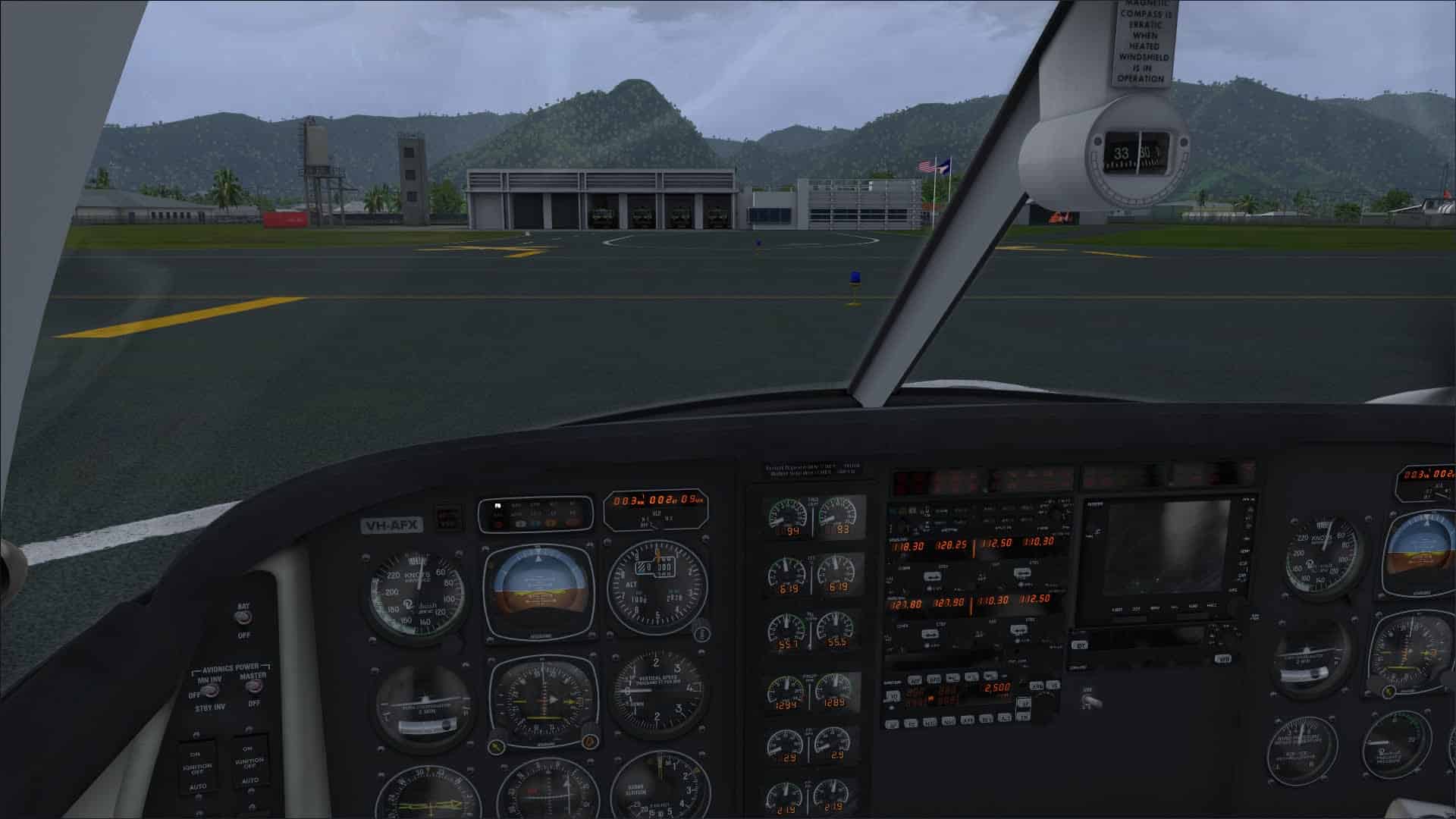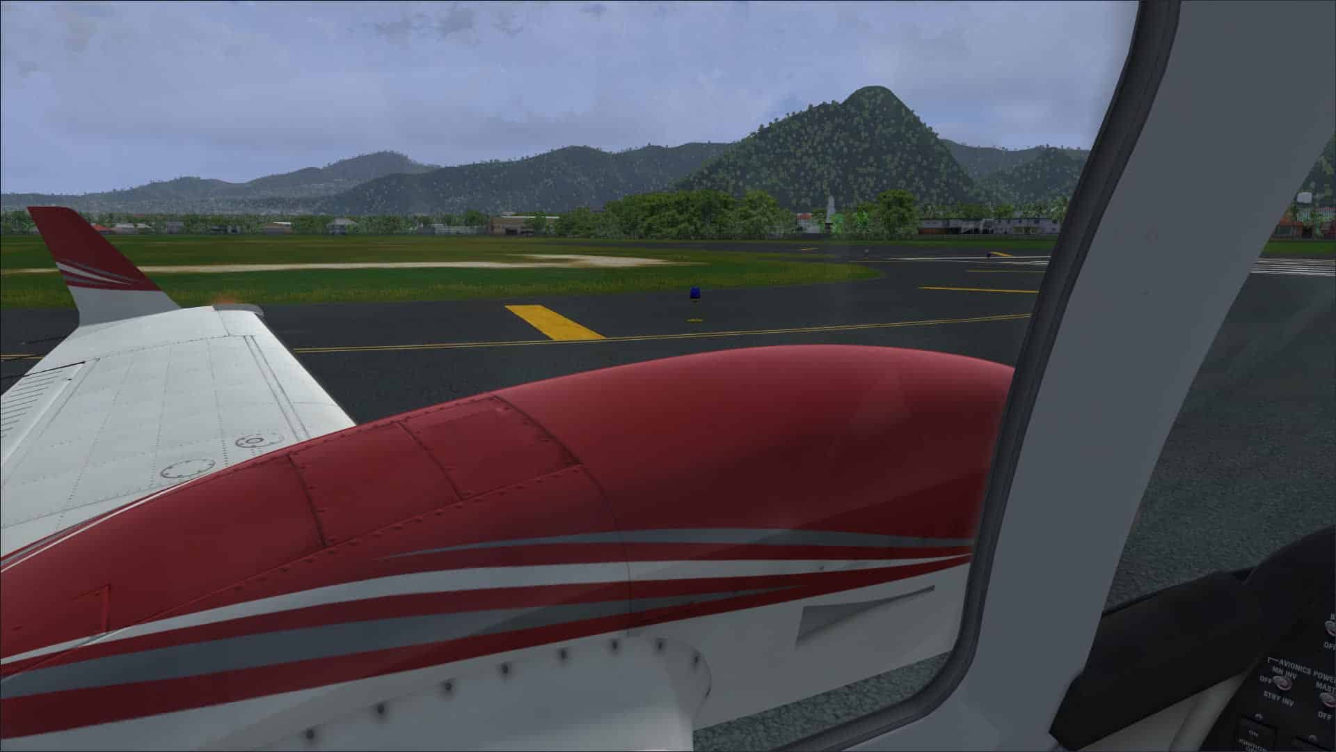 Der Flughafen von Apia ist zwar modelliert, aber die Landebahn scheint FSX-Default zu sein, und die Fototextur ist deutlich weniger hoch aufgelöst. Ein Qualitätsunterschied zu Pago Pago ist daher beim Landen erkennbar. Der Flughafen selbst (Vorfeld und Empfangsgebäude) ist aber ausgiebig mit Gebäuden, Menschen und Flugzeugen ausgestattet und auch aus der Nähe schön anzusehen. Schade eben, dass auch die Rollfeldtextur sehr grob ist. Aus dem Cockpit sieht die Wiese nicht wirklich schön aus.