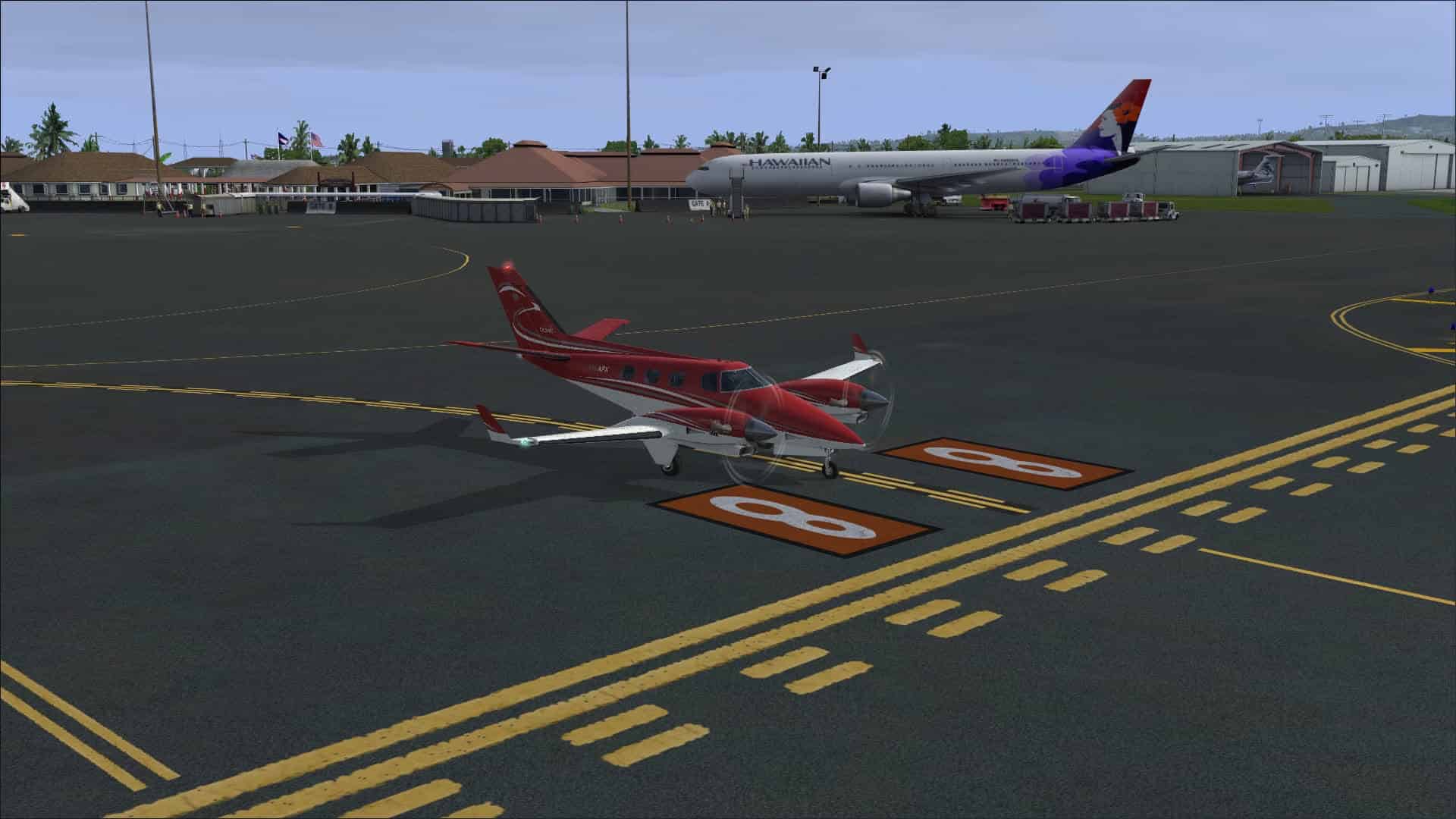 Der Wind weht heute aus 80°, und damit bietet sich für unser Sportflugzeug die kleinere der beiden Bahnen mit Ausrichtung 08 an. Auf dem Weg dorthin kommen wir zunächst an einem belebten Hangar und anschließend an der 767 von Hawaiin Airlines vorbei, die offensichtlich gerade für den langen Flug über den Pazifik vorbereitet wird.