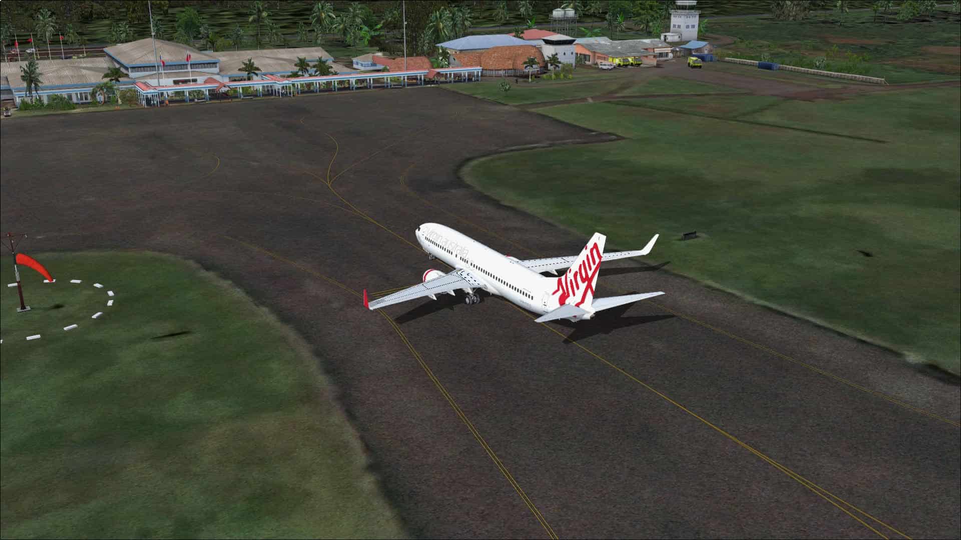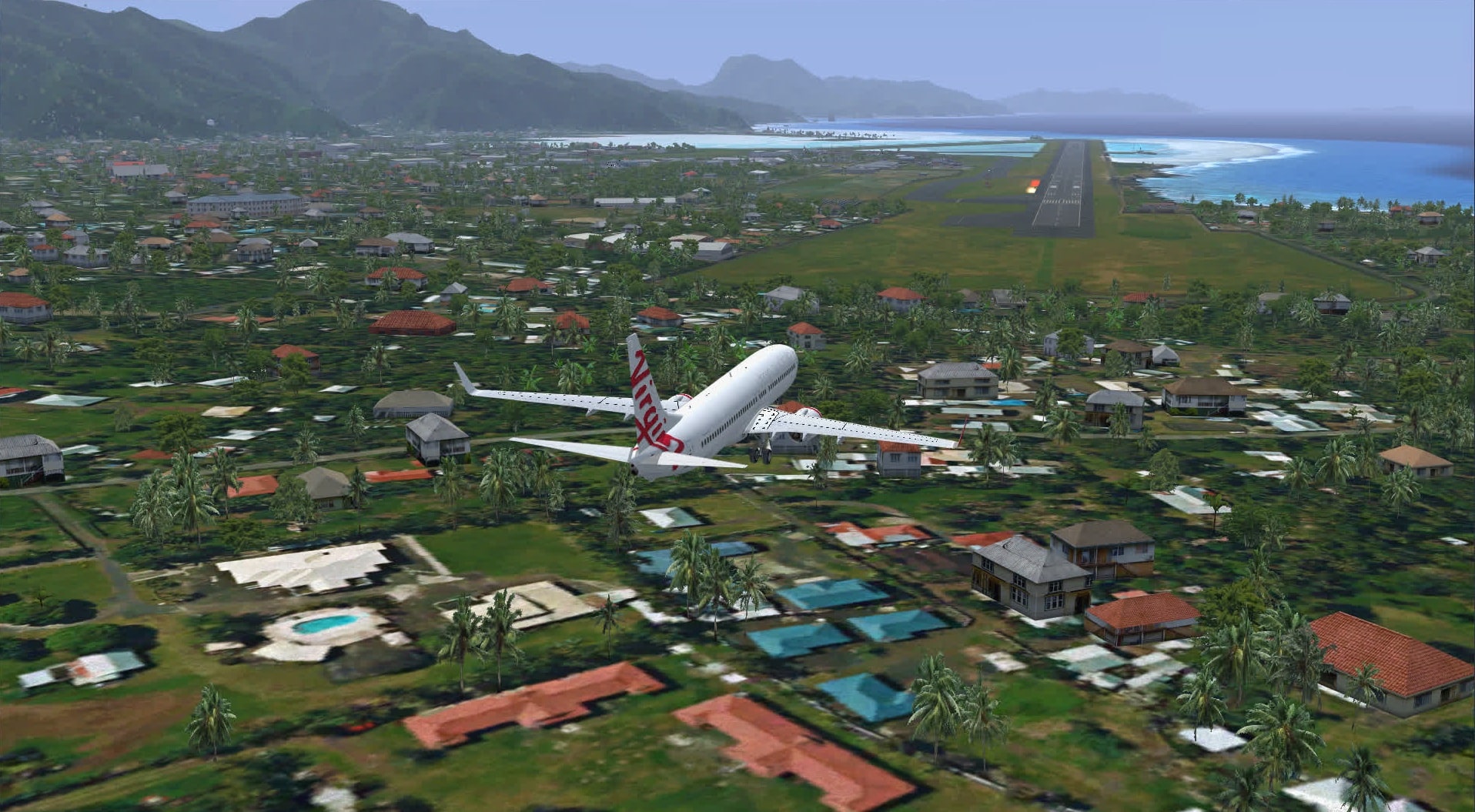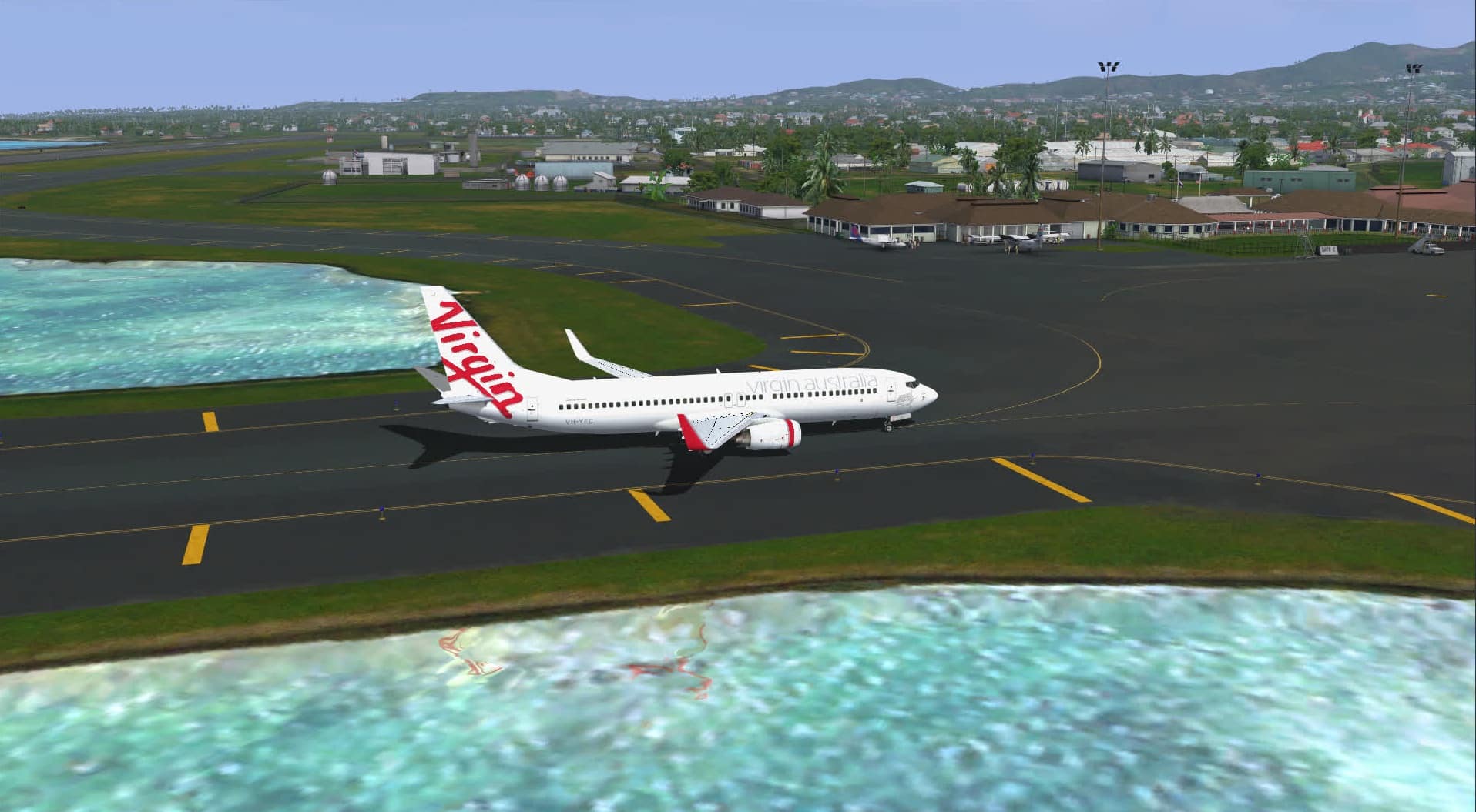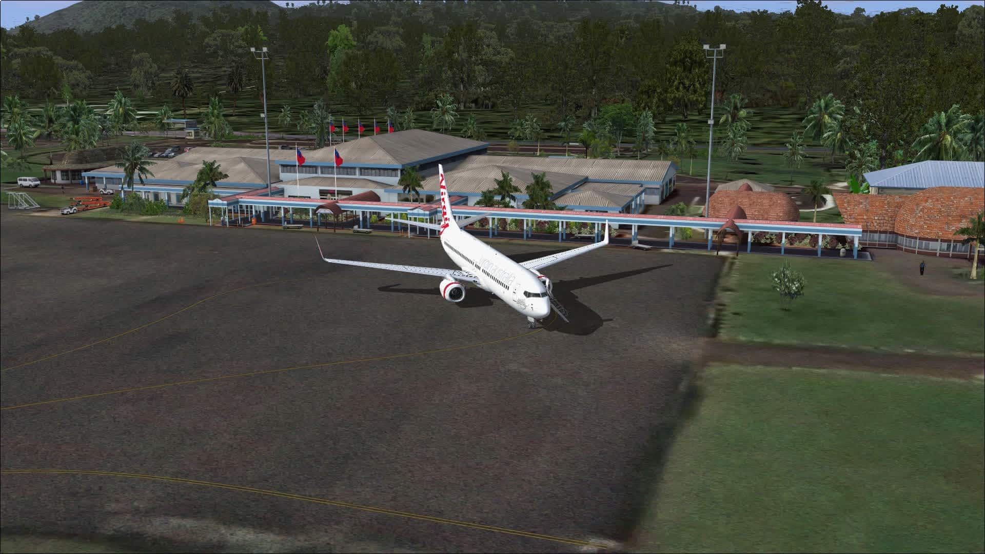 Auch auf West-Samoa gibt es einen internationalen Flughafen: Apia NSFA mit seiner 3000-Meter-Bahn ist der Anlaufpunkt für Flüge aus Australien und Neuseeland. Apia ist etwas kleiner als Pago, und der westliche Bereich von Samoa ist auch weniger detailliert modelliert als Amerikanisch-Samoa. Luftlinie ist die Strecke von Pago nach Apia etwa 130 km, dafür ist die 737 von Virgin Australia vielleicht etwas zu groß gewählt. Da Apia im Gegensatz zu Pago aber über Stars verfügt, ist es vorteilhaft, ein FMC an Bord zu haben.