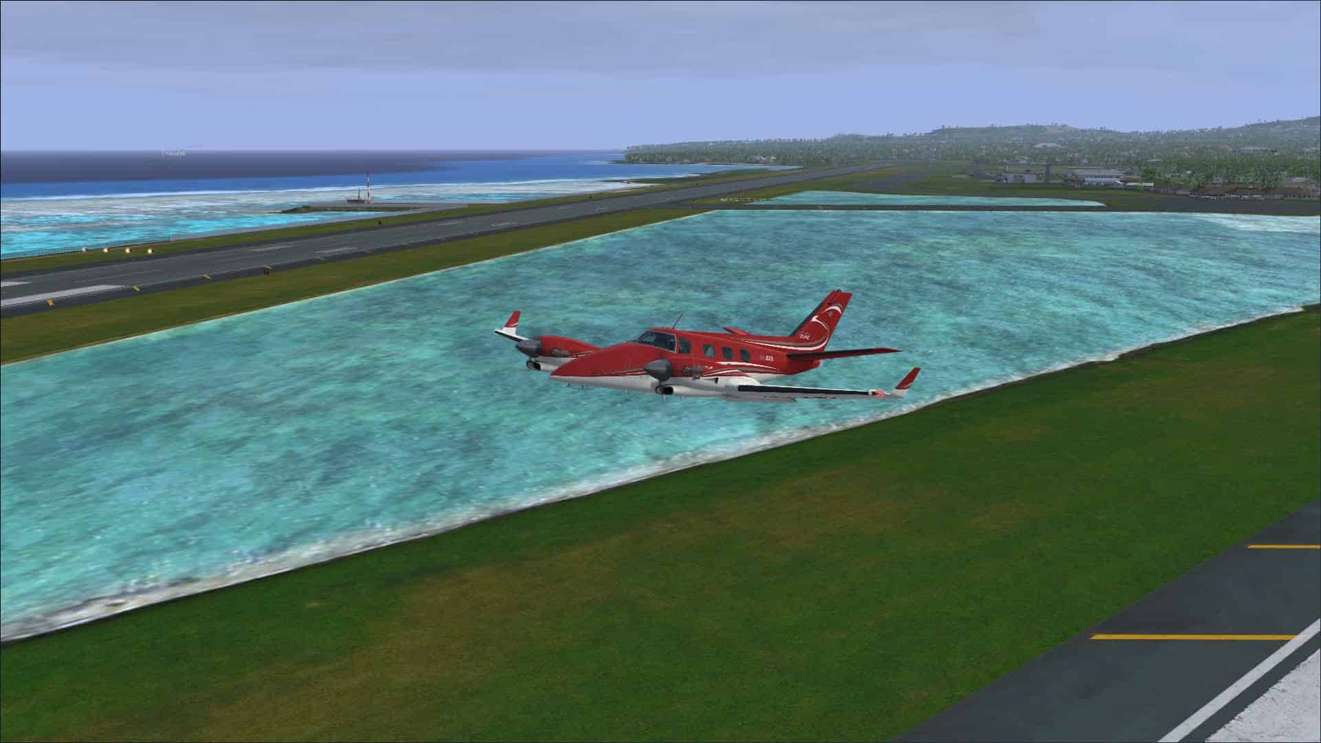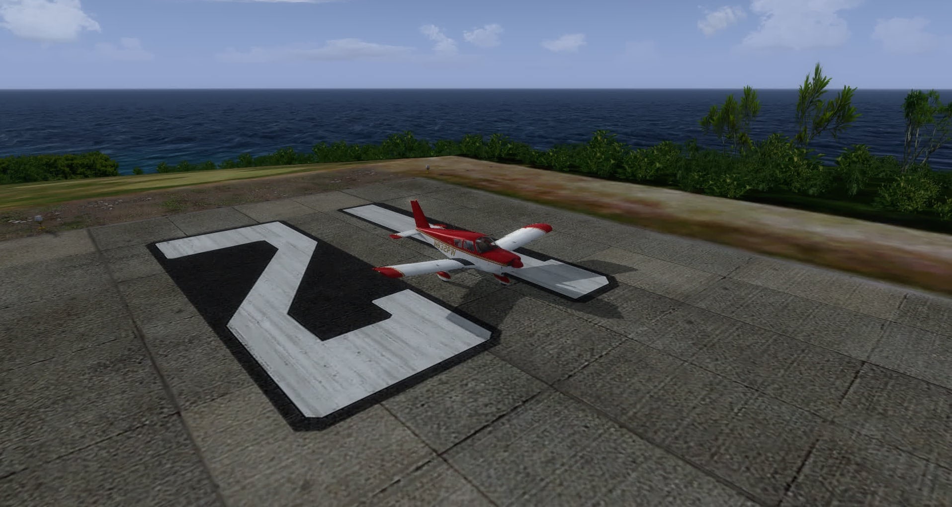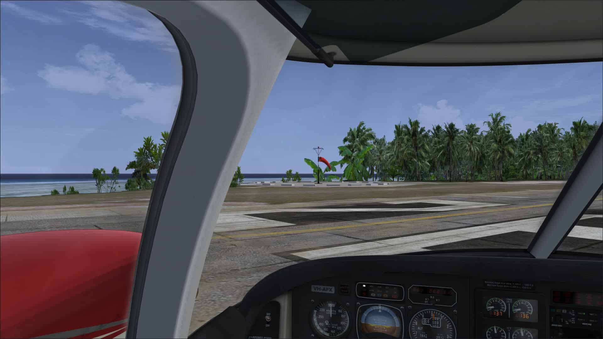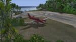 Nach der Landung stellt sich die Frage, wo der Flieger denn hingestellt werden sollte. Am 08er-Ende der Bahn ist rechts eine kleine Wiese, nehmen wir doch die. Von hier aus könnte man in der Realität nun kurz die paar Meter zum Strand gehen und ins Wasser hüpfen. Das machen wir aber nicht, wir wollen uns ja noch Tau ansehen! Also los, wieder auf die Bahn, und Abflug zur nächsten Insel.
