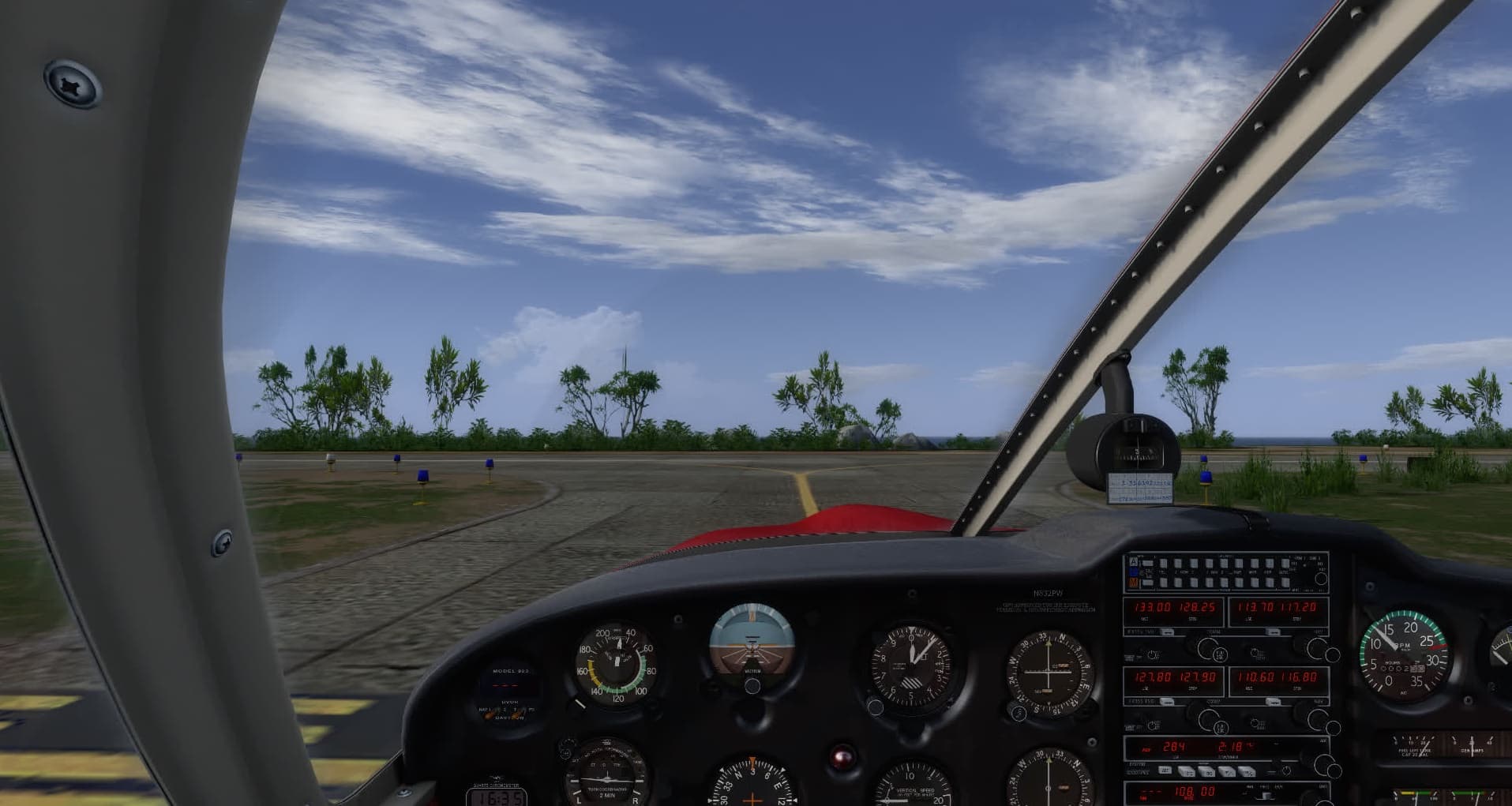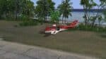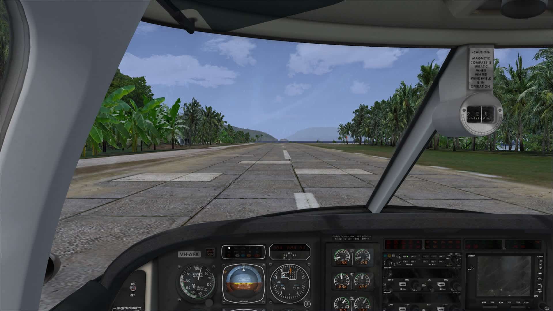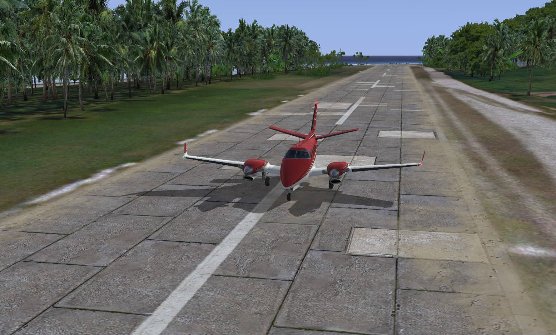 Nach der Landung stellt sich die Frage, wo der Flieger denn hingestellt werden sollte. Am 08er-Ende der Bahn ist rechts eine kleine Wiese, nehmen wir doch die. Von hier aus könnte man in der Realität nun kurz die paar Meter zum Strand gehen und ins Wasser hüpfen. Das machen wir aber nicht, wir wollen uns ja noch Tau ansehen! Also los, wieder auf die Bahn, und Abflug zur nächsten Insel.