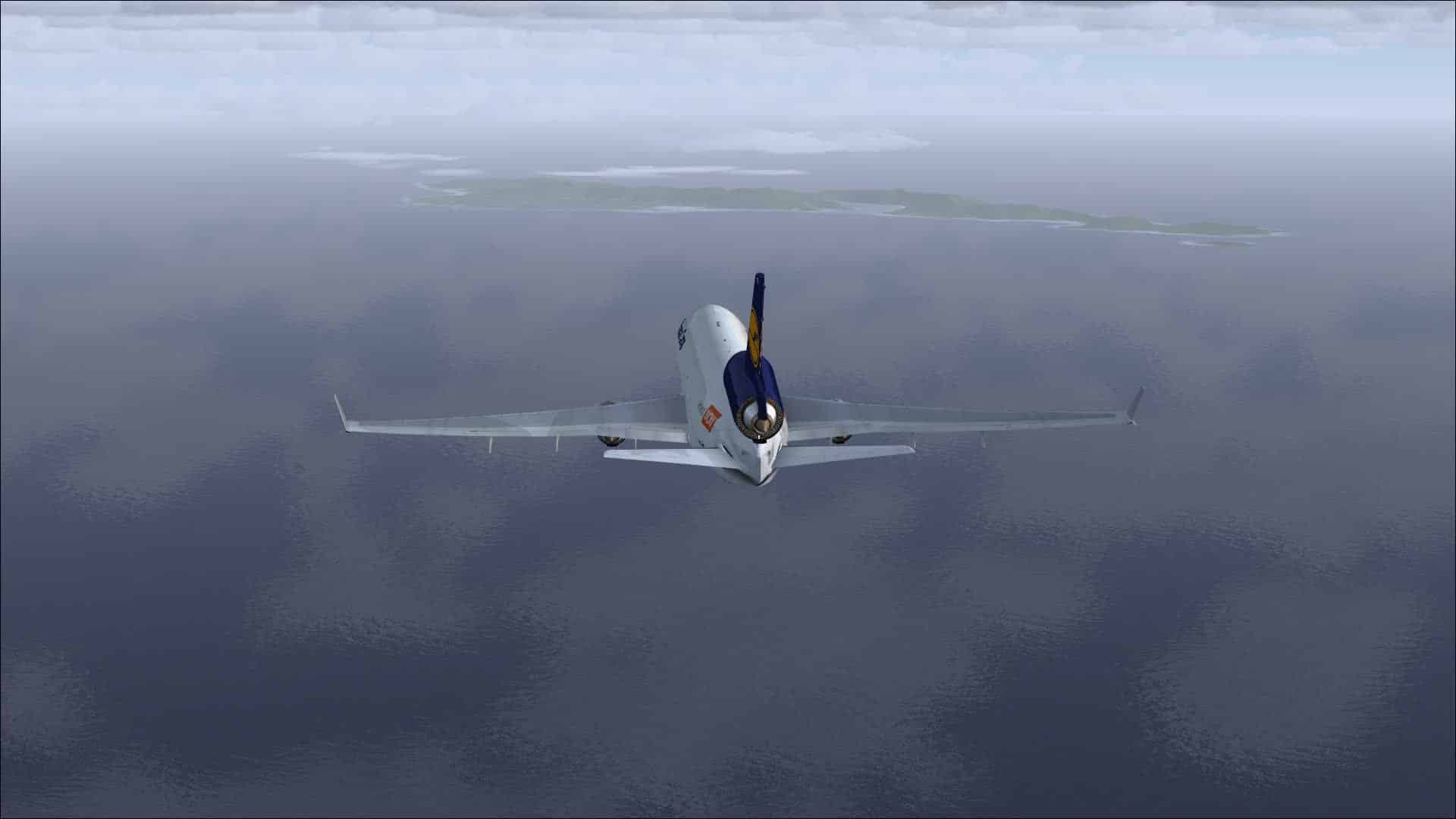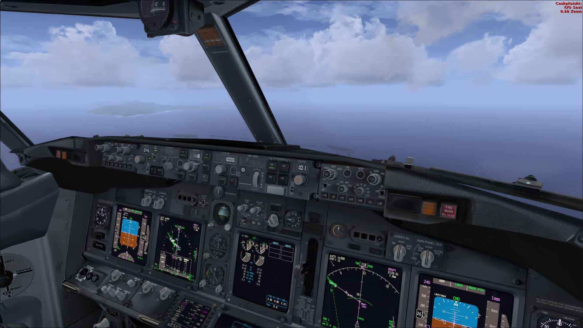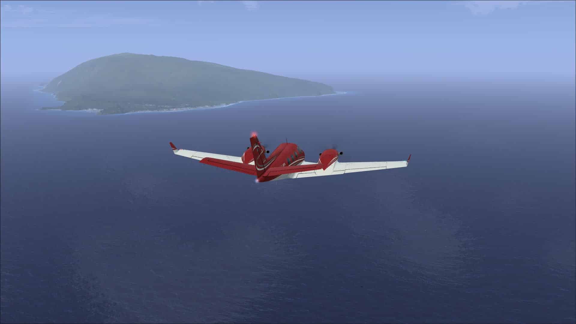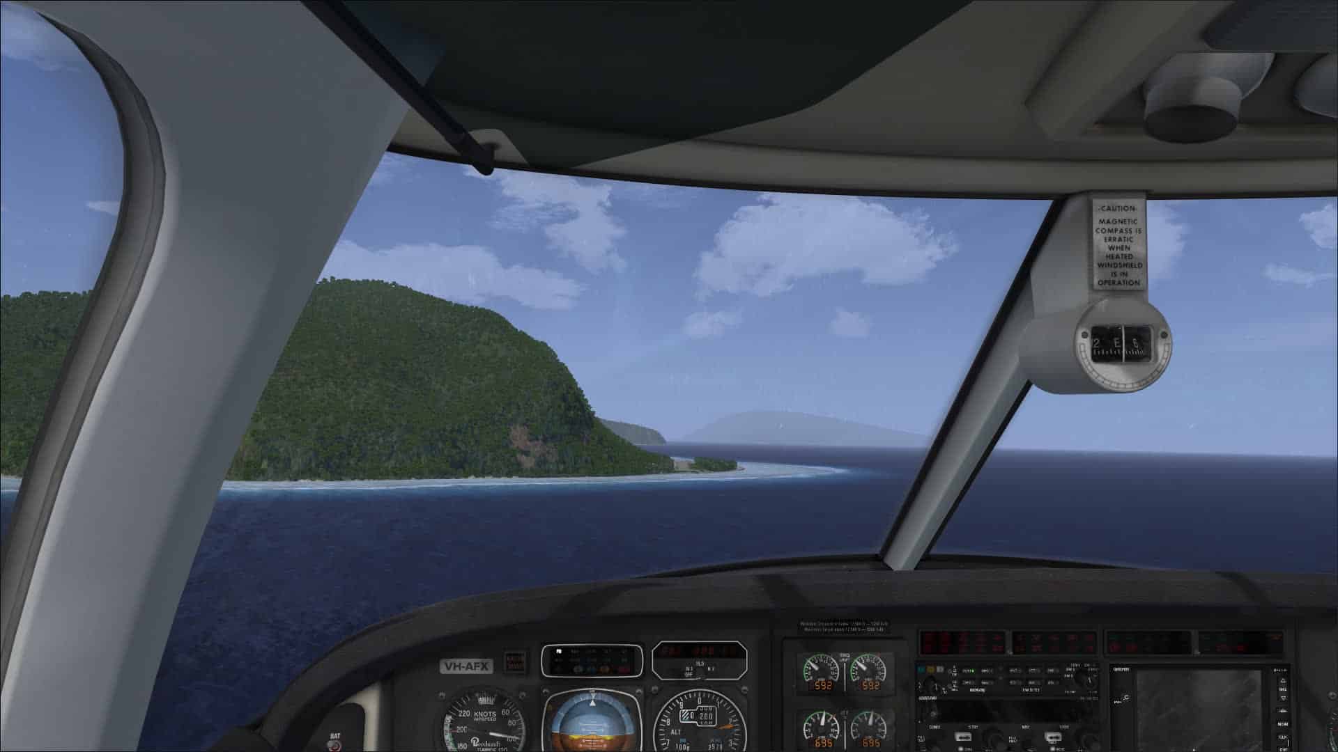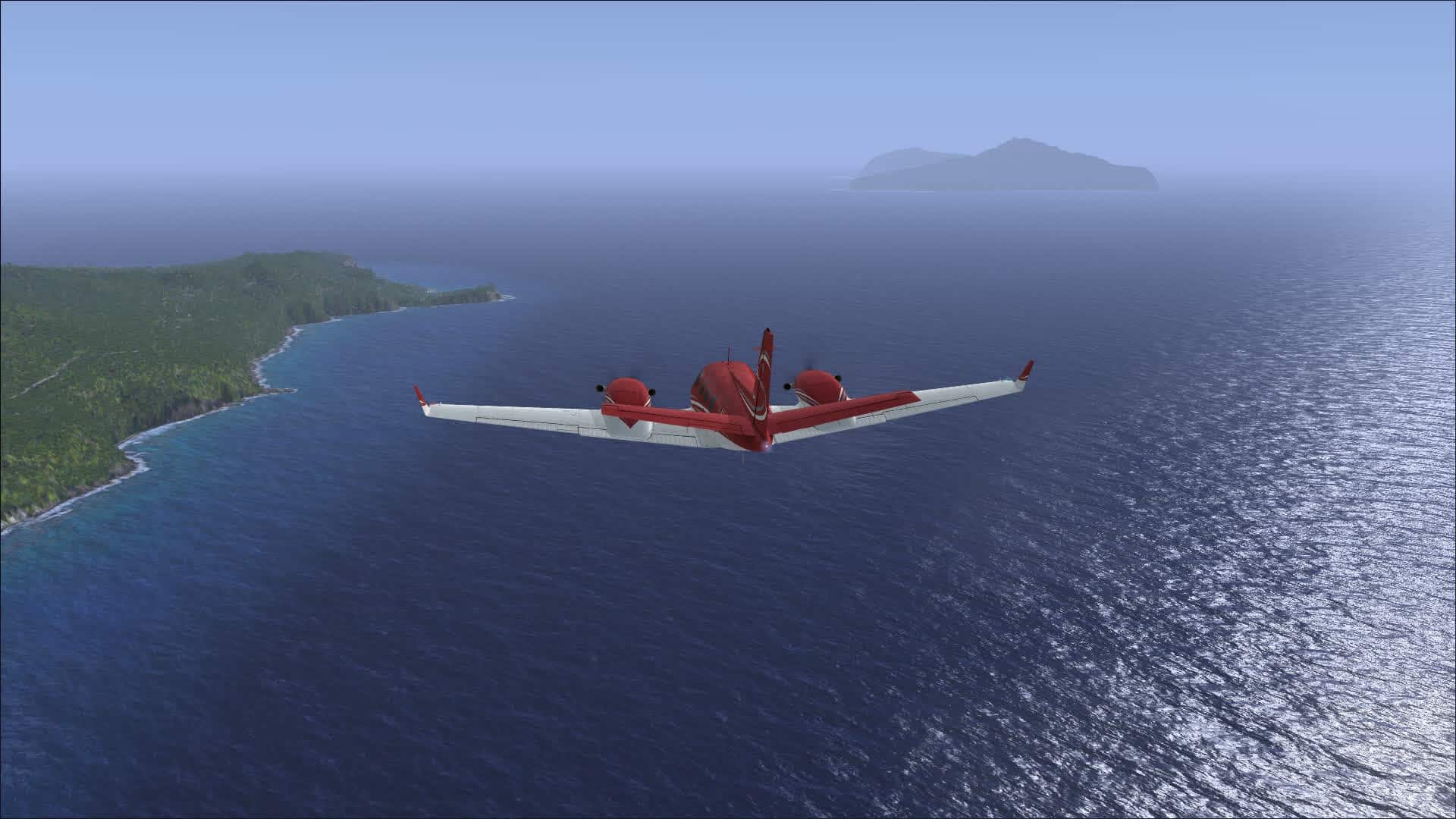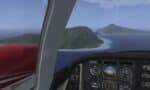 Nach Abflug geht es etwa in Richtung 80° weiter (genaueres weiß das FSX-Default-GPS), und hinter uns wird die Hauptinsel schnell kleiner, während unter und vor uns nicht viel passiert. Das von der Szenerie abgedeckte Gebiet besteht nämlich zum großen Teil aus Wasser. Notiz an mich: ich brauche mehr Schiffsverkehr. Bis dahin macht der Autopilot die Arbeit, und es geht nur darum, die Geschwindigkeit nahe an 200 Knoten zu halten.