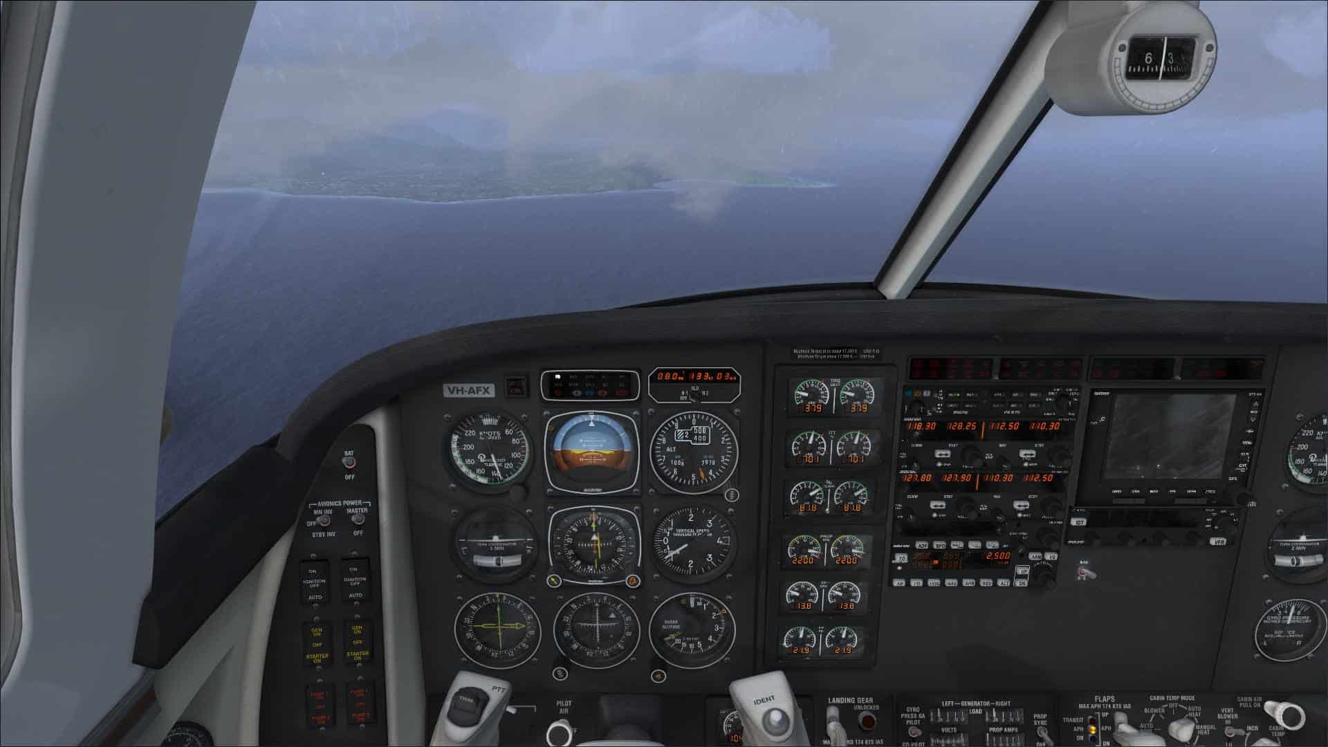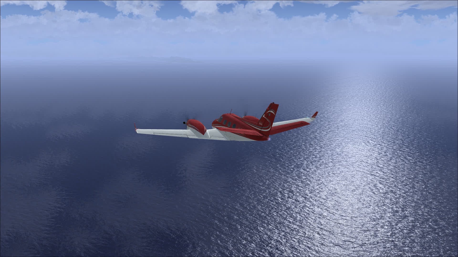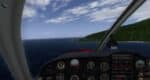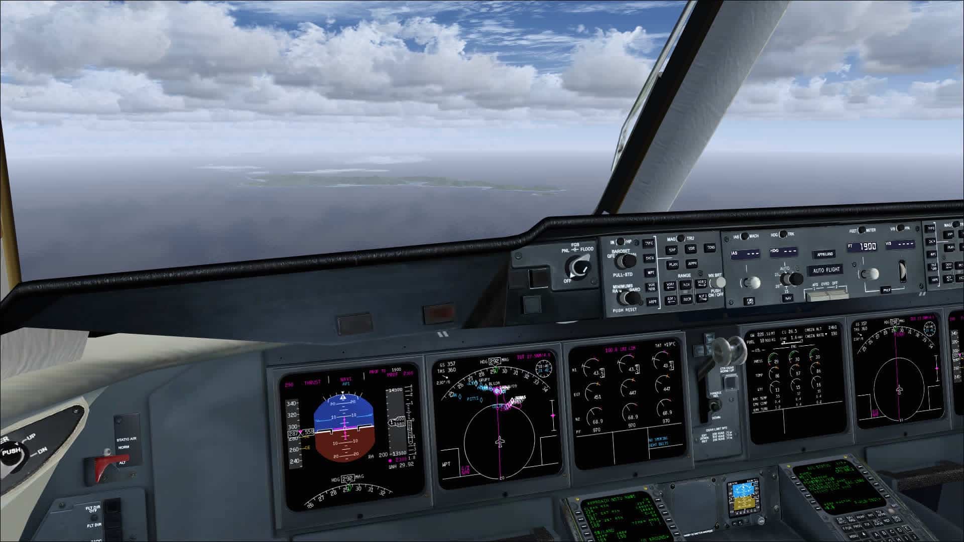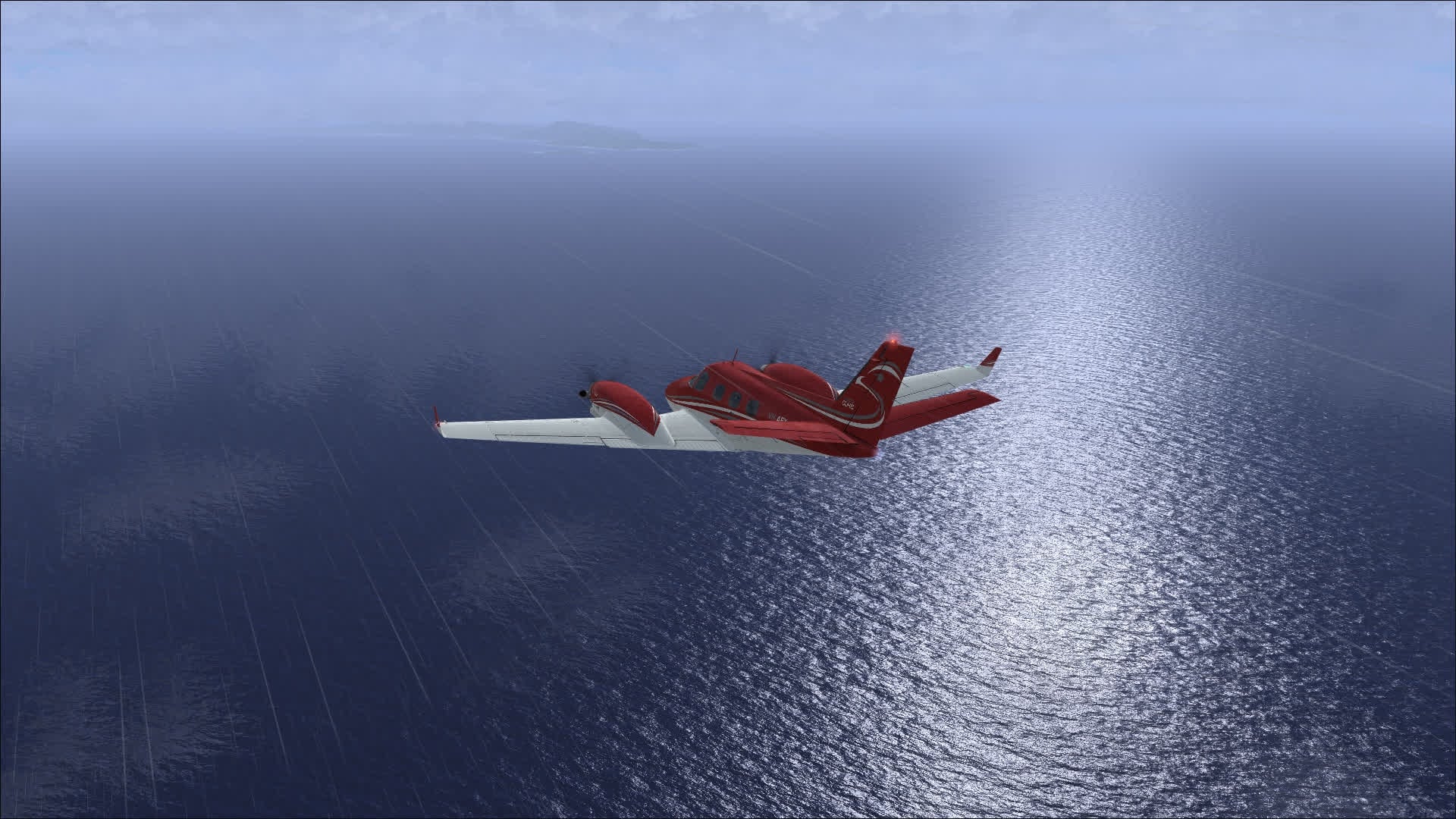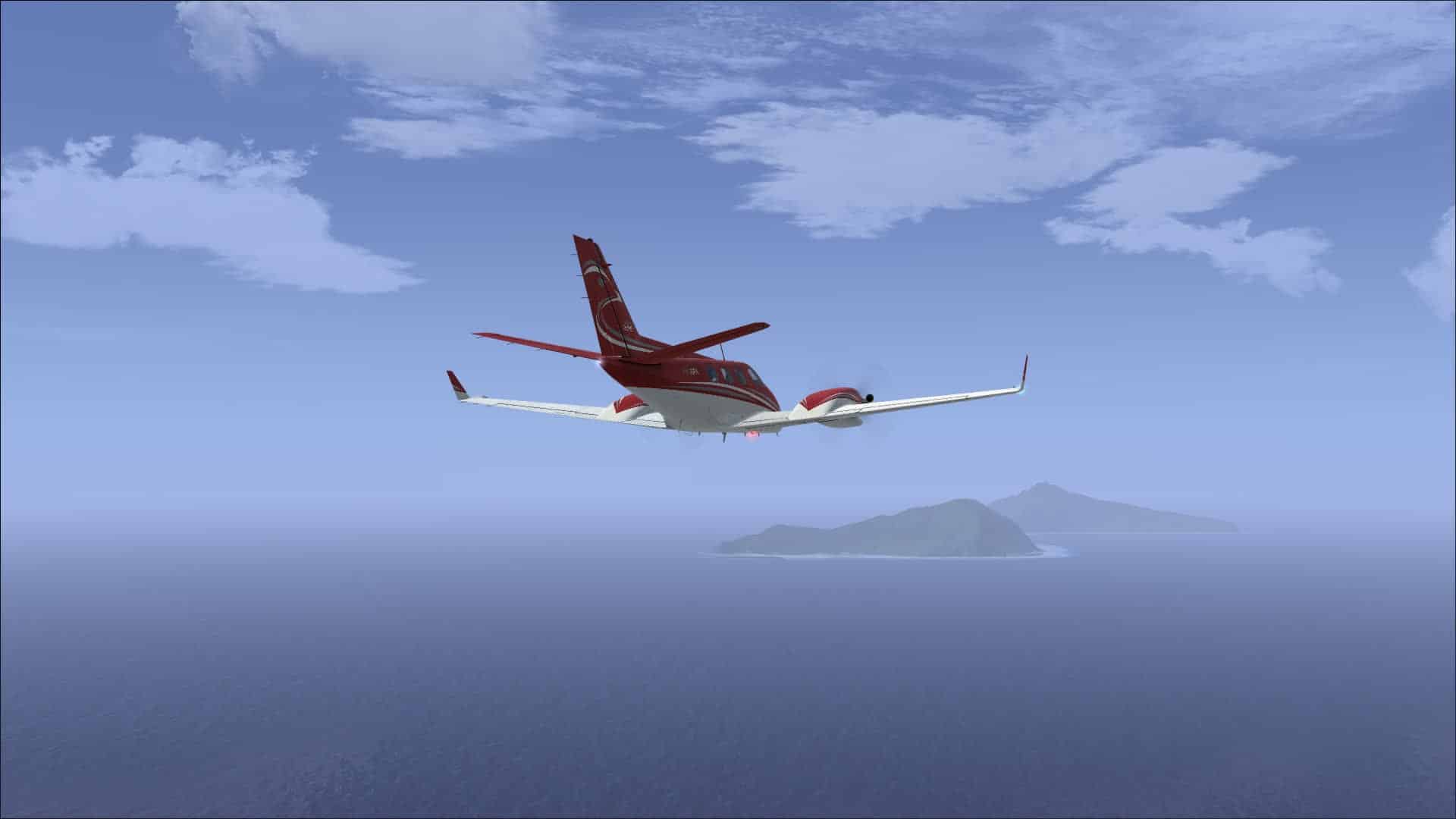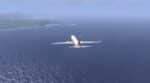 Nach Abflug geht es etwa in Richtung 80° weiter (genaueres weiß das FSX-Default-GPS), und hinter uns wird die Hauptinsel schnell kleiner, während unter und vor uns nicht viel passiert. Das von der Szenerie abgedeckte Gebiet besteht nämlich zum großen Teil aus Wasser. Notiz an mich: ich brauche mehr Schiffsverkehr. Bis dahin macht der Autopilot die Arbeit, und es geht nur darum, die Geschwindigkeit nahe an 200 Knoten zu halten.