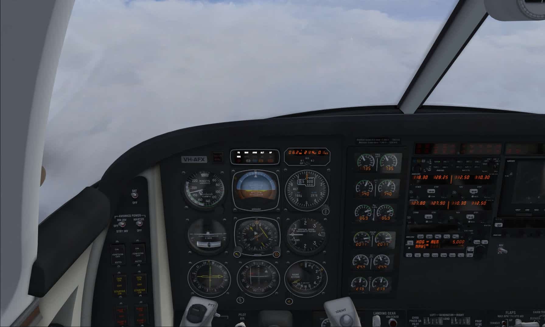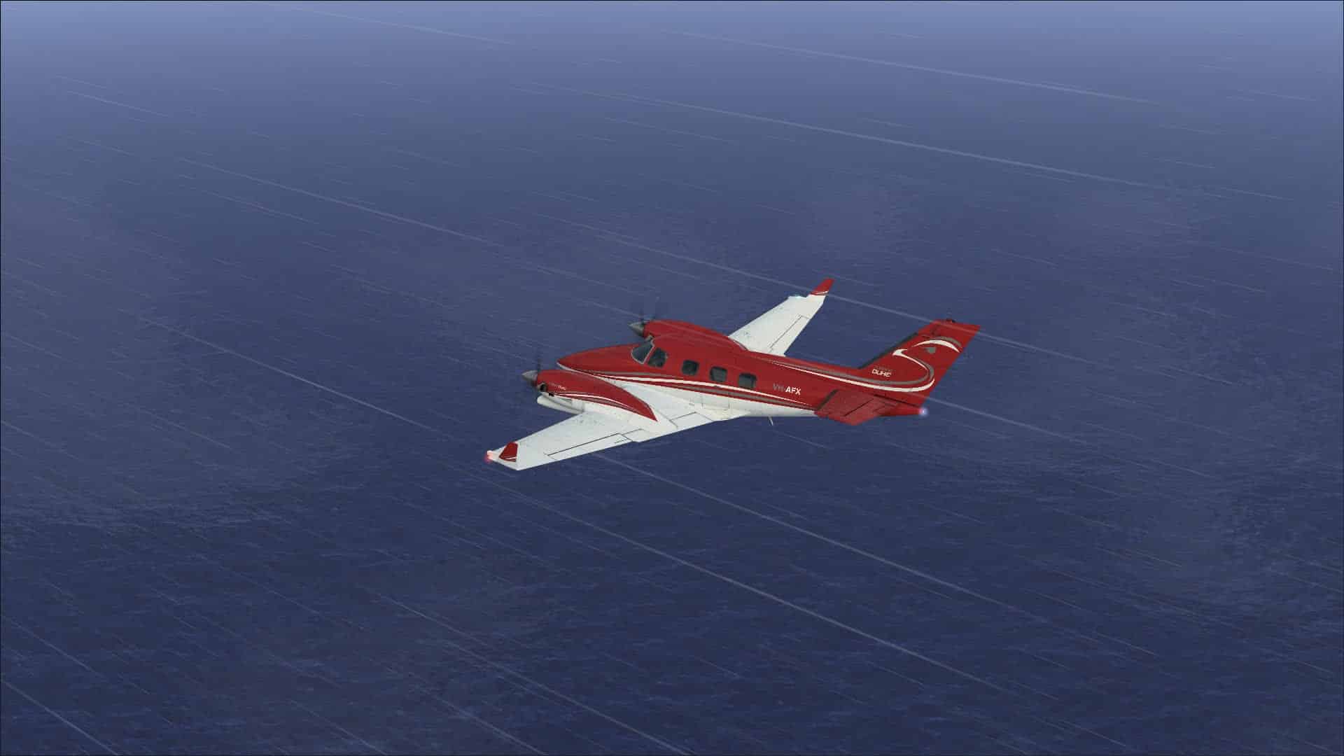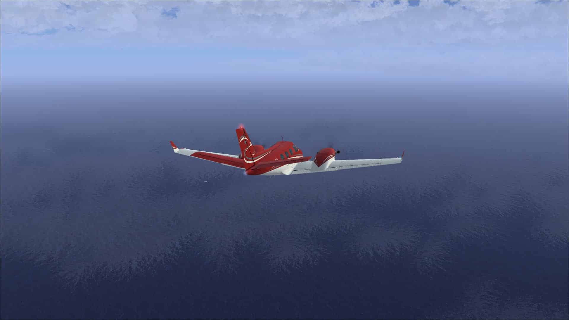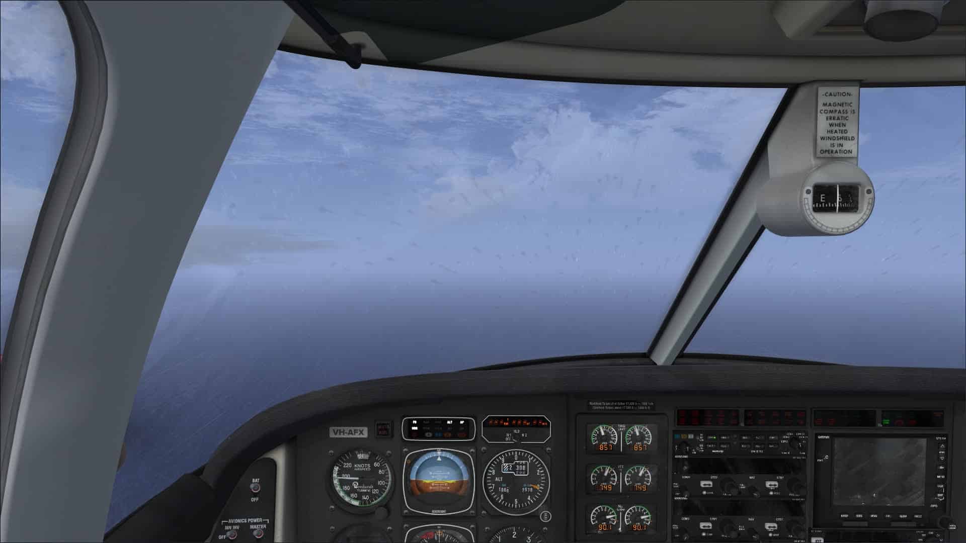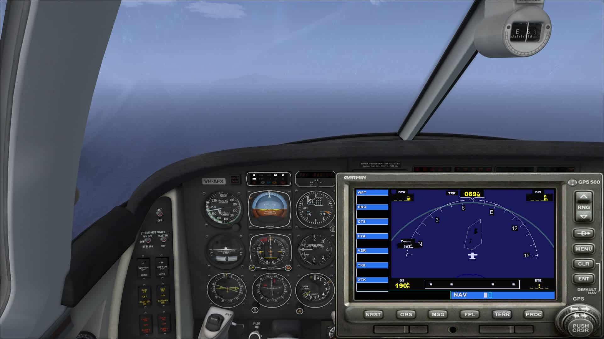 Nach Abflug geht es etwa in Richtung 80° weiter (genaueres weiß das FSX-Default-GPS), und hinter uns wird die Hauptinsel schnell kleiner, während unter und vor uns nicht viel passiert. Das von der Szenerie abgedeckte Gebiet besteht nämlich zum großen Teil aus Wasser. Notiz an mich: ich brauche mehr Schiffsverkehr. Bis dahin macht der Autopilot die Arbeit, und es geht nur darum, die Geschwindigkeit nahe an 200 Knoten zu halten.