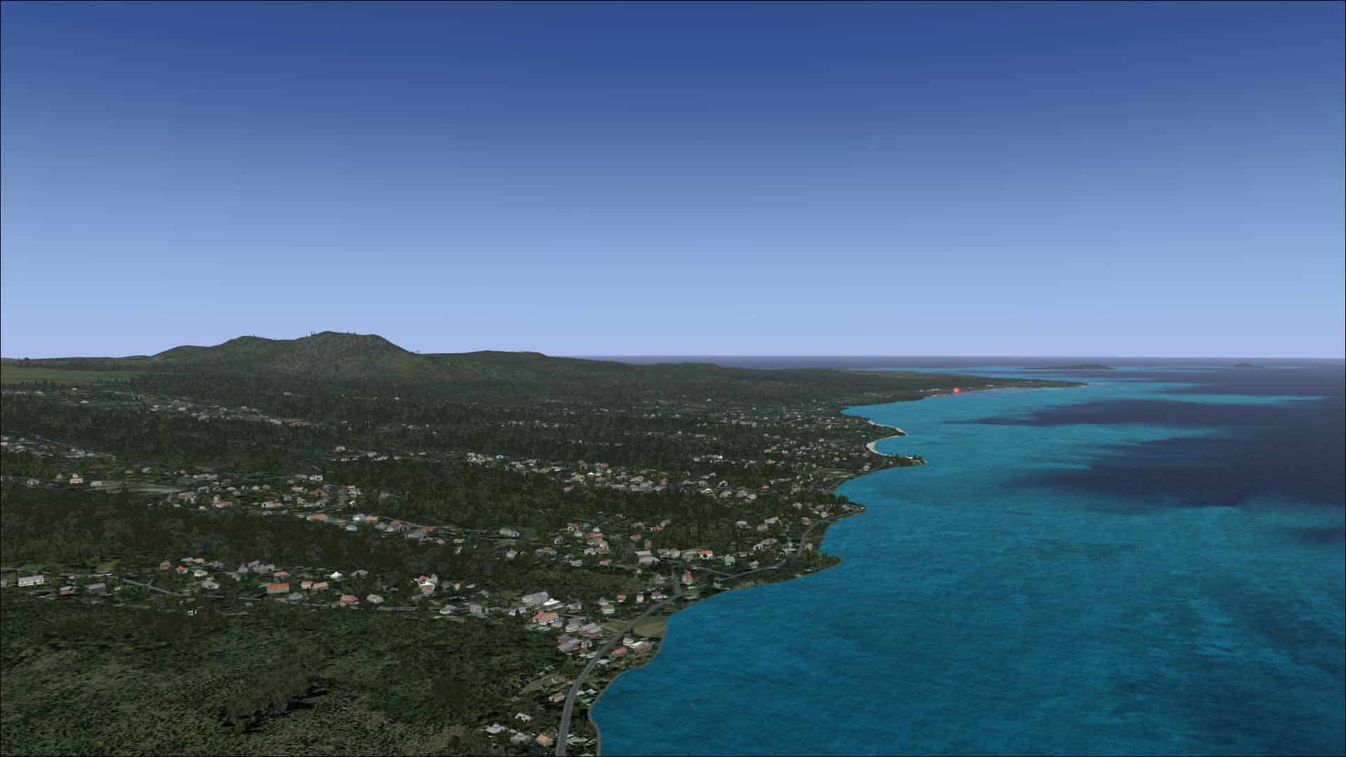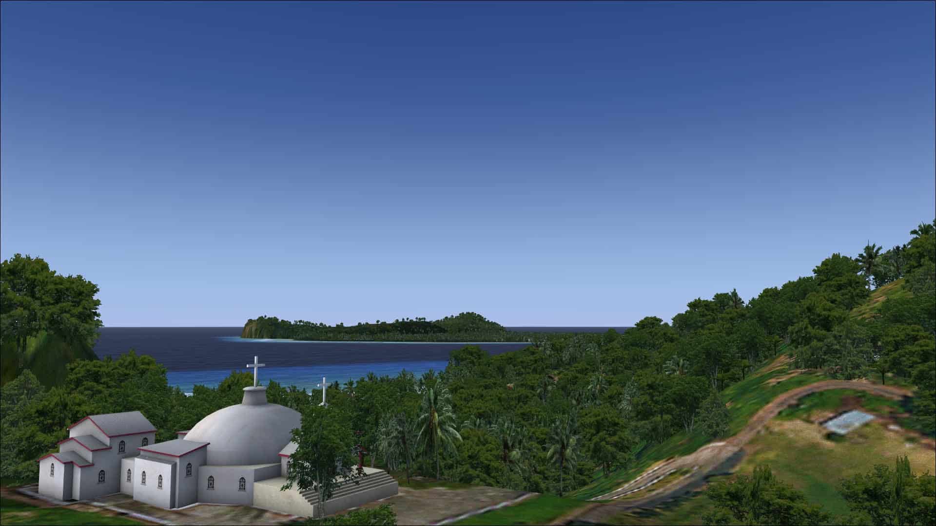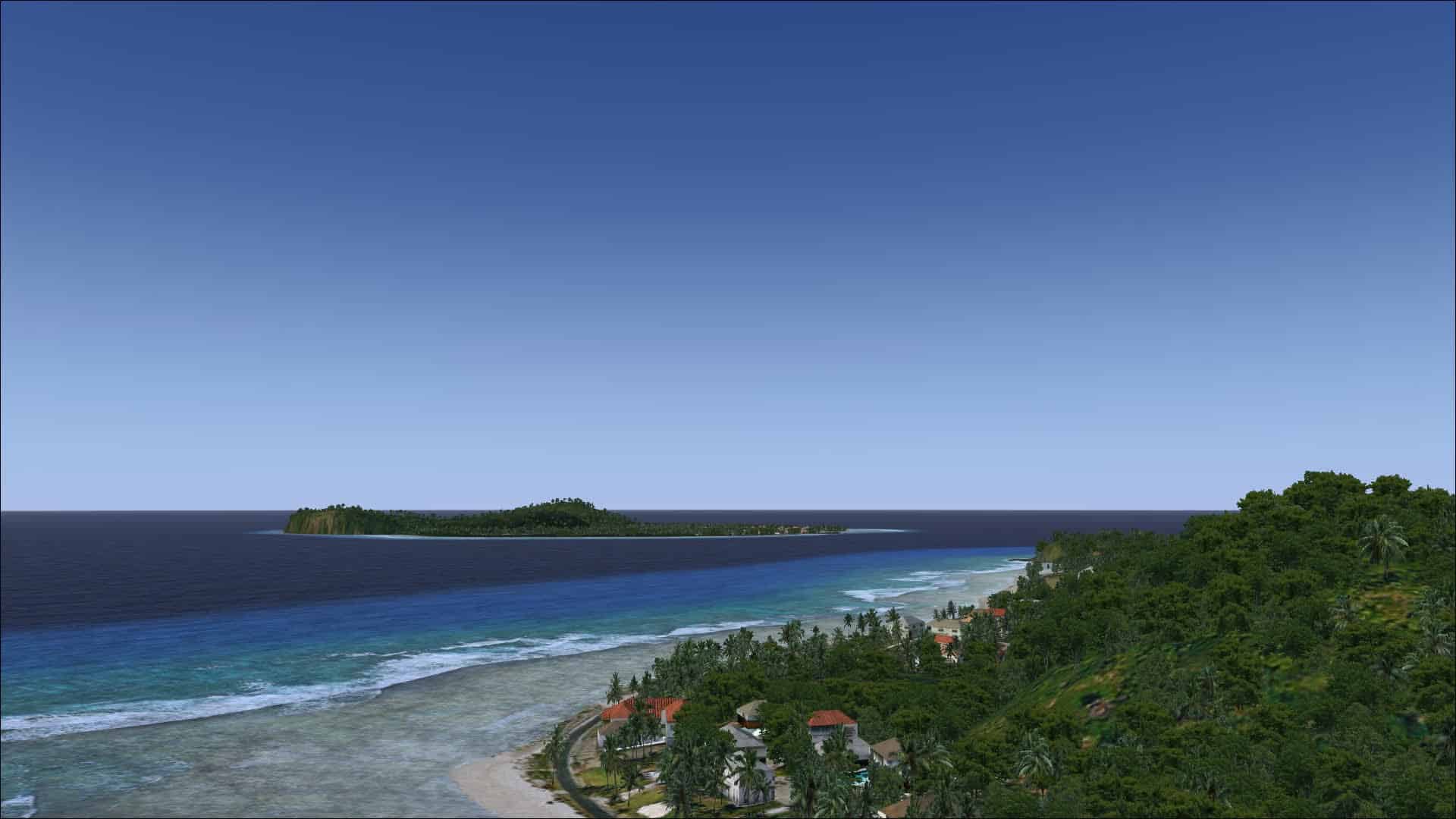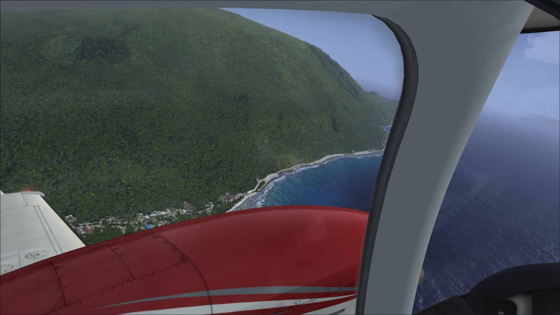 Nun, fällt die Landung hier also erstmal aus. Weiter um die Insel herum – auch hier gibt es nur kleine Siedlungen in Strandnähe. Da diese Aufnahmen aus dem FSX stammen, ist die Vegetation nicht so ausgeprägt. Wie es in Prepar3D aussieht, schauen wir uns nach der Rückkehr extra an.