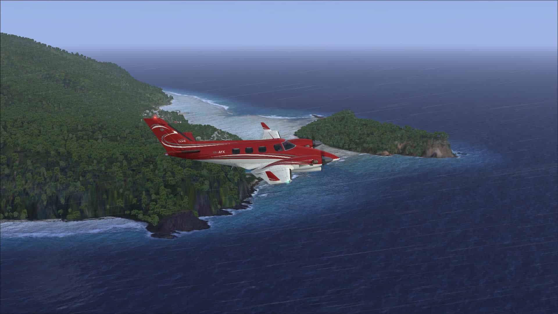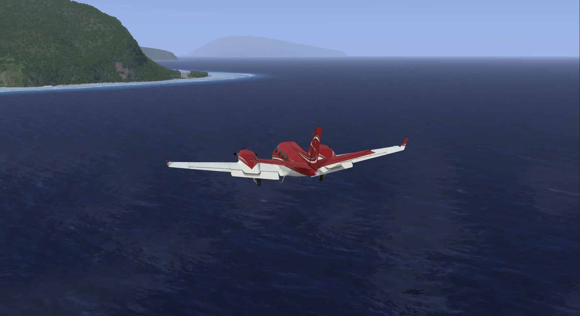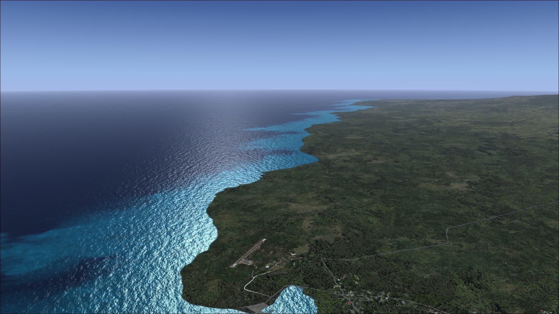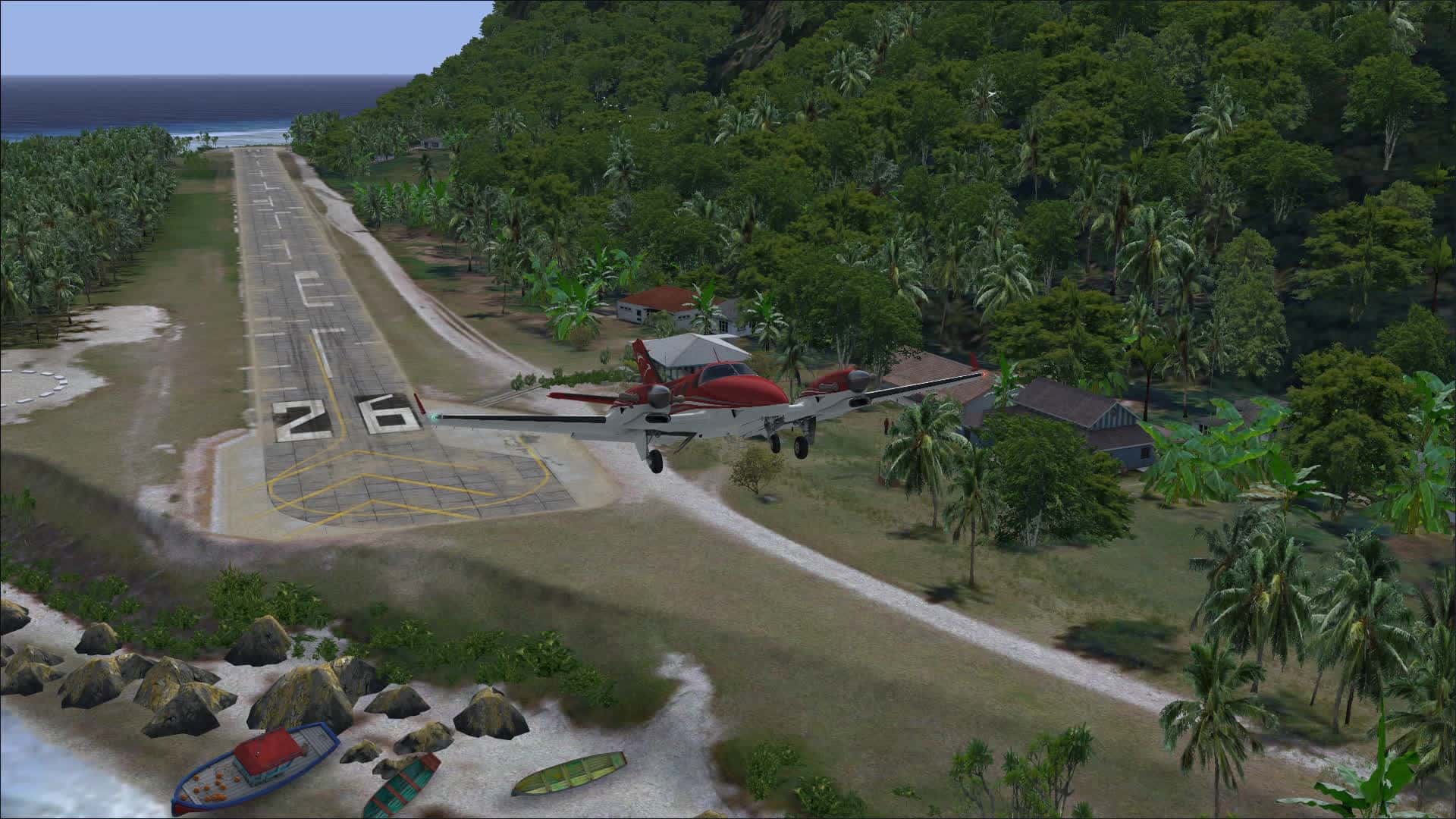 Nun, fällt die Landung hier also erstmal aus. Weiter um die Insel herum – auch hier gibt es nur kleine Siedlungen in Strandnähe. Da diese Aufnahmen aus dem FSX stammen, ist die Vegetation nicht so ausgeprägt. Wie es in Prepar3D aussieht, schauen wir uns nach der Rückkehr extra an.