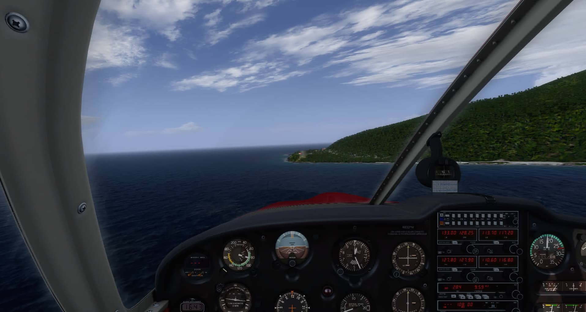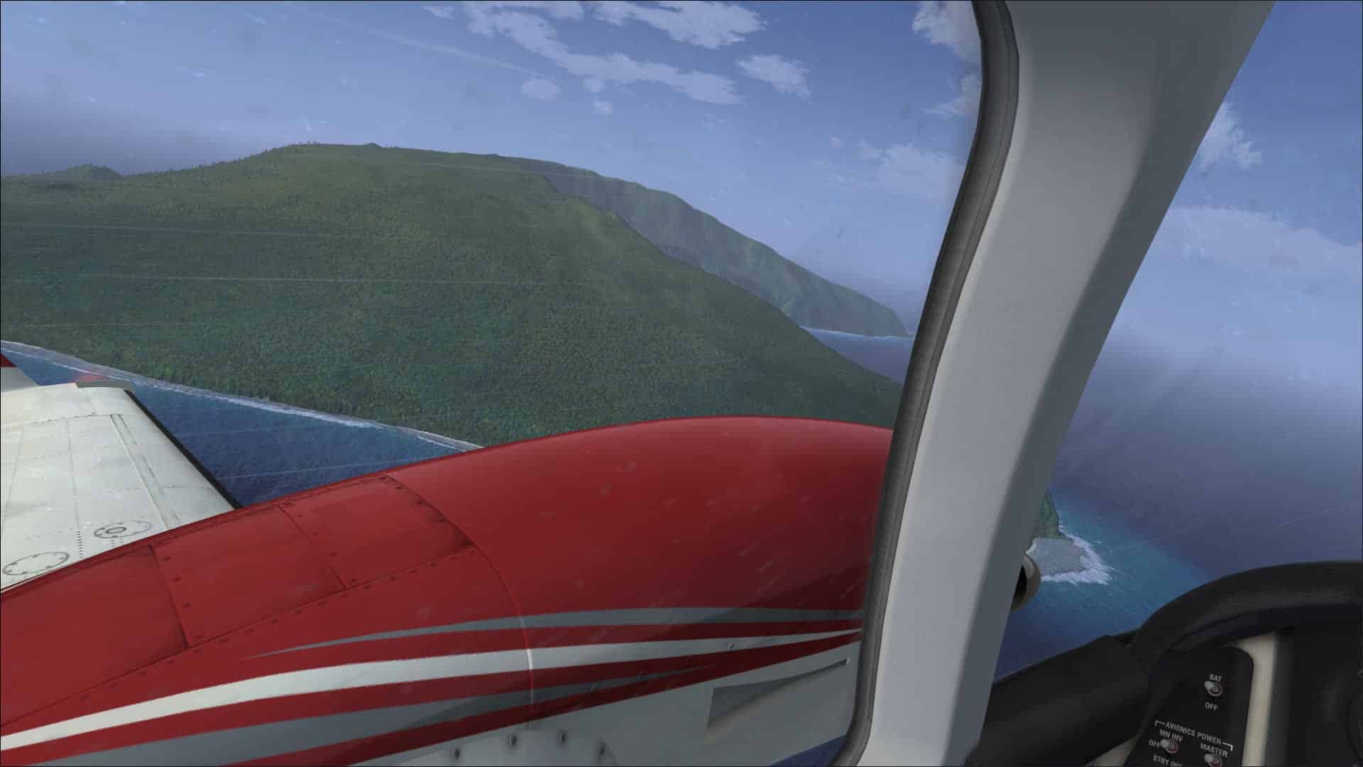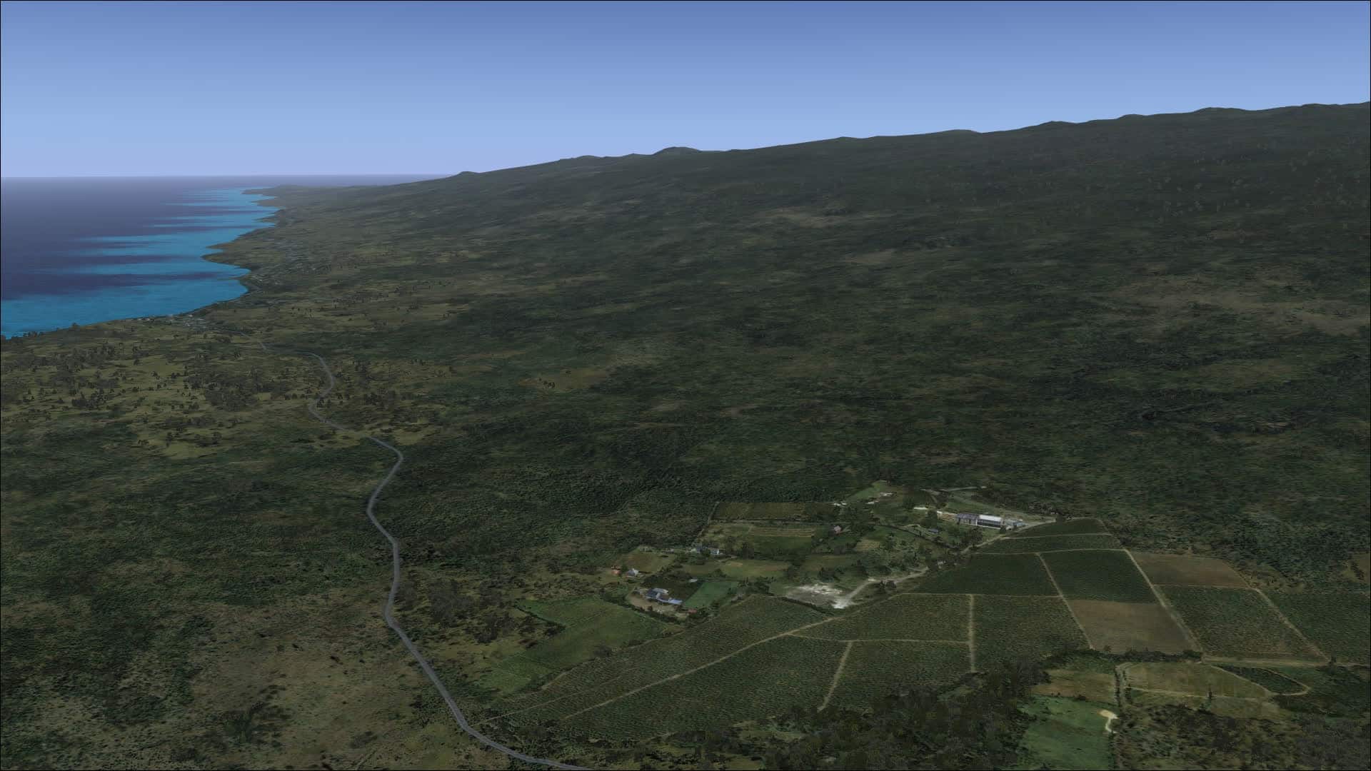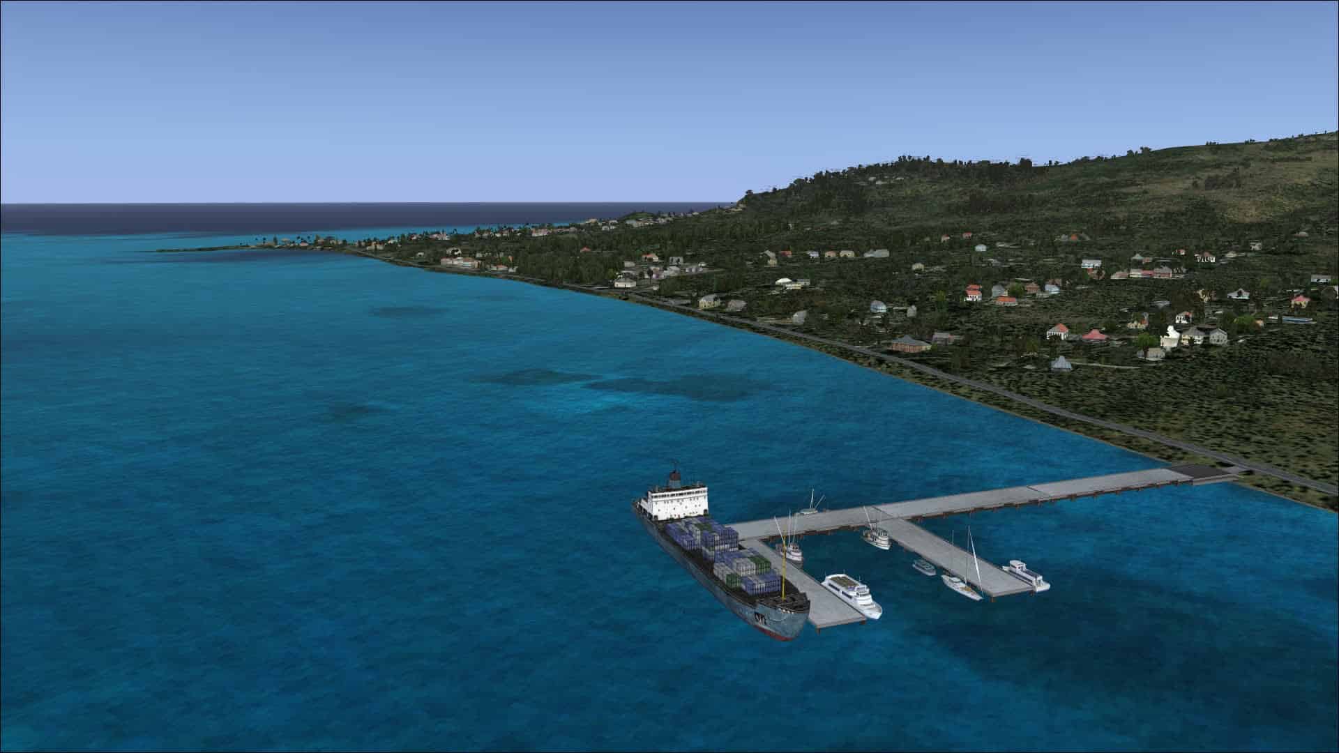Nun, fällt die Landung hier also erstmal aus. Weiter um die Insel herum – auch hier gibt es nur kleine Siedlungen in Strandnähe. Da diese Aufnahmen aus dem FSX stammen, ist die Vegetation nicht so ausgeprägt. Wie es in Prepar3D aussieht, schauen wir uns nach der Rückkehr extra an.