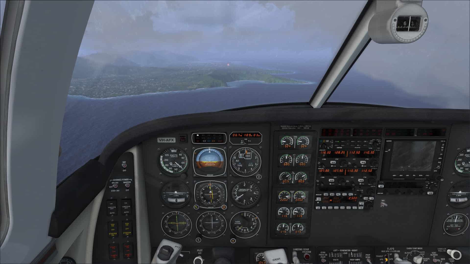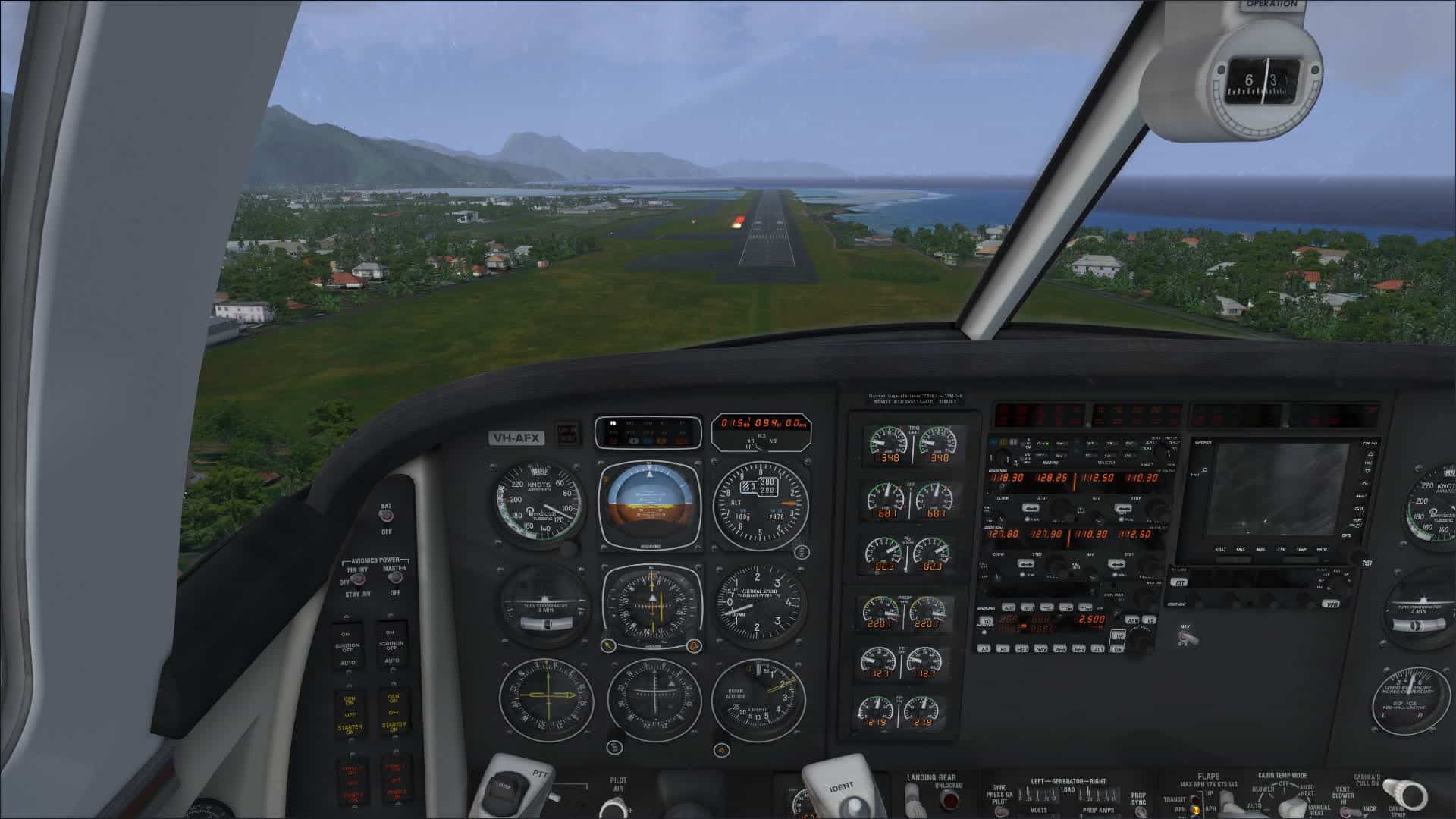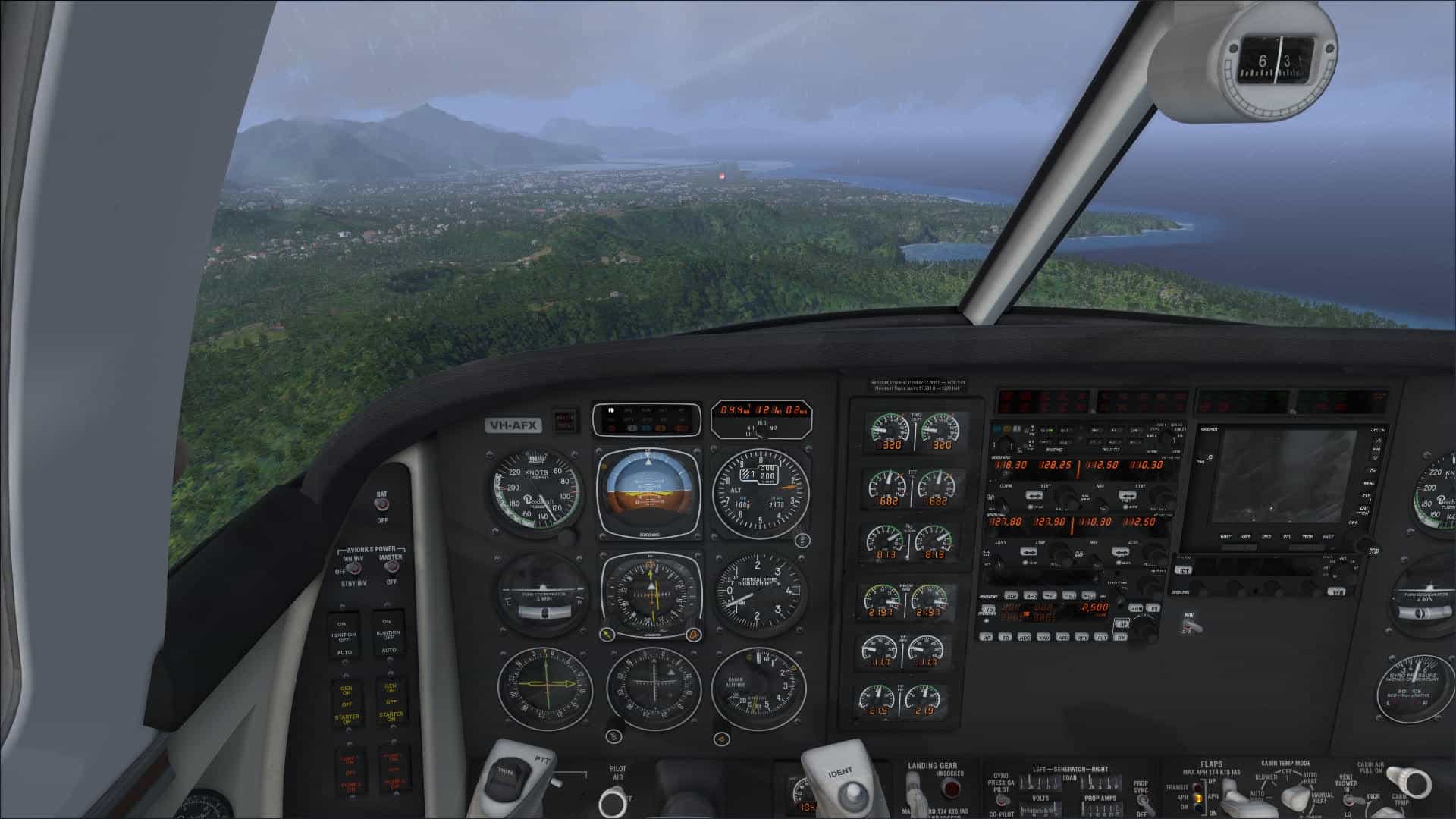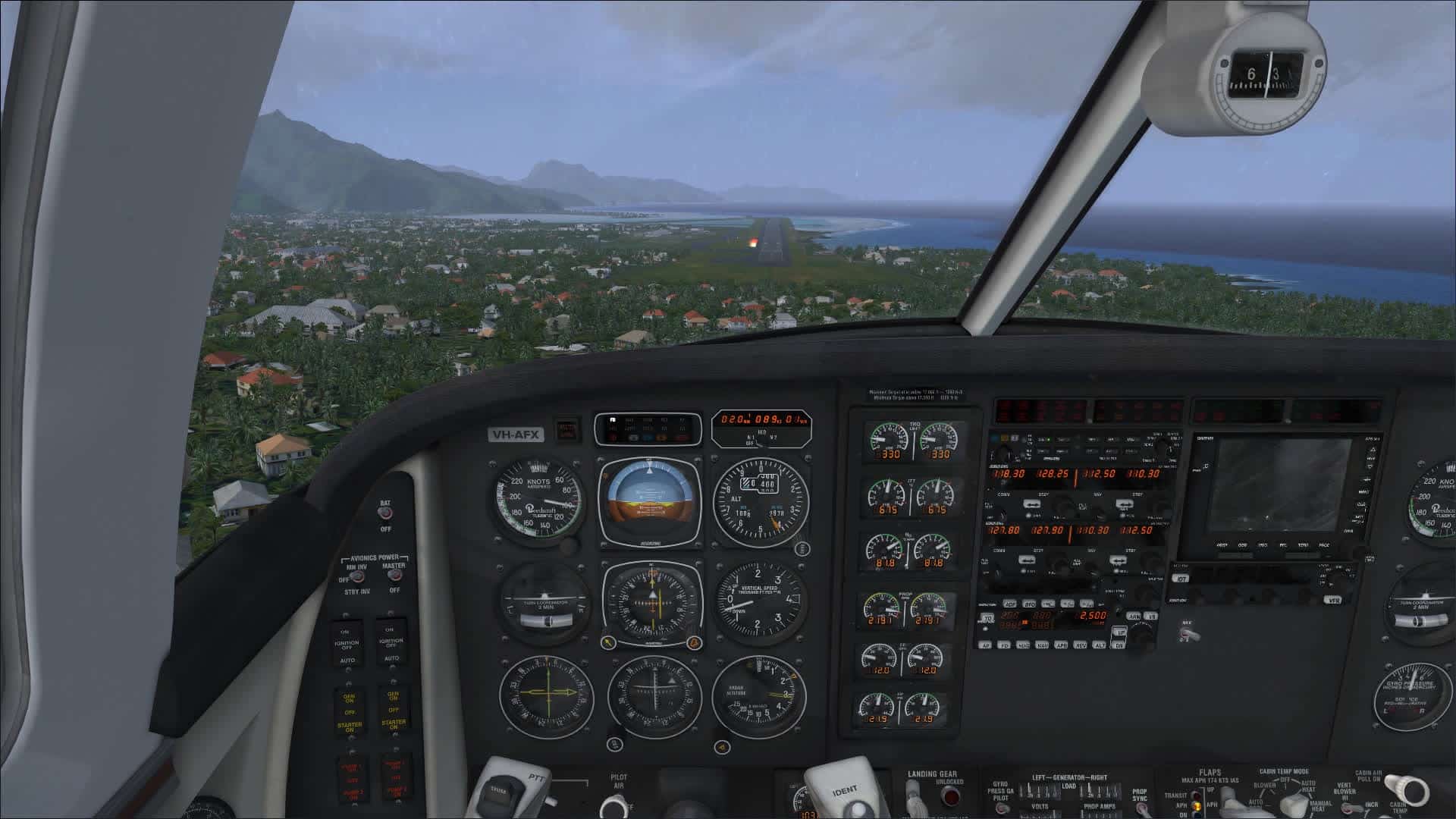 Über Tutuila haben sich mittlerweile ein paar Wolken gesammelt. Kein Problem, dann können wir mit der Duke mal den ILS-Anflug auf die 05 ausprobieren: Anflug direkt über Pago Pago, dann auf back course weiter, procedure turn nach etwa 13 Meilen und dann Endanflug auf die Landebahn 05. Das dauert leider etwas länger als eine Platzrunde.