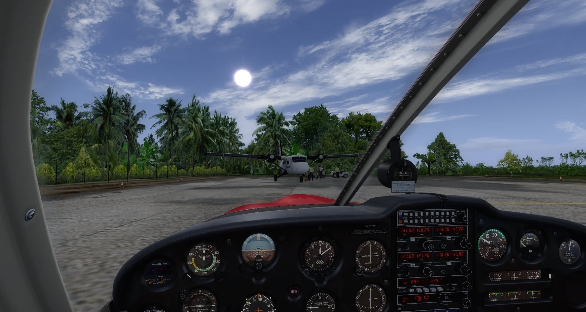 Mit etwas weniger Zeit für die Feierabendrunde bieten sich natürlich Platzrunden um die Inselflugplätze an. Ofu hatten wir uns schon angehen, nehmen wir doch jetzt mal eine Piper Cherokee und fliegen auf Tau, der Nachbarinsel. Der Flugplatz hier ist ein wenig belebter, gerade wird eine Twin Otter vermutlich für den Flug nach Tutuila (Pago Pago) beladen.