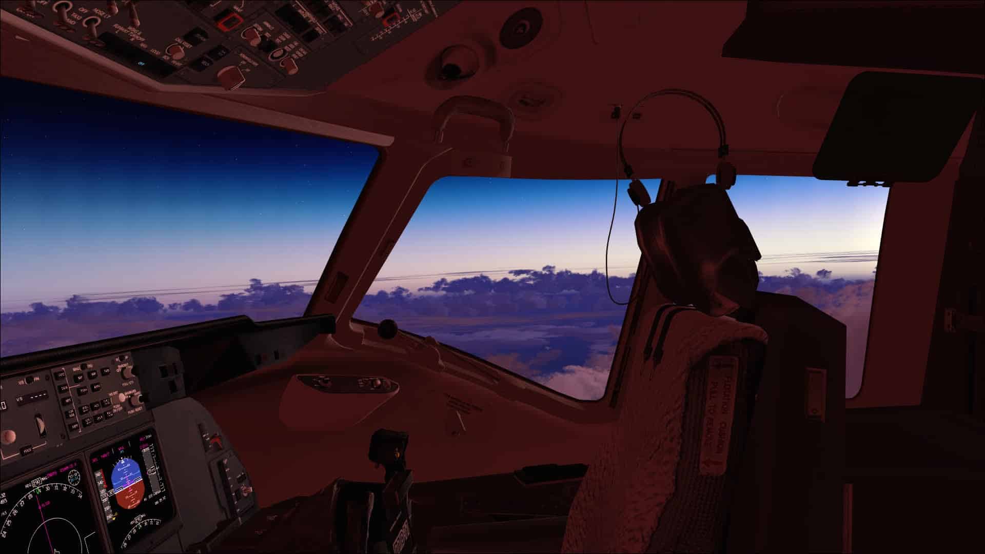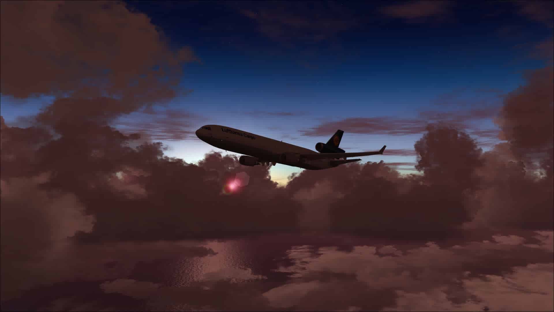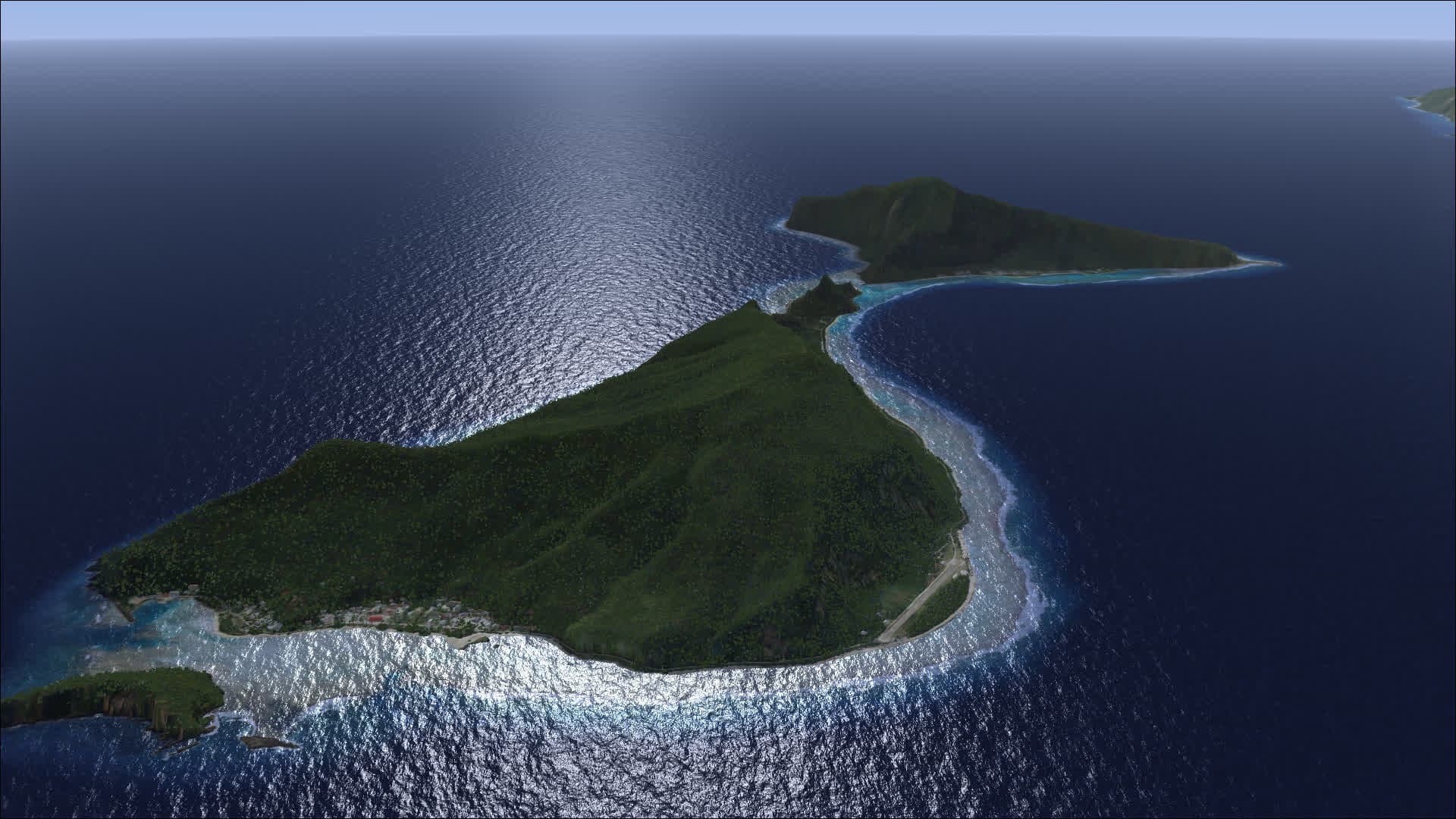 Über Rarotonga geht beim Start gerade die Sonne auf. Nach etwa 20 Minuten haben wir die Reiseflughöhe erreicht – Zeit, die Zeitbeschleunigung zu aktivieren, damit wir nicht eine Stunde am Stück auf den Pazifik schauen müssen. Das funktioniert bei der MD-11 auf geraden Strecken ganz gut. Und nach kurzer Zeit sind auch schon die drei Inseln Ofu, Olosega und Tau in Sicht – das Szeneriegebiet von Orbx Pago Pago ist erreicht.