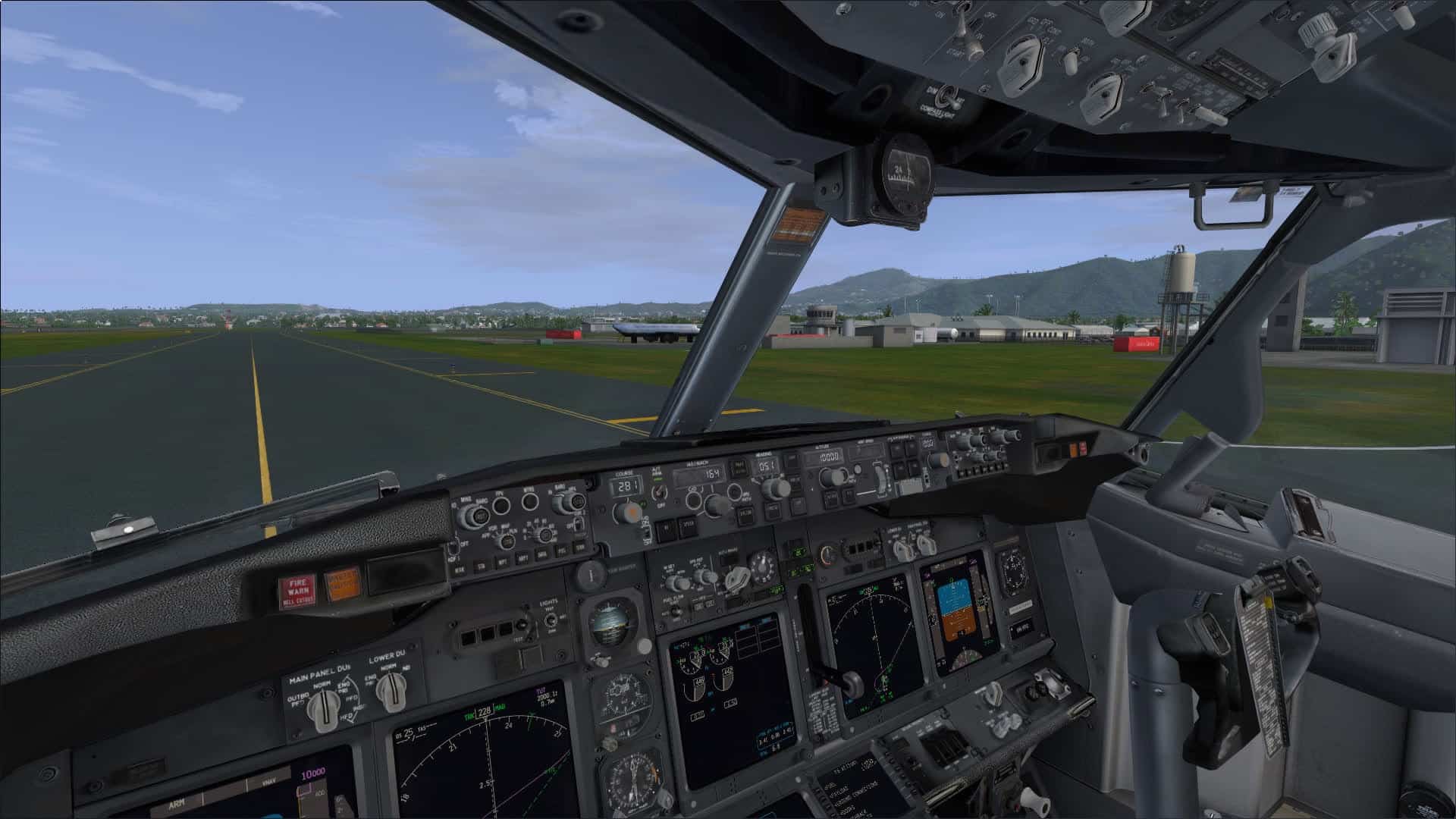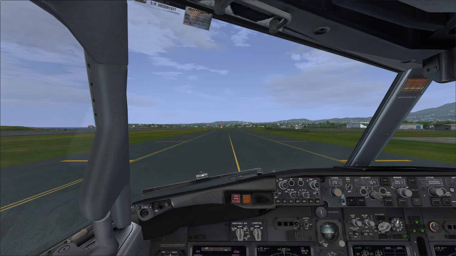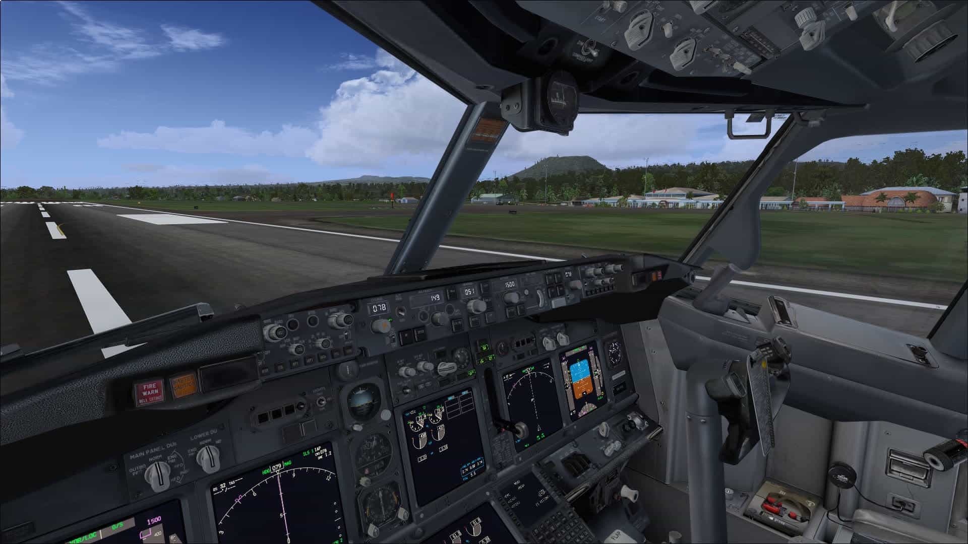 Nach kurzer Wartezeit geht es nun wieder zurück nach Pago Pago. Die Route ist schnell eingegeben, und diesmal fliegt der Erste Offizier. Da es hier keinen parallelen Taxiway gibt, müssen wir die gesamte Bahn zurückrollen und dann drehen. Beim Abflug noch ein paar Blicke auf Upolu, und ab gehts wieder über 80 Kilometer Wasser.