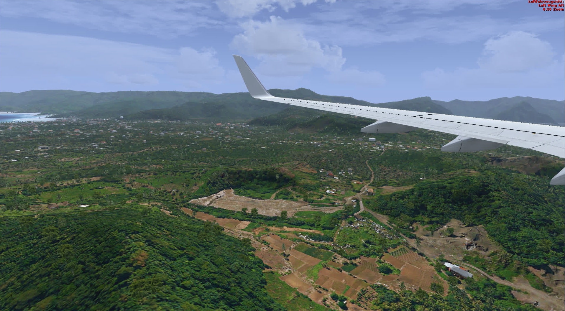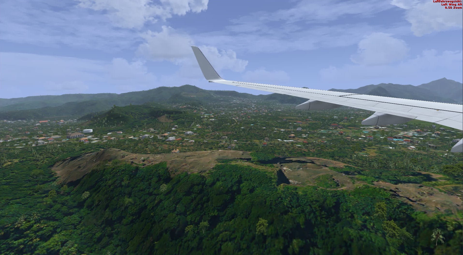 Die Modellierung der Insel entspricht in etwa einer Orbx-Region. Es gibt aus 10.000 Fuß nicht allzuviel zu sehen: Upolu ist vergleichsweise flach, und der Gegenanflug führt uns über die weniger besiedelte Südseite. Nach zwei 90°-Turns geht es auf den Endanflug auf die Bahn 08.
