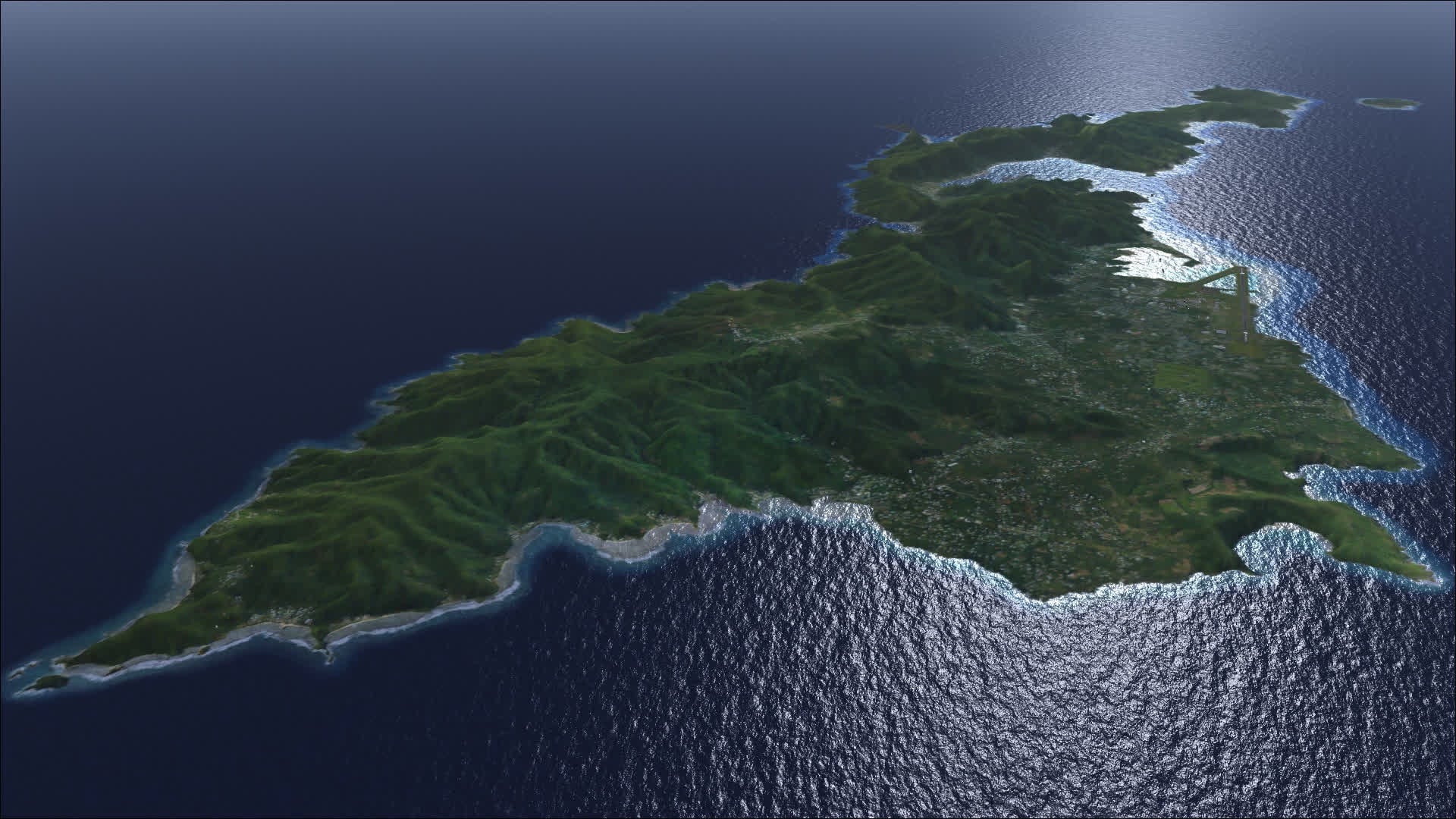 Tutuila ist in der Regel der erste Anlaufpunkt – hier ist der detaillierte Flughafen Pago Pago International, hier gibt es aber auch relativ viel Besiedlung, und daher auch relativ viele Custom-Gebäude (also nicht nur Autogen). Beachtenswert ist das Seil der Standseilbahn über dem Hafen. Tutuila ist wie alle Inseln von Amerikanisch-Samoa auf einem Luftbild mit Autogen aufgebaut.