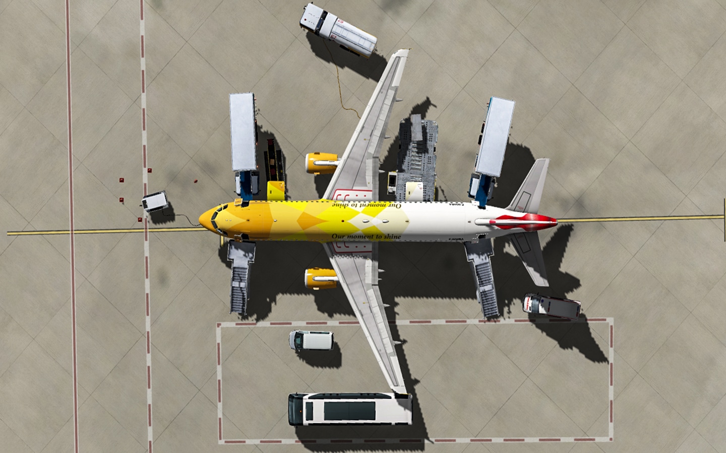 Mit diesen Tool kann man animierte Bodenfahrzeuge an ein Flugzeug anfahren lassen , die dann versuchen das Flugzeug zu beladen oder zu betanken.