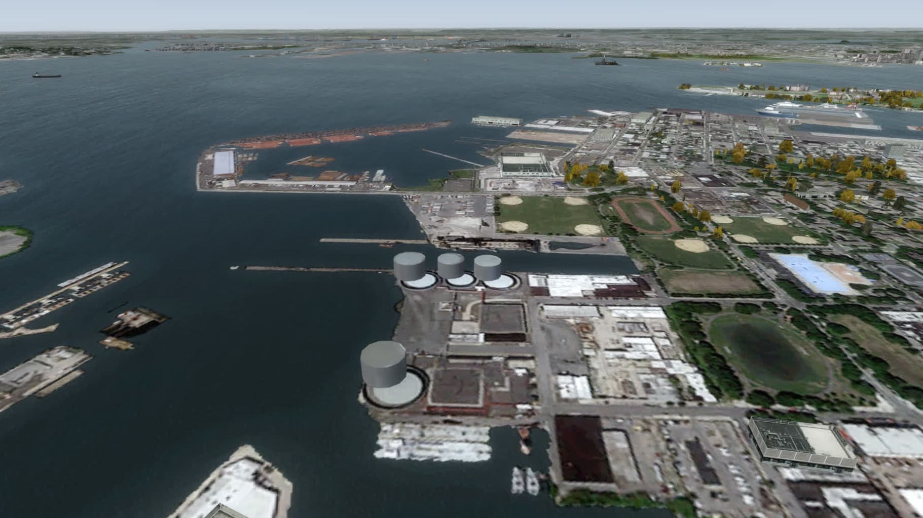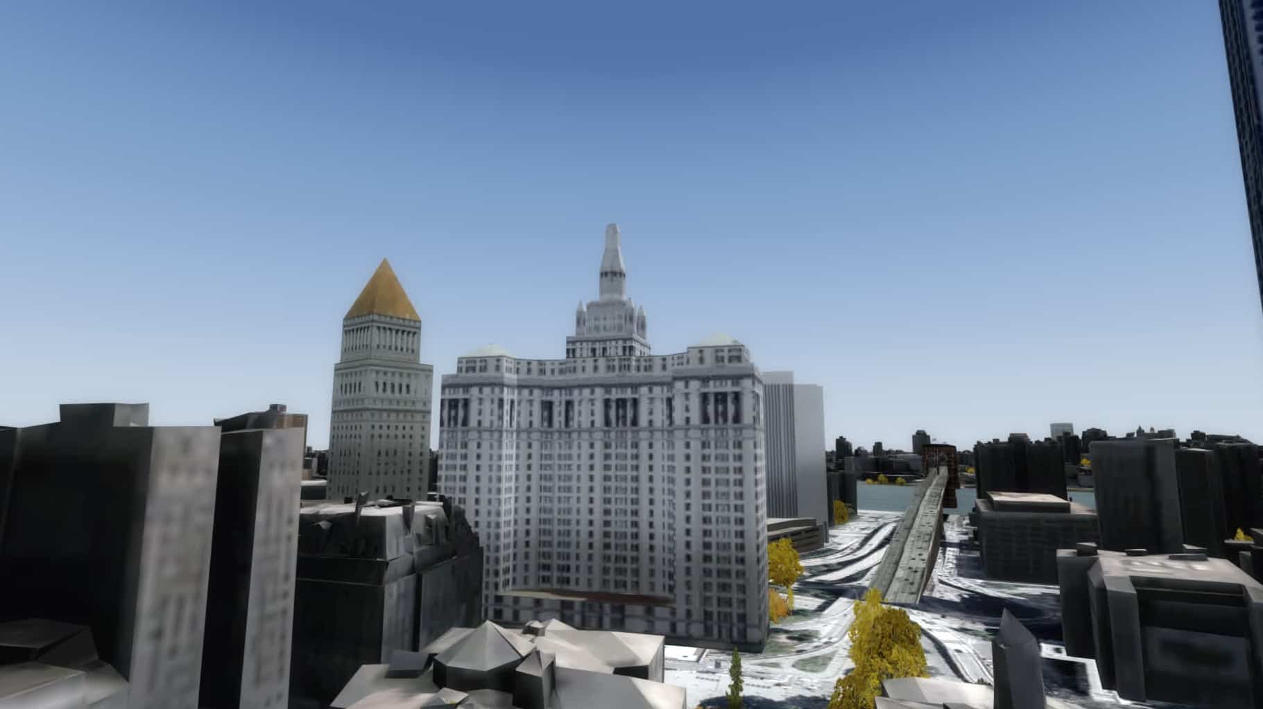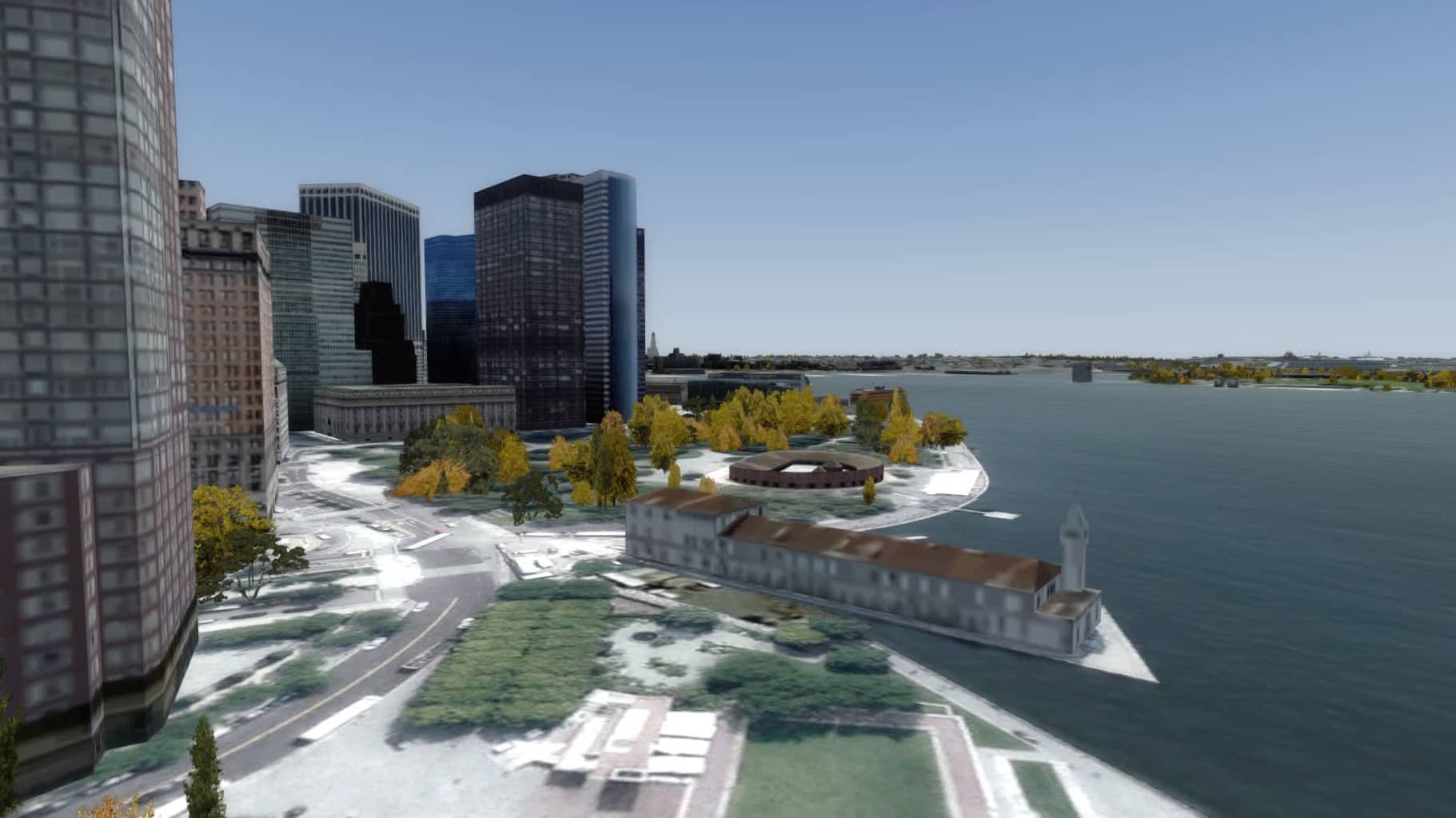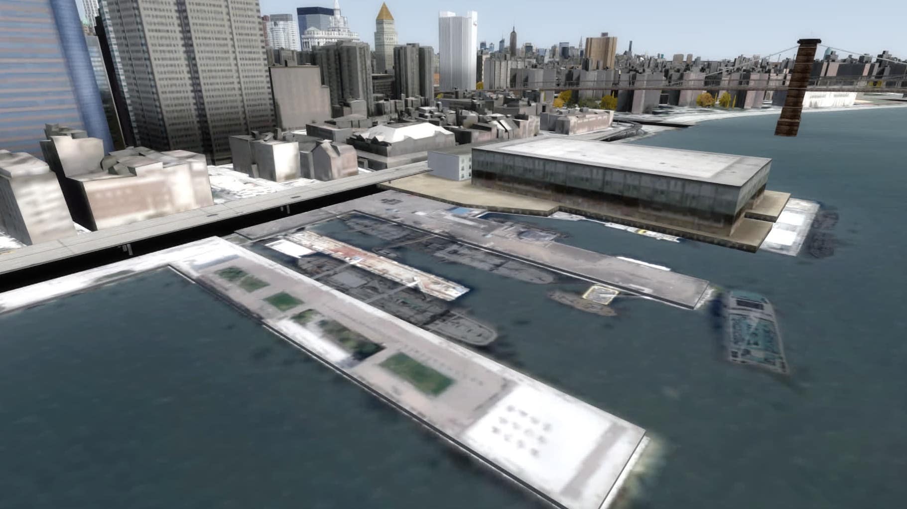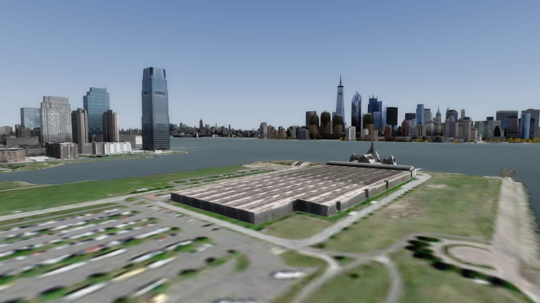 Ellis Island und die Reste des Bahnhofs. Zu Spaziergängen mit dem Avatar lädt diese Szenerie nicht ein, aber aus der Luft funktioniert das doch ganz gut.