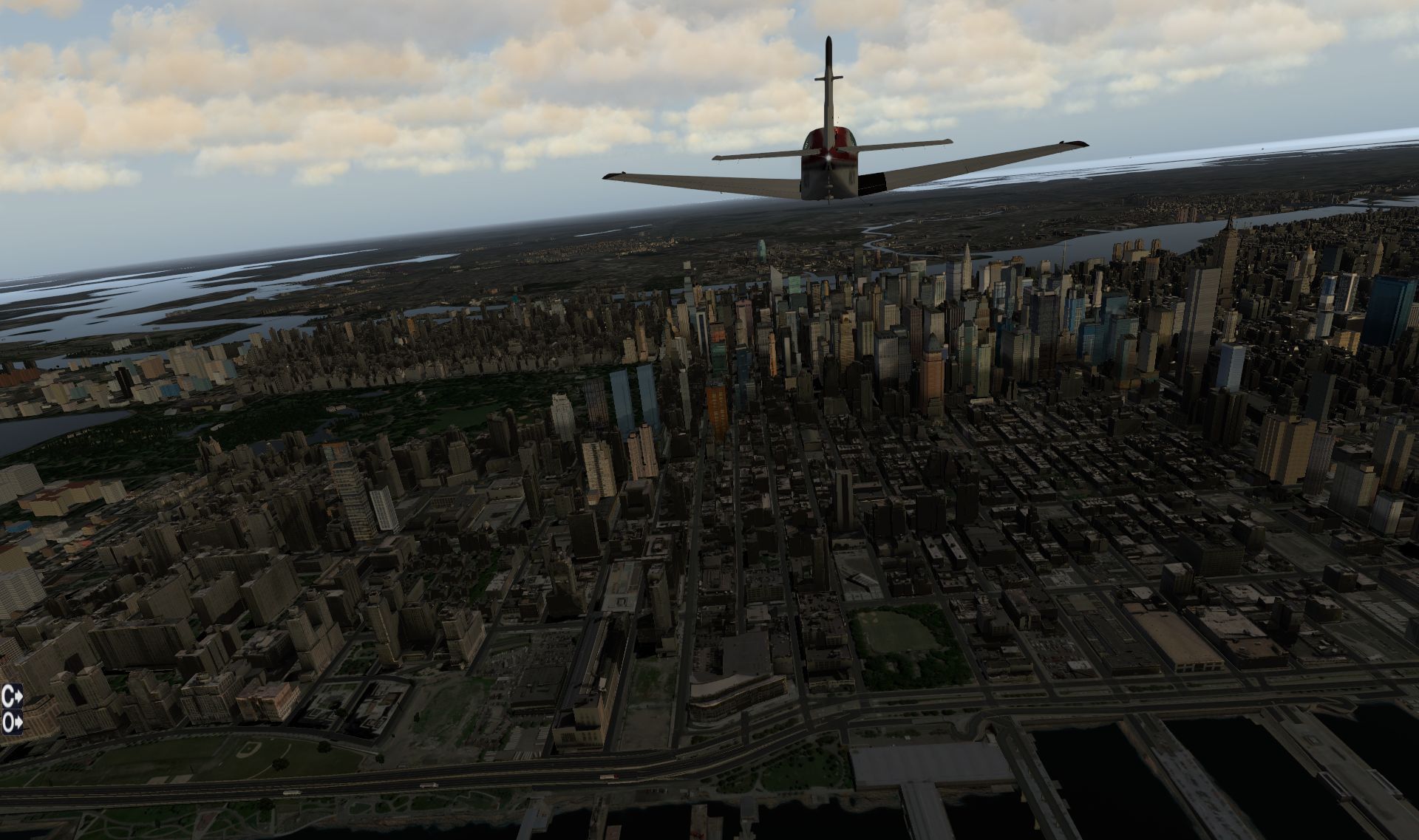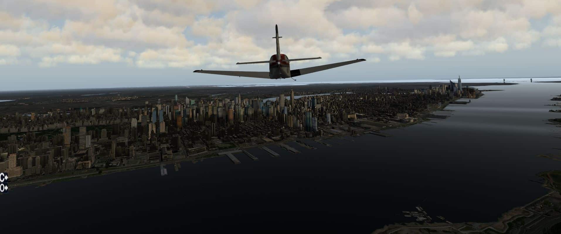 Zunächst einmal zur bislang besten Szenerie die es bislang für X-Plane gibt. New York City von Drzewiecki Design. Schon wenn man in KHPN startet kann man bei geeigneten Wetter in der Entfernung die Skyline von Manhattan erkennen und auch die Bebauung ist deutlich dichter. Schon kurze Zeit später kommt auch noch eine Fotoszenerie hinzu. Dabei hält sich zumindest auf besseren Grafikkarten die Rechnerbelastung in sehr überschaubaren Grenzen. Wir werden in Kürze einen genaueren Blick auf dieses Highlight werfen.