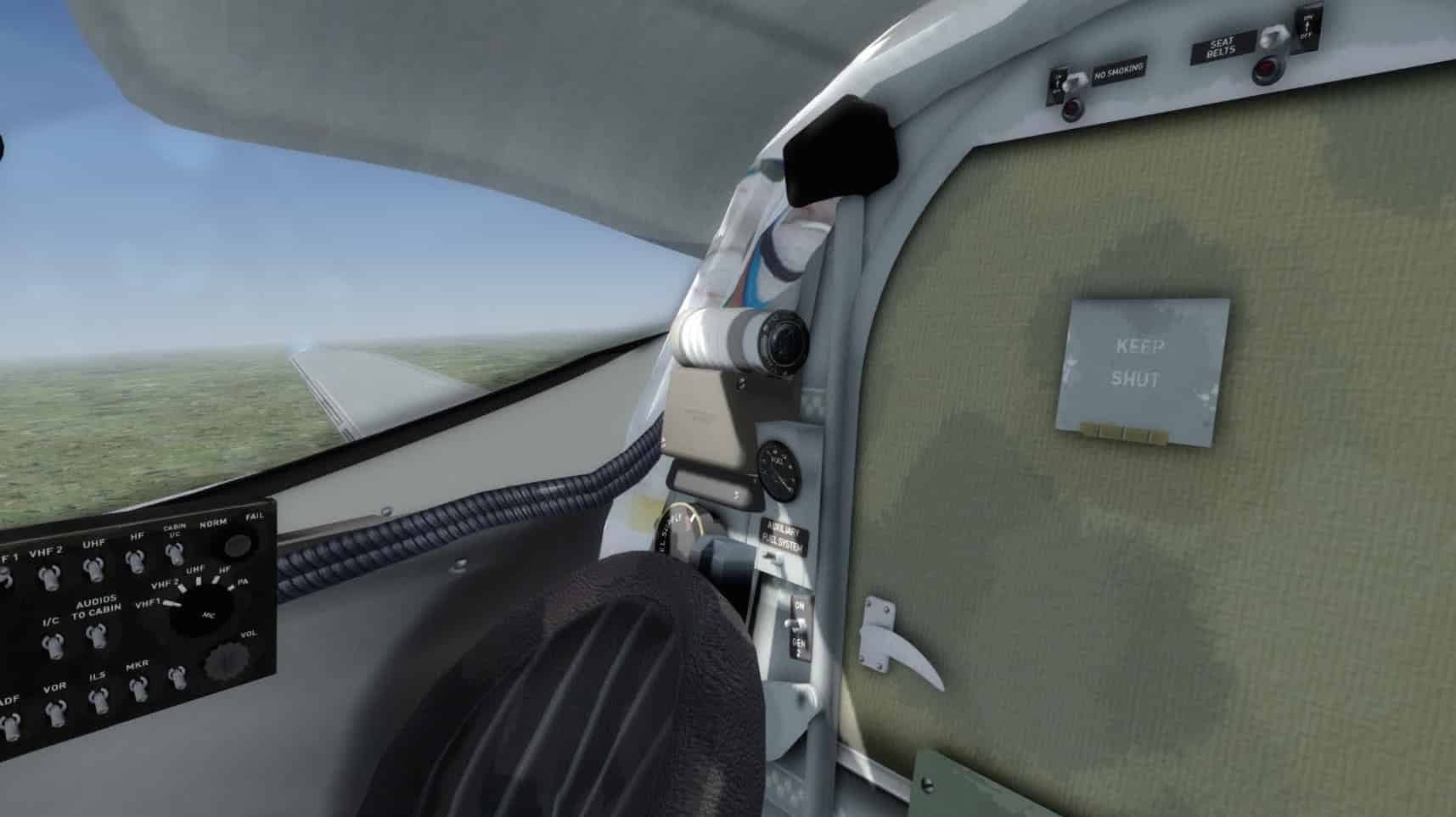 Generell ist es im Cockpit so eng, dass man für den realistischen Betrieb öfters mal zwischen Piloten- und Copilotenplatz wechseln muss. Zum Beispiel sind die Benzinhähne und Generatorschalter hinter den Sitzen angebracht.