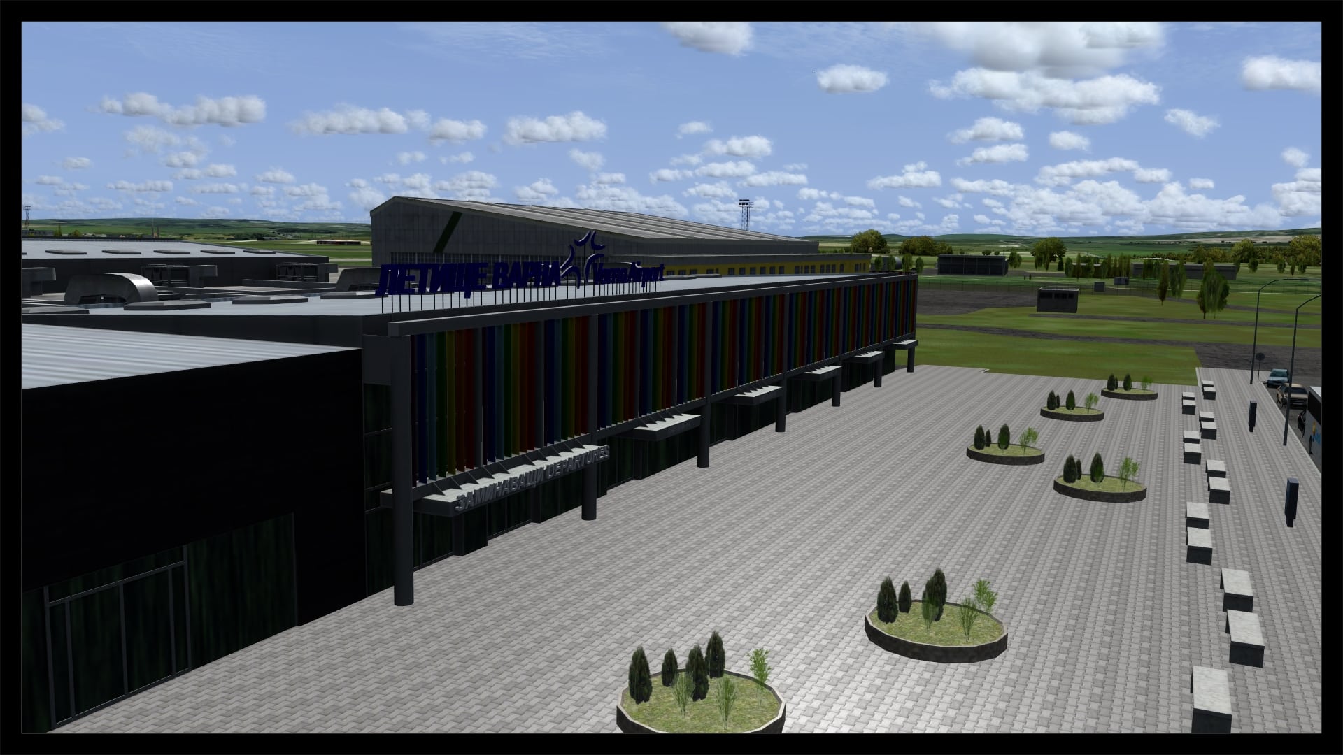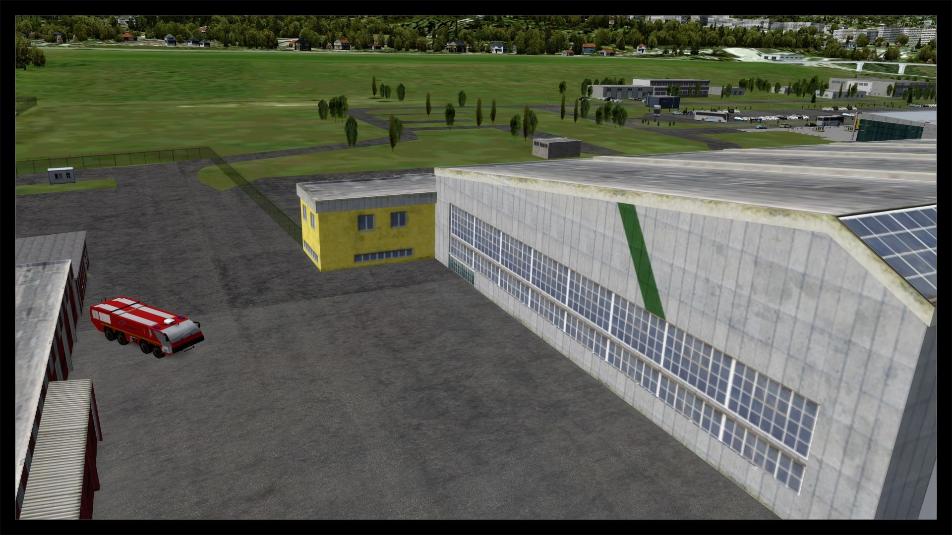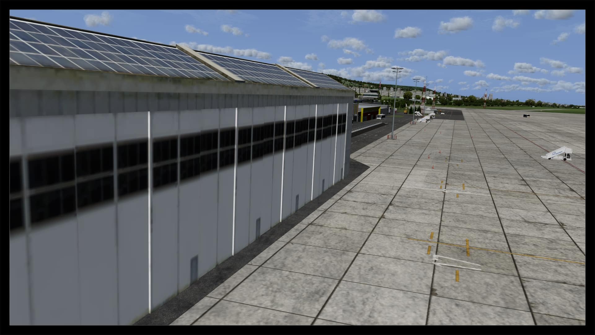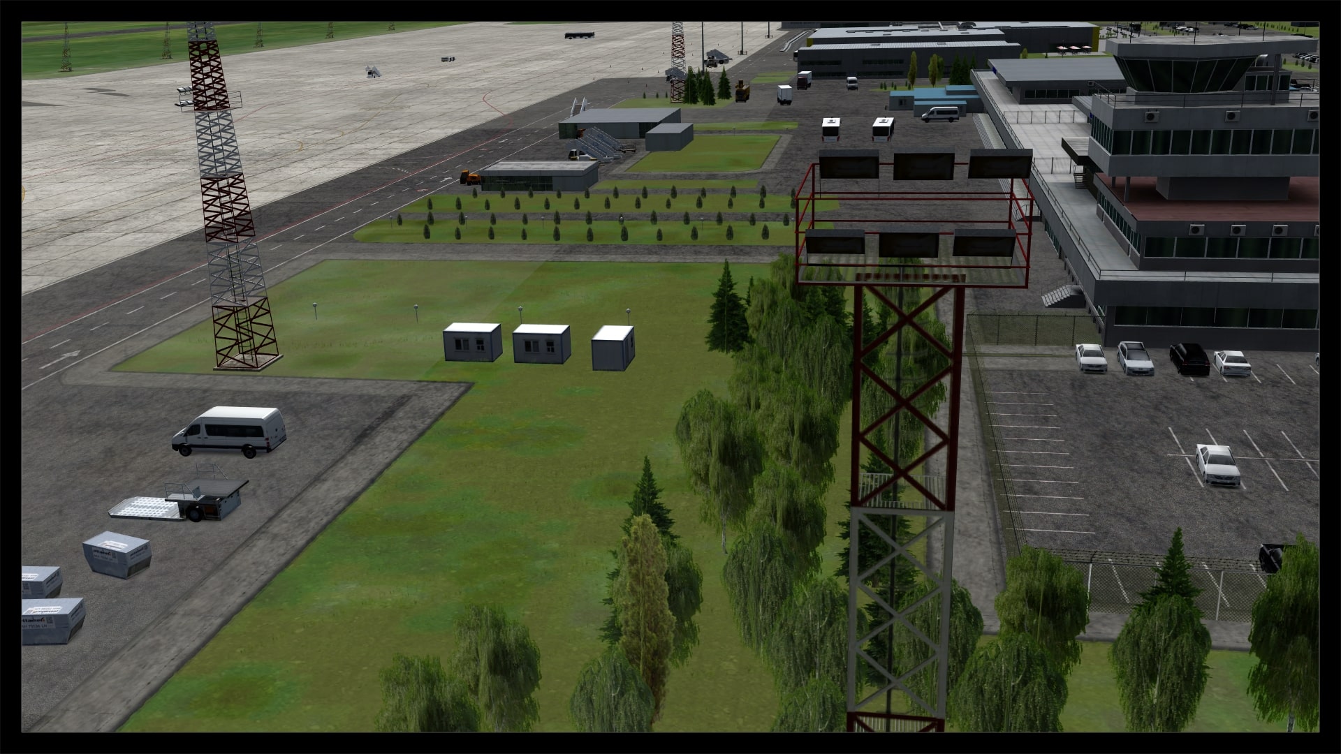 Die Umsetzung der Flughafengebäude ist gelungen – sowohl in der Modellierung als auch Texturierung gerade am Terminal 2, wobei die Detaillierung nicht besonders ausgeprägt ist. Zwar wurden die Gebäude mit Klima- und Lüftungsanlagen sowie mit 3D Schriftzügen versehen, dennoch schien der Wille zur Detaillierung bei Linz und Girona größer gewesen zu sein. Kurzgesagt, JUSTSIM hat sich auf das Wesentliche konzentriert, Eyecandy sucht man vergebens. Für den Flugbetrieb zwar unerheblich, der Vollständigkeit halber aber erwähnt, sei die lieblose Umsetzung der Landseite. Zwar entsprechen die Gebäudeformen und die Positionierung der Realität, doch die Umsetzung ist eher mäßig. So wurden die Gebäude einfach auf die grüne Wiese gestellt, ohne Zufahrten bzw. Untergrund. Auch die Platzierung der Zäune und anderer kleinerer Objekte ist eher rudimentär. Darüber hinaus sind unter den Laternen hellgraue viereckige Flächen zu erkennen. Die luftseitigen Objekte wie Fahrzeuge, Vorfeldstrahler und Nebengebäude sehen dagegen gut aus und besitzen Zufahrten sowie sauber umgesetzte verblasste Texturen.