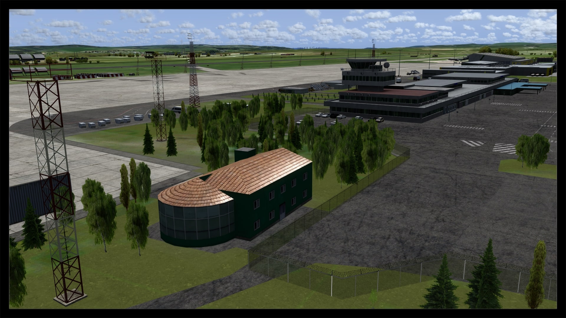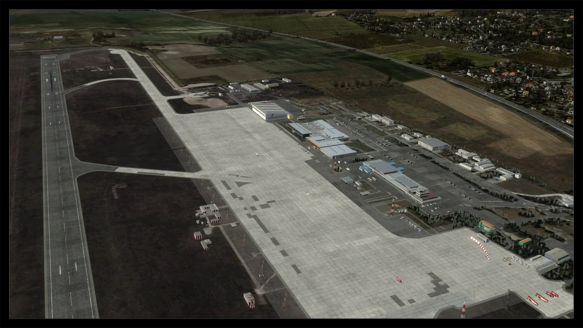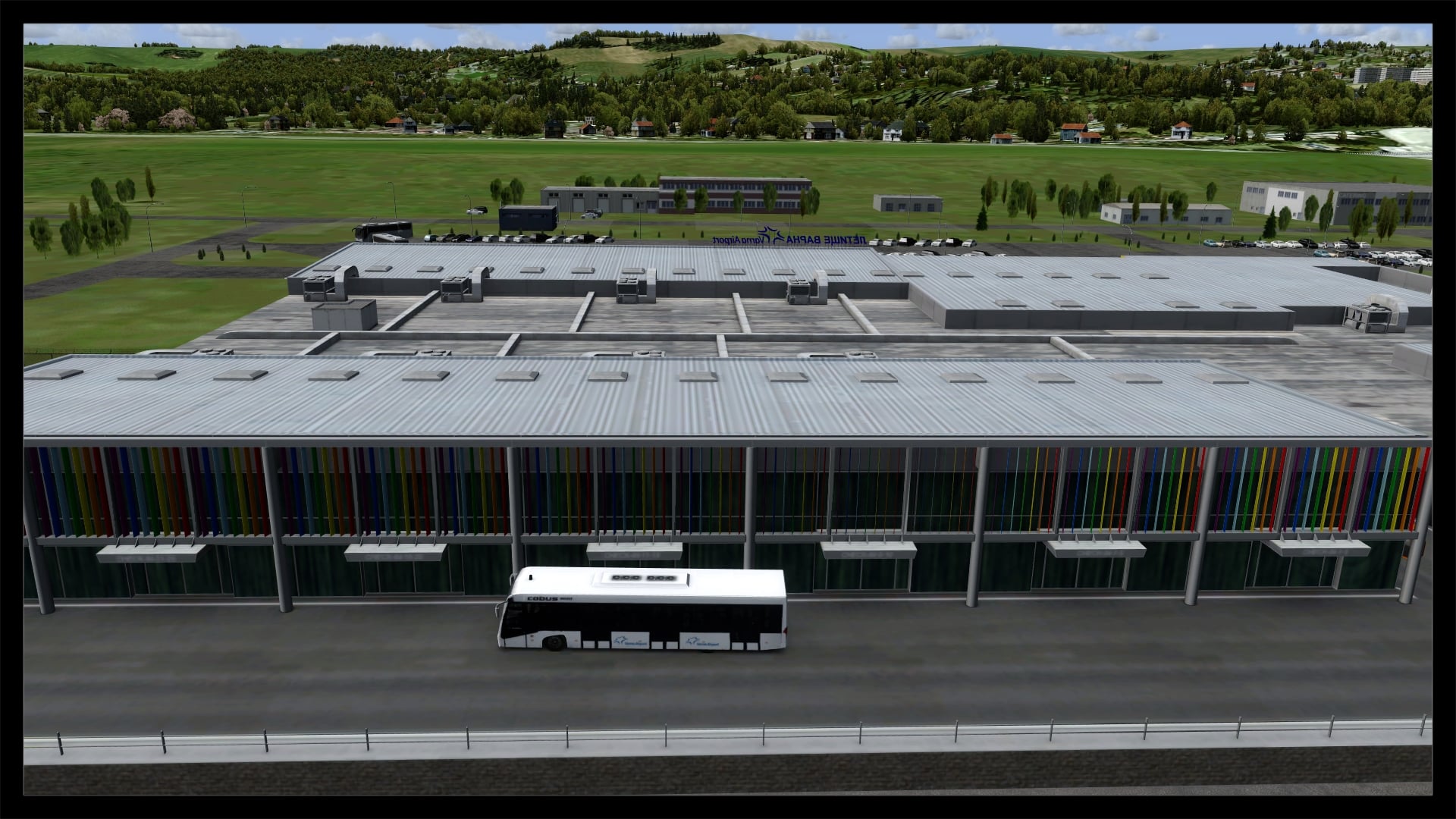 Die Umsetzung der Flughafengebäude ist gelungen – sowohl in der Modellierung als auch Texturierung gerade am Terminal 2, wobei die Detaillierung nicht besonders ausgeprägt ist. Zwar wurden die Gebäude mit Klima- und Lüftungsanlagen sowie mit 3D Schriftzügen versehen, dennoch schien der Wille zur Detaillierung bei Linz und Girona größer gewesen zu sein. Kurzgesagt, JUSTSIM hat sich auf das Wesentliche konzentriert, Eyecandy sucht man vergebens. Für den Flugbetrieb zwar unerheblich, der Vollständigkeit halber aber erwähnt, sei die lieblose Umsetzung der Landseite. Zwar entsprechen die Gebäudeformen und die Positionierung der Realität, doch die Umsetzung ist eher mäßig. So wurden die Gebäude einfach auf die grüne Wiese gestellt, ohne Zufahrten bzw. Untergrund. Auch die Platzierung der Zäune und anderer kleinerer Objekte ist eher rudimentär. Darüber hinaus sind unter den Laternen hellgraue viereckige Flächen zu erkennen. Die luftseitigen Objekte wie Fahrzeuge, Vorfeldstrahler und Nebengebäude sehen dagegen gut aus und besitzen Zufahrten sowie sauber umgesetzte verblasste Texturen.