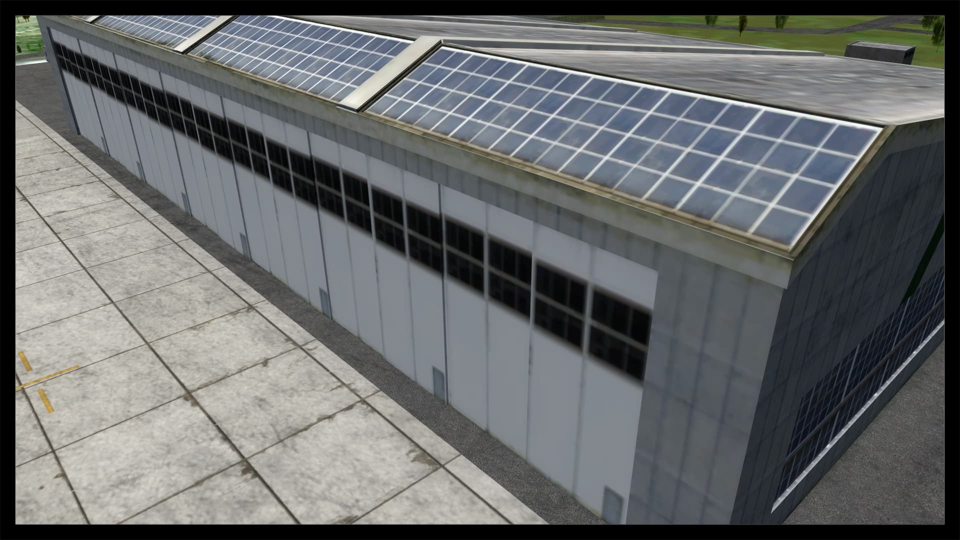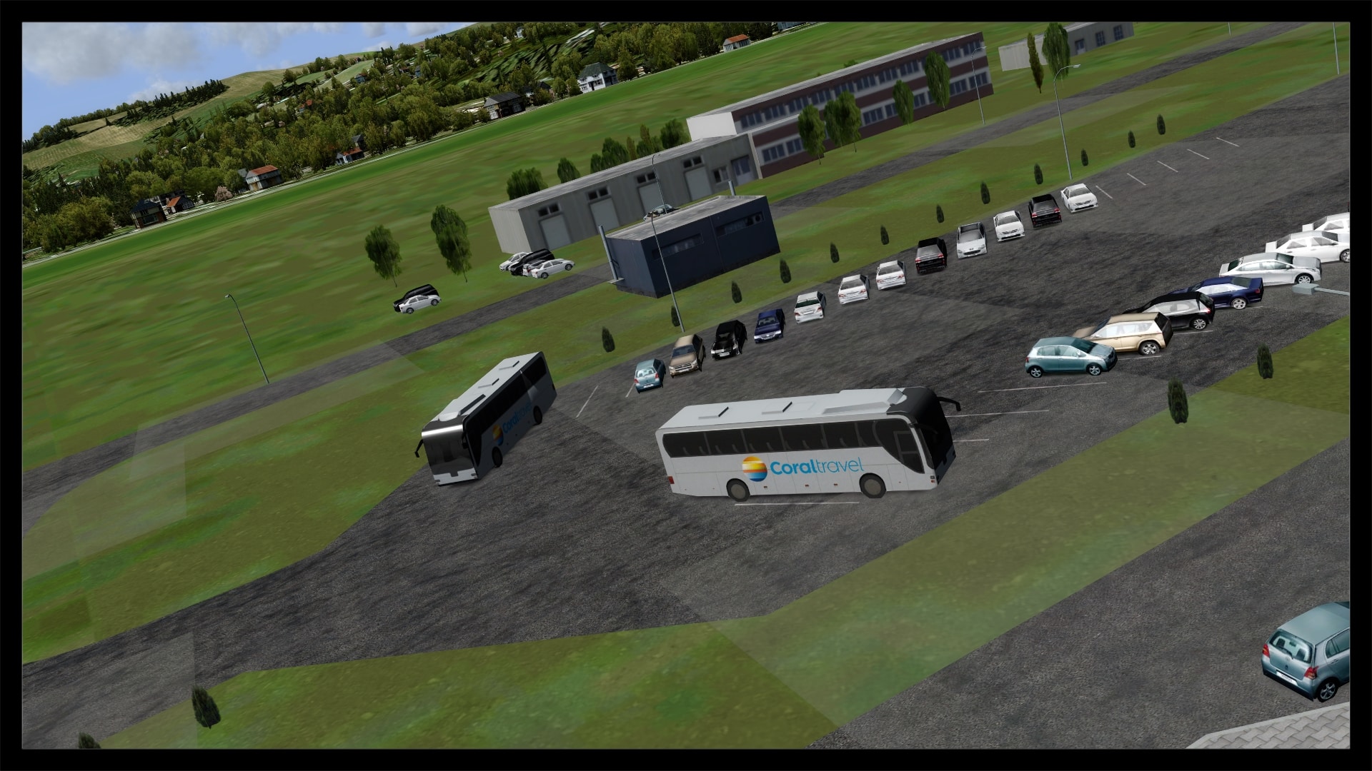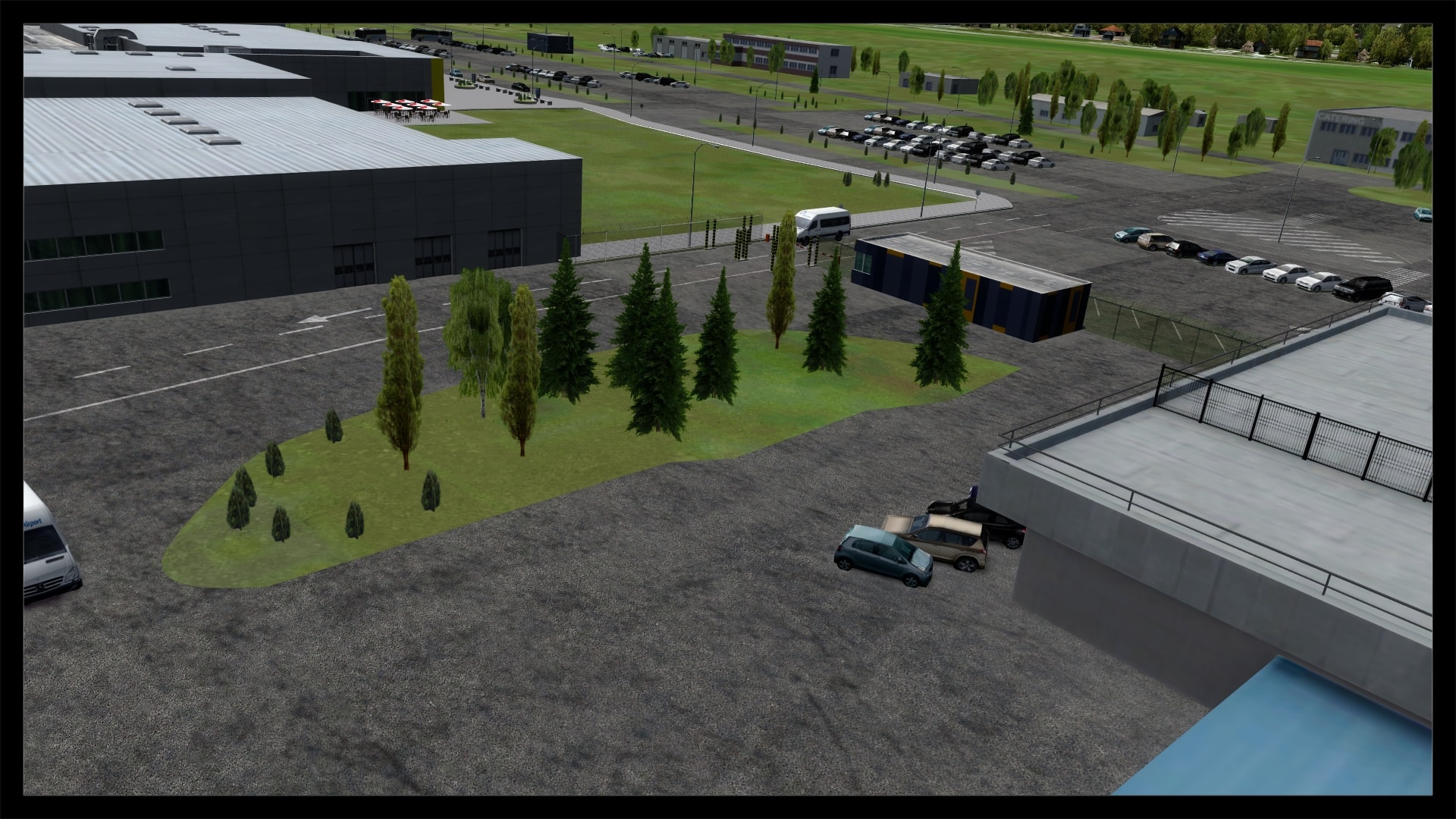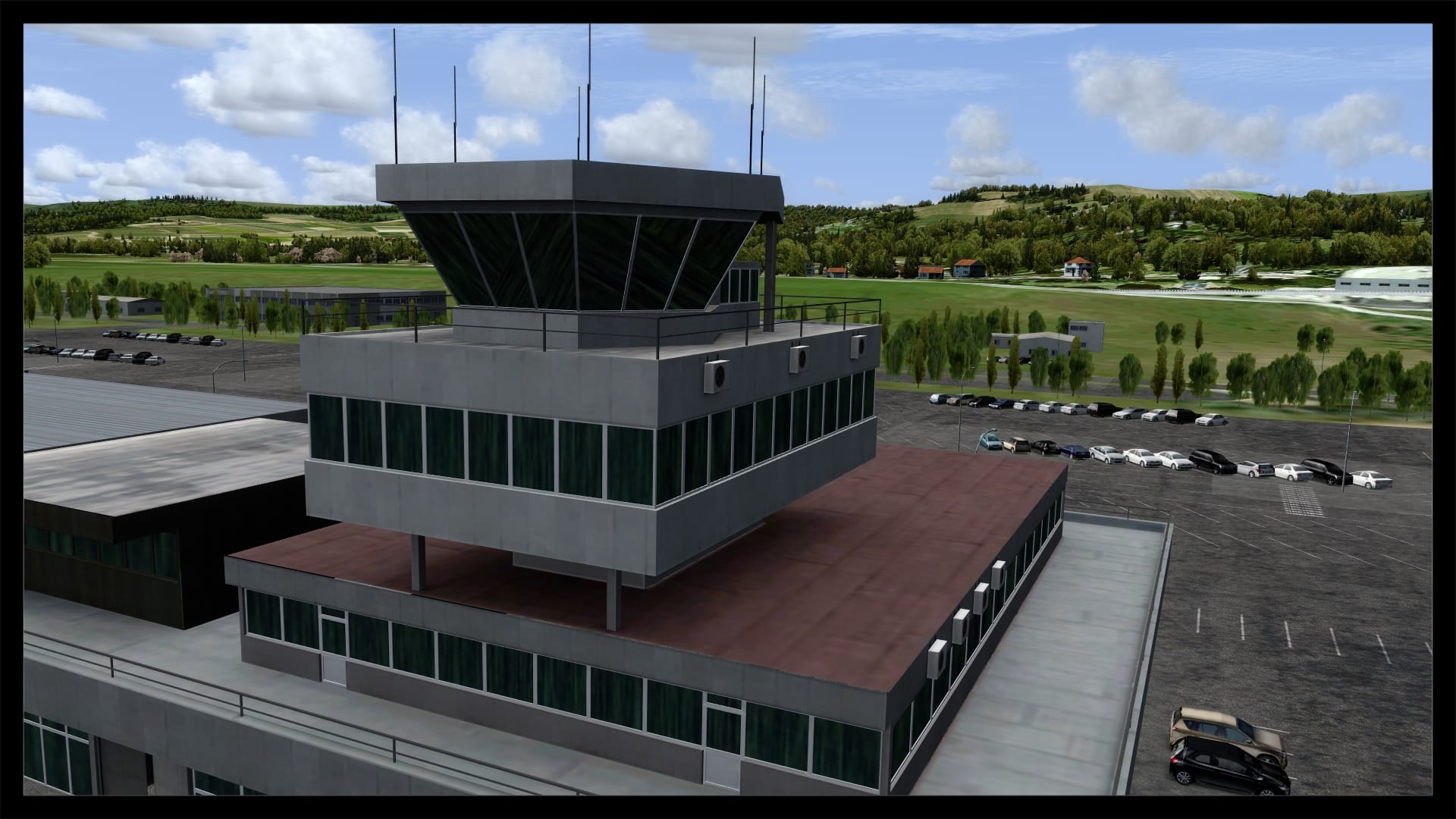 Die Umsetzung der Flughafengebäude ist gelungen – sowohl in der Modellierung als auch Texturierung gerade am Terminal 2, wobei die Detaillierung nicht besonders ausgeprägt ist. Zwar wurden die Gebäude mit Klima- und Lüftungsanlagen sowie mit 3D Schriftzügen versehen, dennoch schien der Wille zur Detaillierung bei Linz und Girona größer gewesen zu sein. Kurzgesagt, JUSTSIM hat sich auf das Wesentliche konzentriert, Eyecandy sucht man vergebens. Für den Flugbetrieb zwar unerheblich, der Vollständigkeit halber aber erwähnt, sei die lieblose Umsetzung der Landseite. Zwar entsprechen die Gebäudeformen und die Positionierung der Realität, doch die Umsetzung ist eher mäßig. So wurden die Gebäude einfach auf die grüne Wiese gestellt, ohne Zufahrten bzw. Untergrund. Auch die Platzierung der Zäune und anderer kleinerer Objekte ist eher rudimentär. Darüber hinaus sind unter den Laternen hellgraue viereckige Flächen zu erkennen. Die luftseitigen Objekte wie Fahrzeuge, Vorfeldstrahler und Nebengebäude sehen dagegen gut aus und besitzen Zufahrten sowie sauber umgesetzte verblasste Texturen.