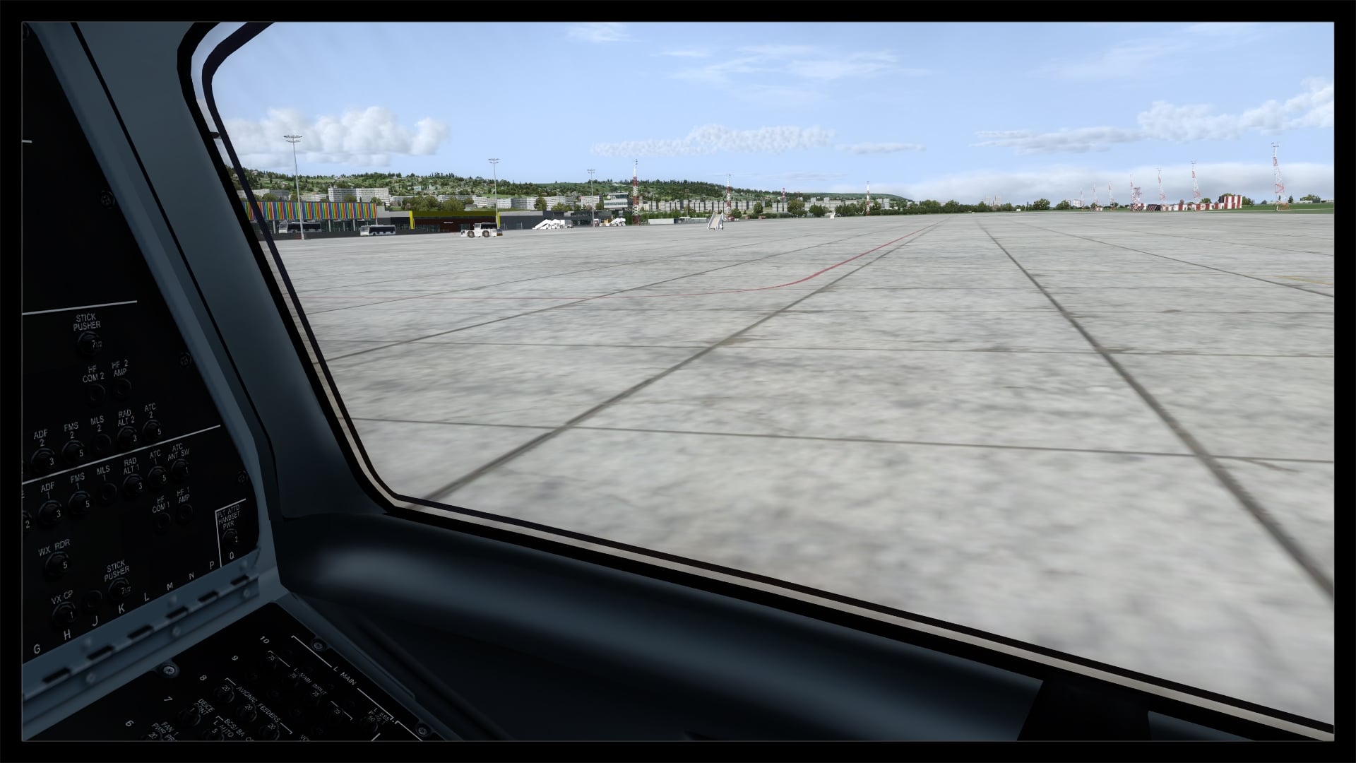 Nachdem der Anflug geglückt und die Landung erfolgreich war, kommen wir nun zum Herzstück der Szenerie. Sollte das Wetter nicht mitspielen und Regen über dem Platz hängen, erhält die Landebahn einen speziellen Nässeeffekt. Die Idee ist zu begrüßen, ob die Umsetzung gelungen ist muss jeder selbst bewerten. Gleiches gilt für den immer vorherrschenden leichten Glanz auf der Bahn, der durch die Sonnenstrahlung hervorgerufen wird.