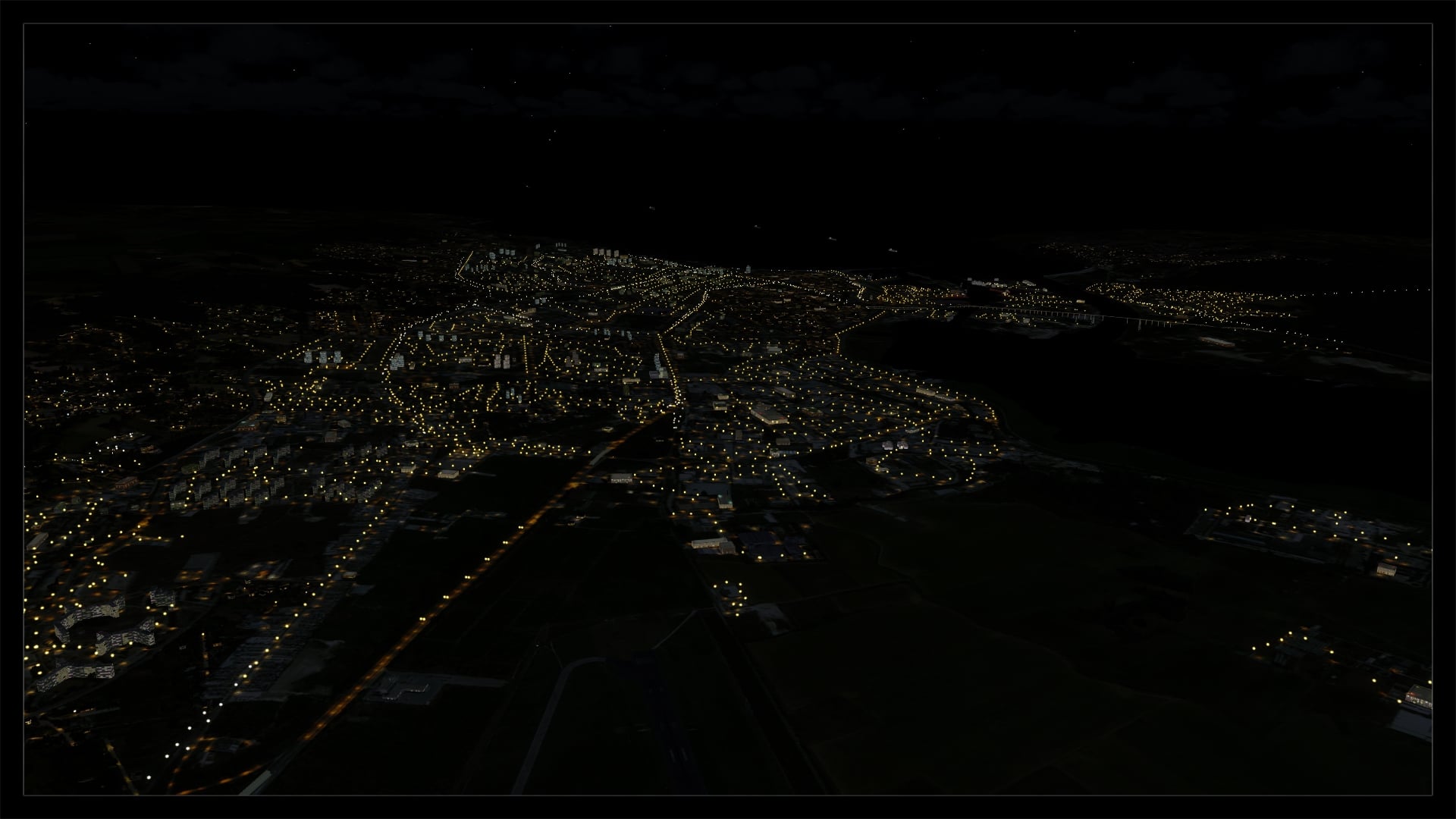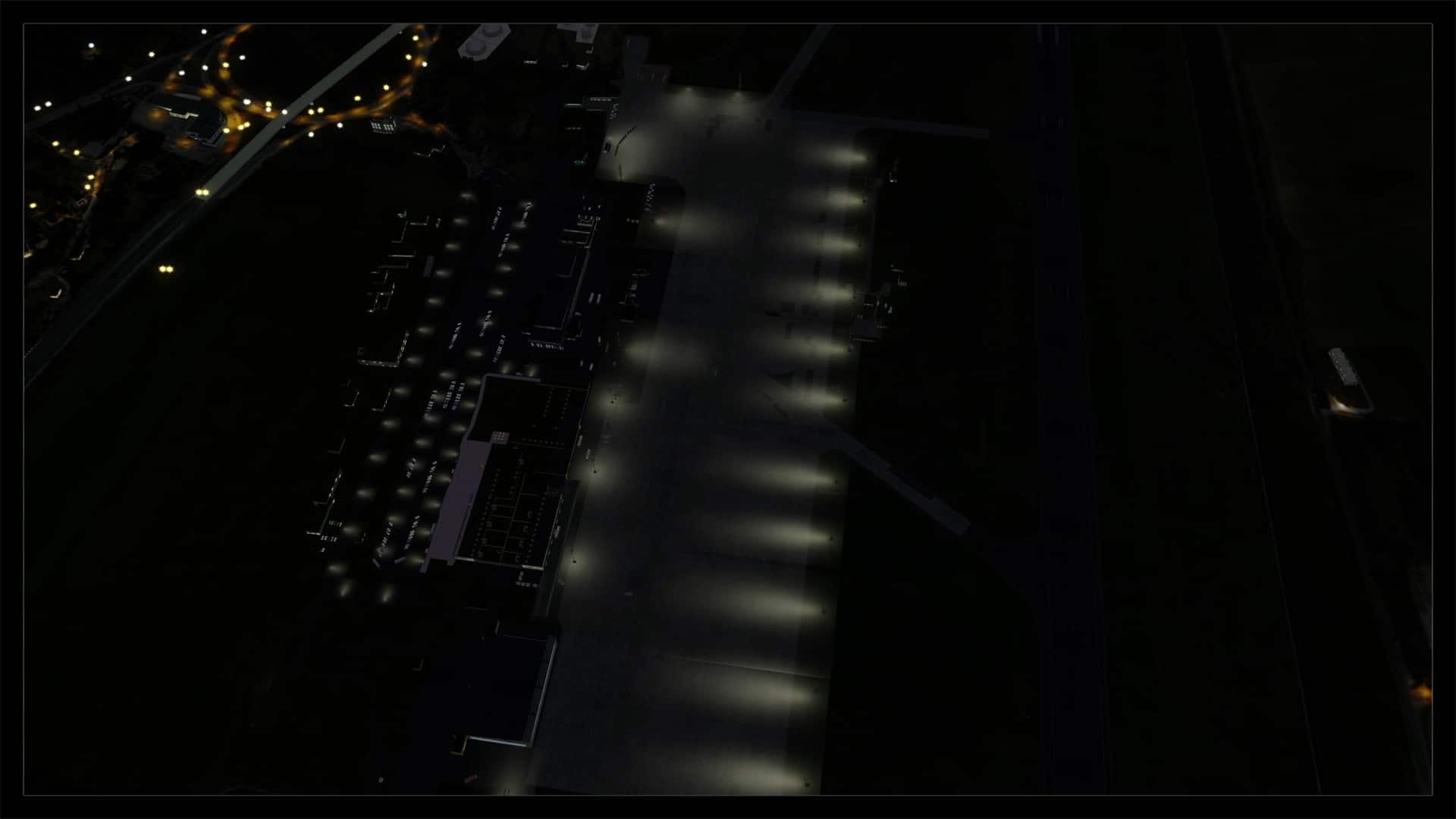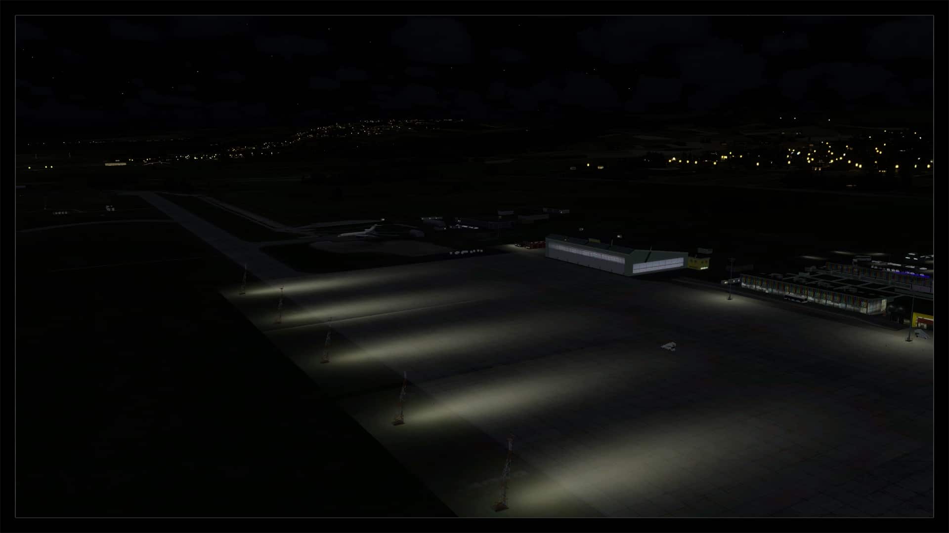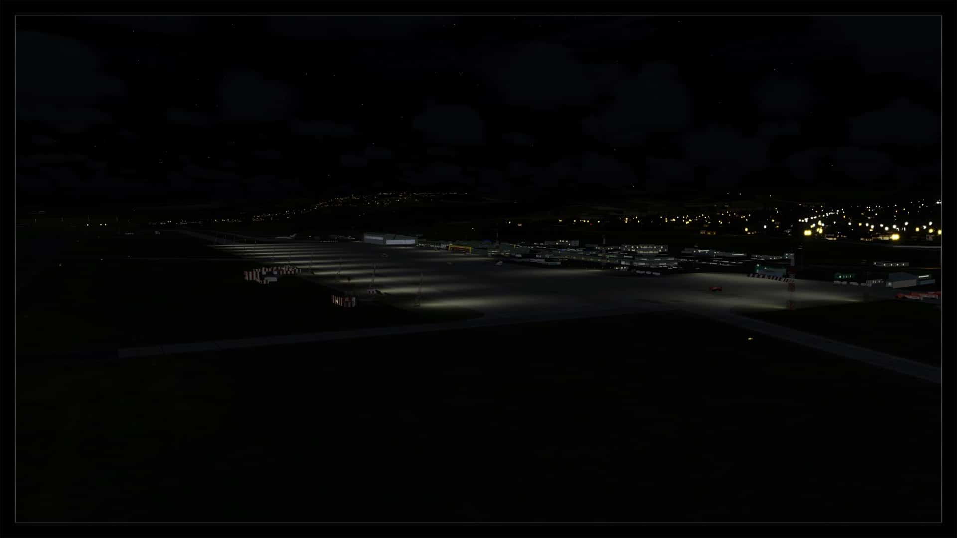 Sobald die Nacht über dem Schwarzen Meer herreinbricht, offenbart der Flugplatz mit seiner Beleuchtung eine weitere Stärke – allerdings mit Schwächen. Die Nachtbeleuchtung wirkt dezent und realistisch, gerade durch die weichen Übergänge zwischen Lichtkegel und dem unbeleuchteten Bereich. Allerdings ist dieser Übergangsbereich durch violette und gelbe Streifen durchzogen. Des Weiteren grenzt sich die „Beleuchtungstextur“, gerade am anderen Ende des Lichtkegels, durch die starke Kantenbildung, ab. Darüber hinaus sind fast alle Gebäudtexturen zu gleichmäßig ausgeleuchtet.
