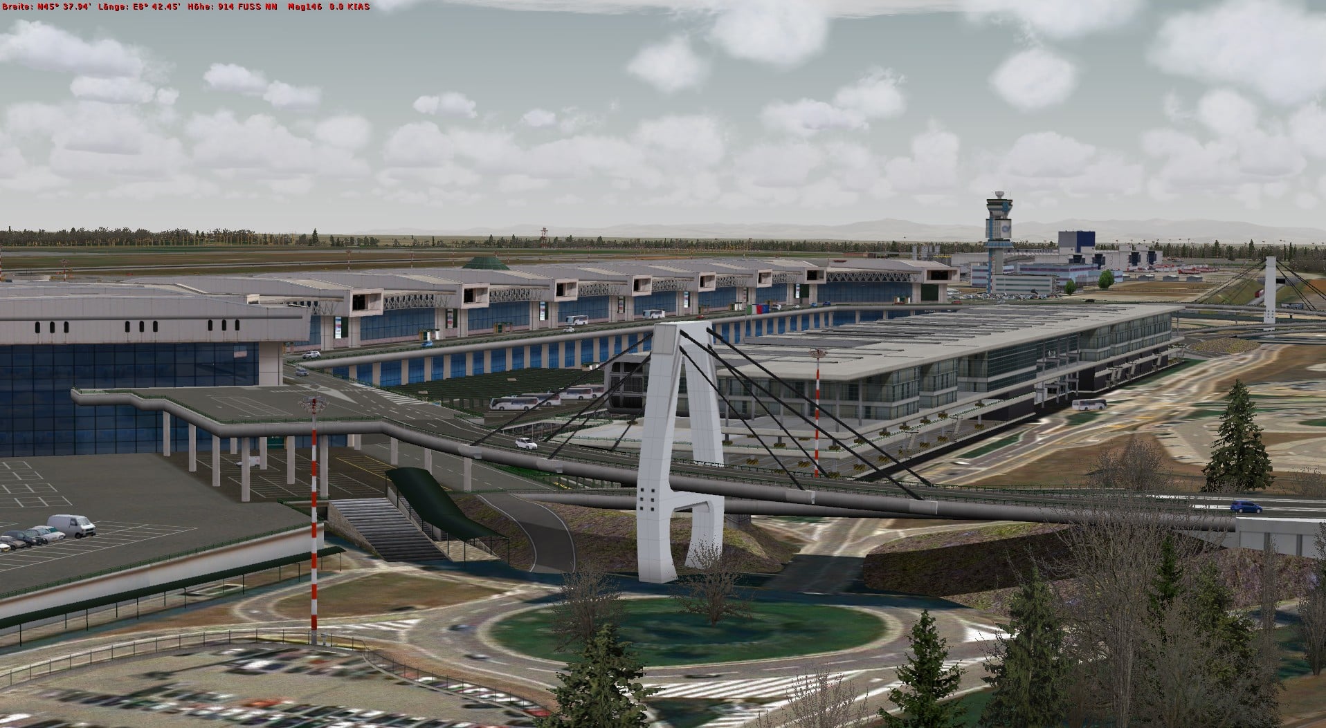 Bei der Installation kann ausgewählt werden zwischen den Standard-Jetways des FSX sowie der SODE-Version. Mit dem mitgelieferten Tool lässt sich dies vor Start des FSX jederzeit anpassen. Bei der Einbettung in die Umgebung sind mir beim Rundflug VFR keine groben Schnitzer aufgefallen. Hier und da endet eine Strasse im Nichts. Lediglich im Winter sticht das Areal durch seine sehr grünen Texturen aus der Landschaft heraus. Die Performance war auch bei schlechtem Wetter und großem Fluggerät stets im grünen Bereich. Die Texturen der Gebäude sind auf dem Stand der Zeit und können sich zeigen. Auch die Pisten und Rollwege samt Markierungen sind schön umgesetzt. Einzig der Graben im Anflug, durch den eine Bahnstrecke verläuft, wirkt nicht ganz sauber umgesetzt. Das fällt im Vorbeiflug aber eher weniger ins Gewicht.