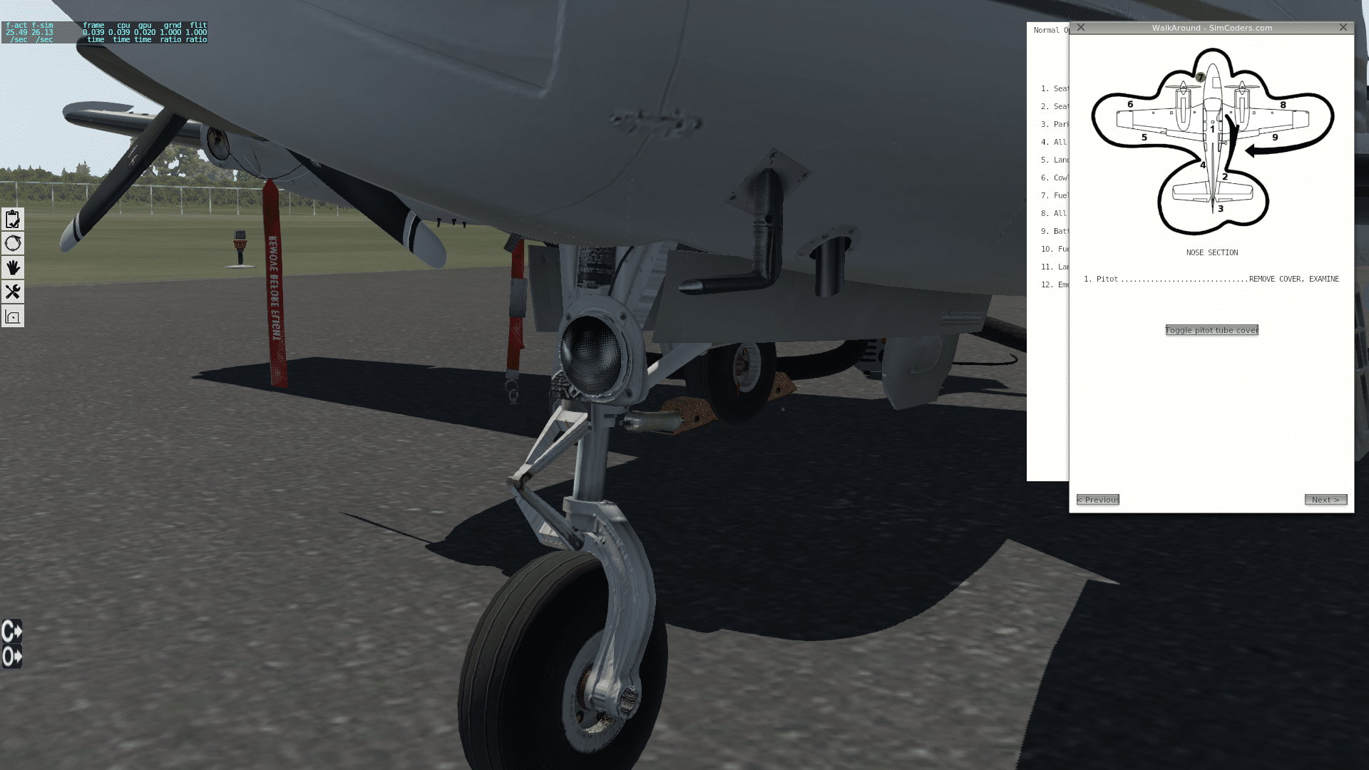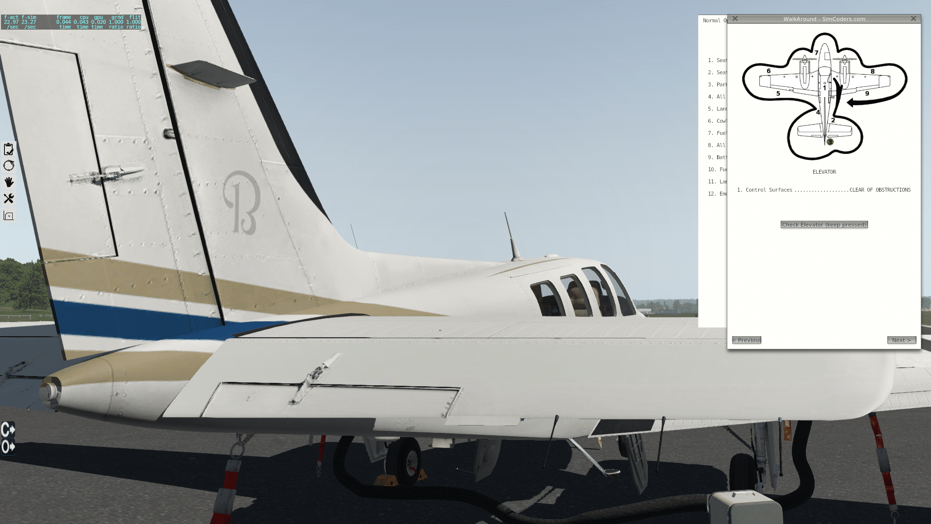 Im Wesentlichen kennen wir das Reality Expansion Plugin schon von den anderen Fliegern. Man packt einfach das REP plugin in den plugin Ordner der Baron 58 und wenn man in X-Plane dieses enabled installiert es die eigentlichen Daten nach Eingabe des Lizenzschlüssels. Vor dem Starten der Motoren müssen wir jetzt eine Ausseninspektion vornehmen und alle Abdeckungen, Befestigungen und die Chocks entfernen.