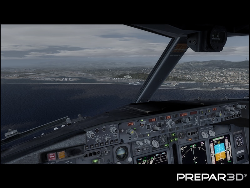 Also rein in den Flieger und gleich mal hin in den sonnigen Süden! Wetterbedingt ist die Piste 25R für mich zur Landung vorgesehen, was einen Anflug über die Stadt und den Hafen bedeutet. JustSim liefert nicht nur ein großes Luftbild mit, das weite Teile der Stadt und des Umlandes mit abdeckt, sondern platziert auch ein paar Sehenswürdigkeiten und jede Menge Autogen, sodass dieser Anflug schon weit vor den Toren des Airports zum Genuss wird. Die Hafenanlagen wurden ebenfalls ansprechend „möbliert“ und bieten eine schöne Balance zwischen Ambiente und Performance. Es gibt im Endanflug etwas zu gucken, ohne das die Bildwiederholungsrate in den Keller sinkt. So soll das sein.