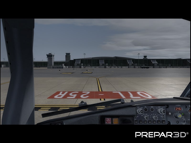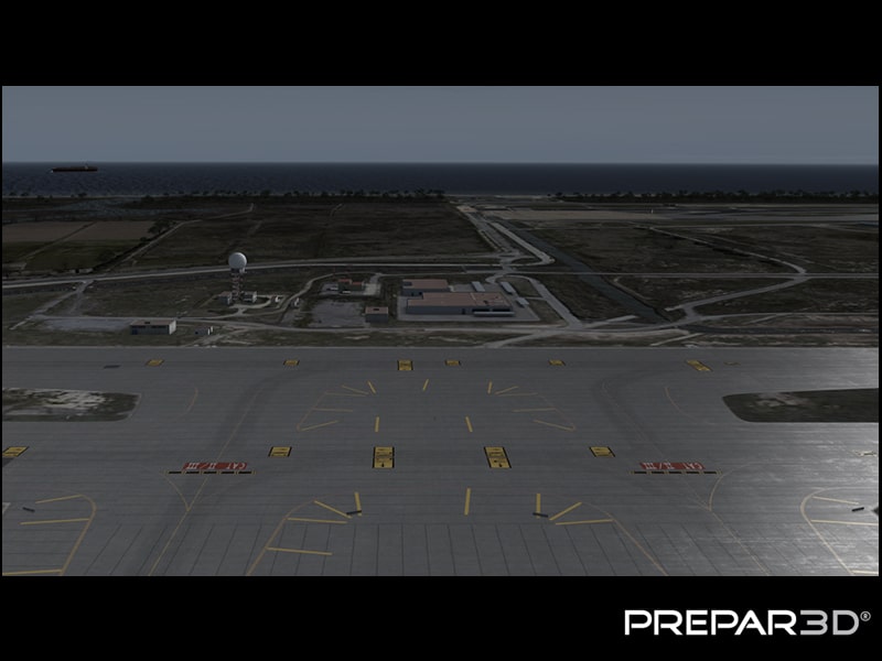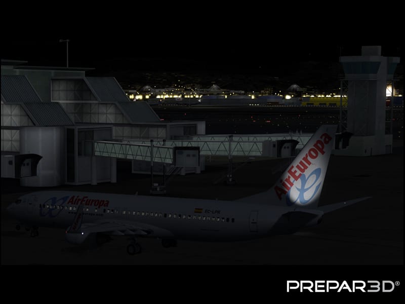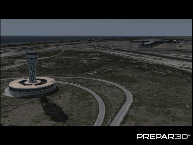 Auf dem Airport angekommen, fallen zunächst die Bodentexturen auf. Wer auf die etwas „speckig“ glänzenden Bodentexturen im P3D steht, wird auch in Barcelona nicht enttäuscht. Es ist Geschmackssache und mir gefällt es! Die Markierungen sind sauber, die Beschilderung ordentlich und auch an dreidimensional gestalteten Rollweg- und Runway-Beleuchtung wurde nicht gespart. Gespart wurde hingegen an anderer Stelle, nämlich an den Gebäudetexturen. Diese sind im Falle von Barcelona leider nicht besonders toll und stehen teilweise im krassen Gegensatz zu den gut gemachten Bodentexturen. Egal, welches Gebäude man auch aus der Nähe betrachtet, keines ist wirklich detailliert texturiert. An einigen etwas abseits gelegenen Gebäuden sind Logos angebracht, die so unscharf sind, dass man nicht einmal erkennt, welche Firmen dort ansässig sind. Selbst die Gebäude, mit denen man als virtueller Pilot – hoffentlich nicht wortwörtlich – in Berührung kommt, können nicht überzeugen. Beide Terminals sind stellenweise so unscharf, dass man meinen könnte, man stehe auf einem Standardflughafen des Flight Simulators und nicht im Umfeld eines Szenerie-Addons. Die Anfangs noch flimmernden Texturen an den Fluggastbrücken wurden mittlerweile durch ein Update gefixt, sodass zumindest dieser Kritikpunkt von der Liste gestrichen werden konnte.