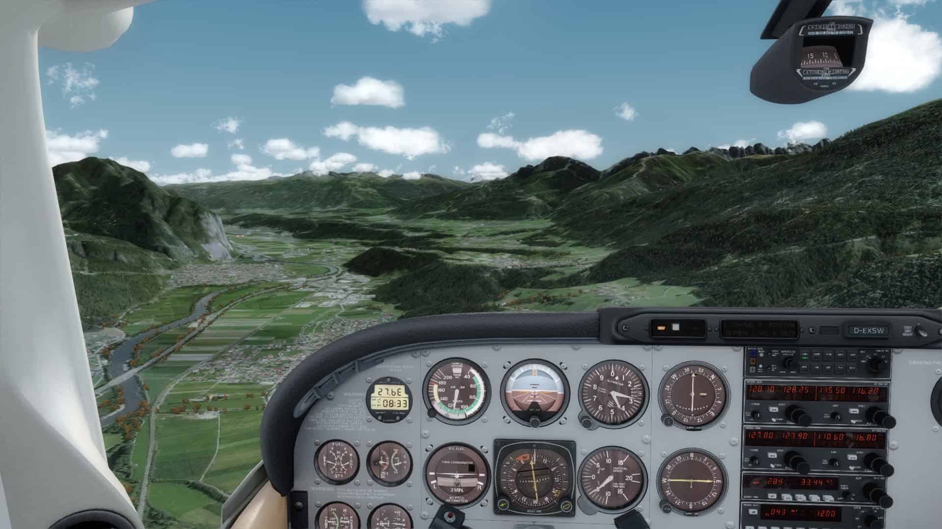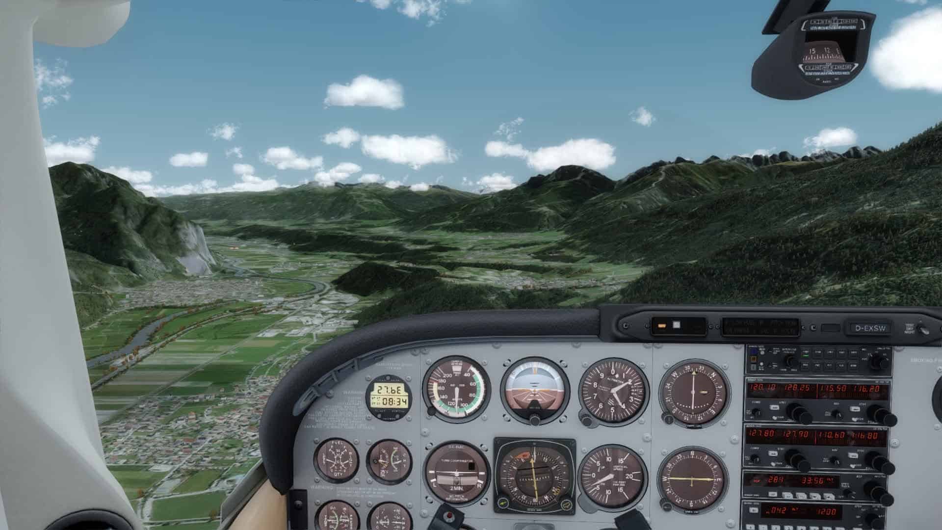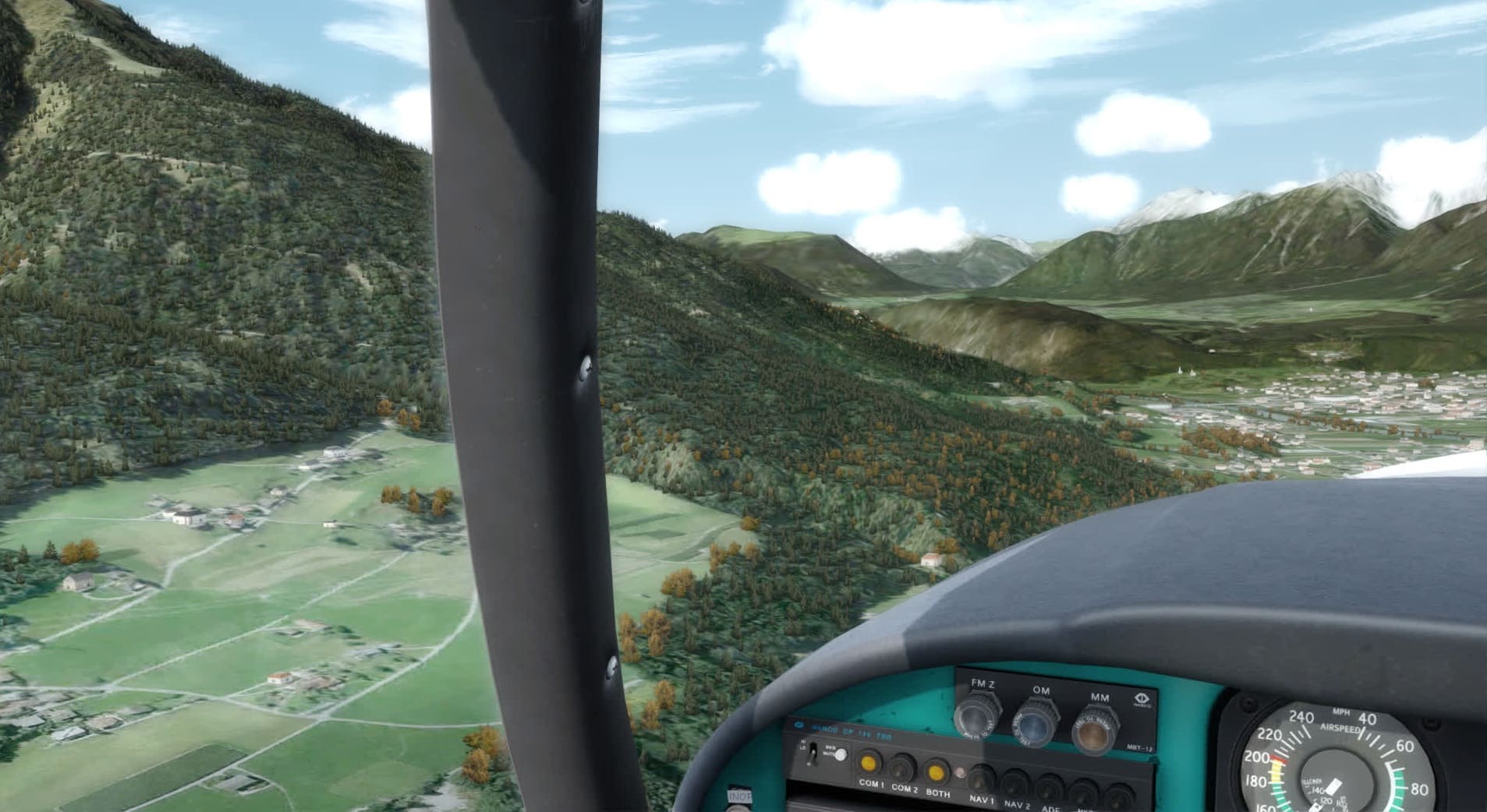 Aber was bei Austria Professional West am meisten Spaß macht, dass ist das Fliegen im Hochgebirge. Also schnappen wir uns wieder ein Propellerflugzeug (diesmal die A2A Cherokee), um aus Innsbruck durch das Inntal zum Ötztal und zur italienischen Grenze zu fliegen.