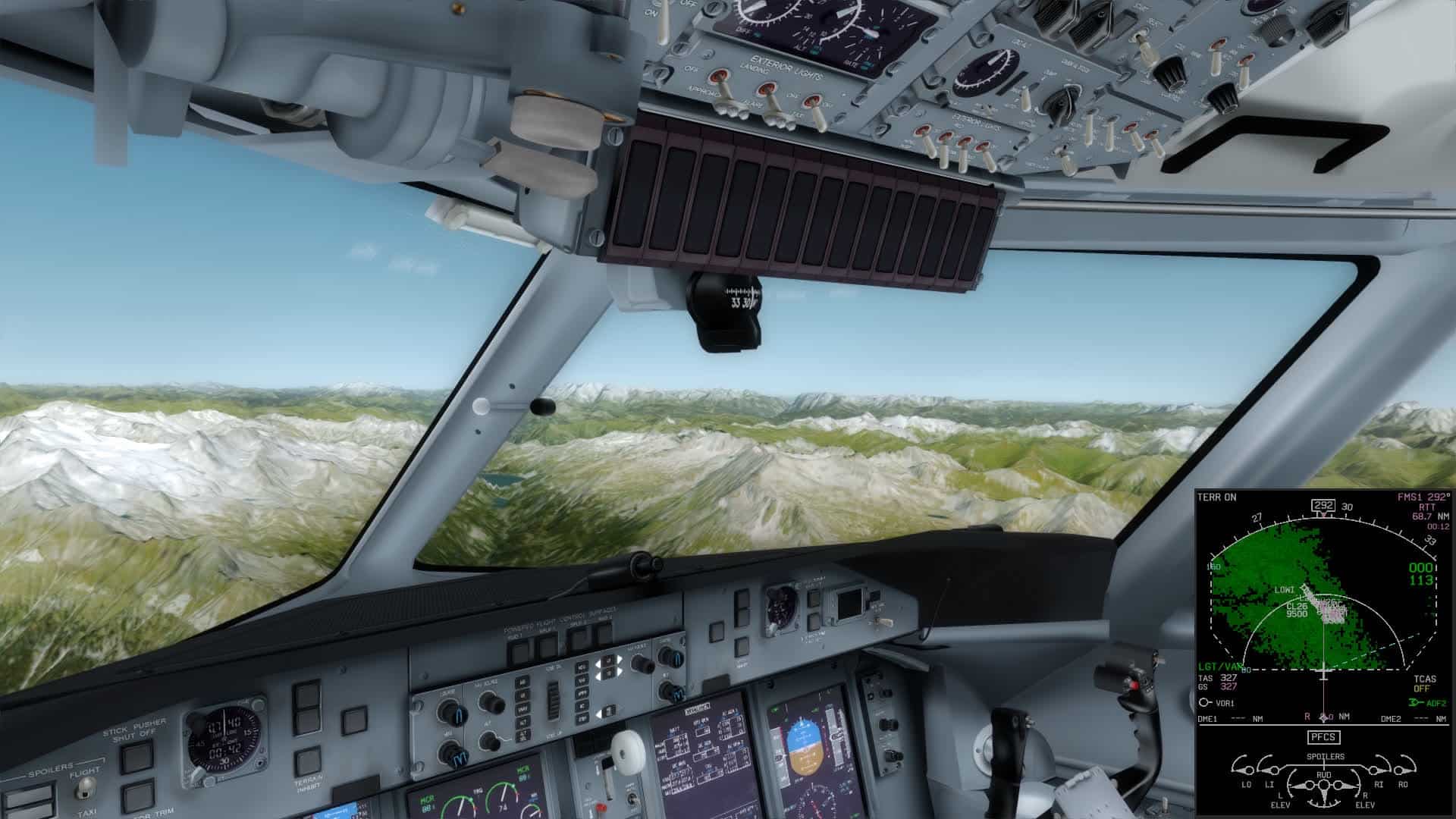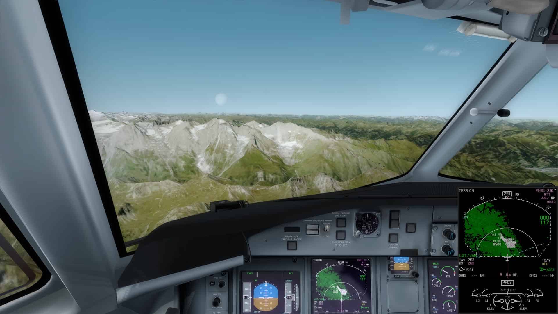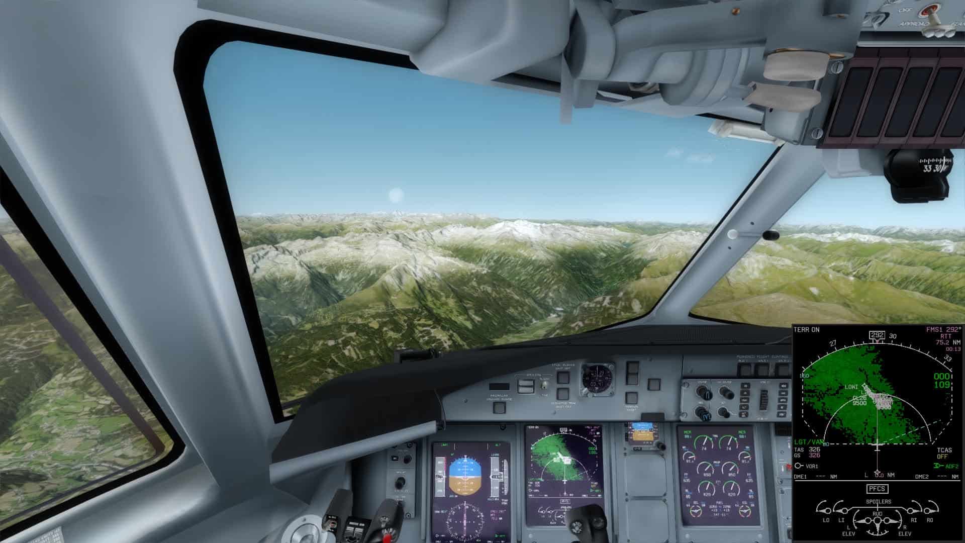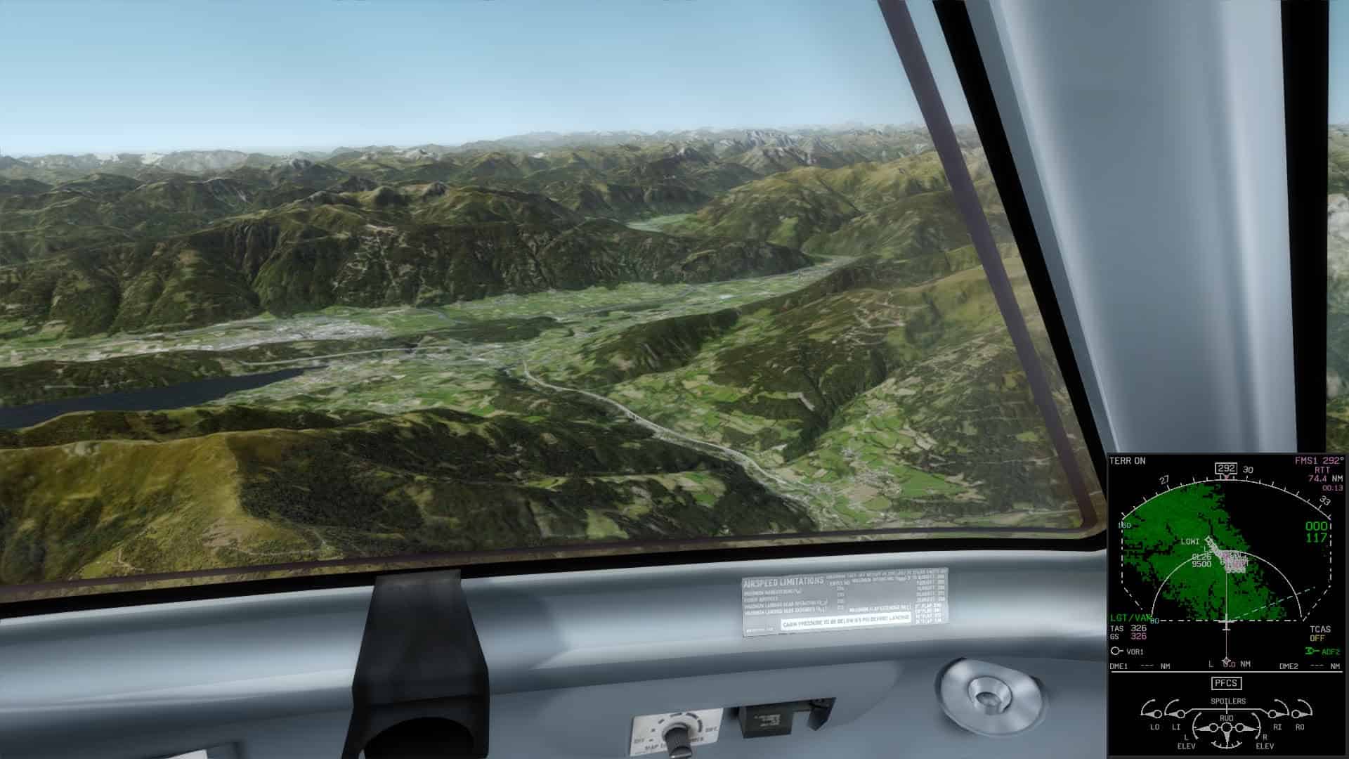 Der andere wichtige Flieger, der in Austria West geflogen werden wird, das ist die PMDG 737. Auch hier keine Besonderheiten oder Performanceprobleme. Für diesen Anflug bin ich aus Genf gekommen, um den RNAV-Anflug aus Osten ins Inntal auszuprobieren. Wunderbar, wie die Berge zur Geltung kommen, wenn man aus den Wolken herauskommt. Diesmal wieder ohne Approaching Innsbruck.