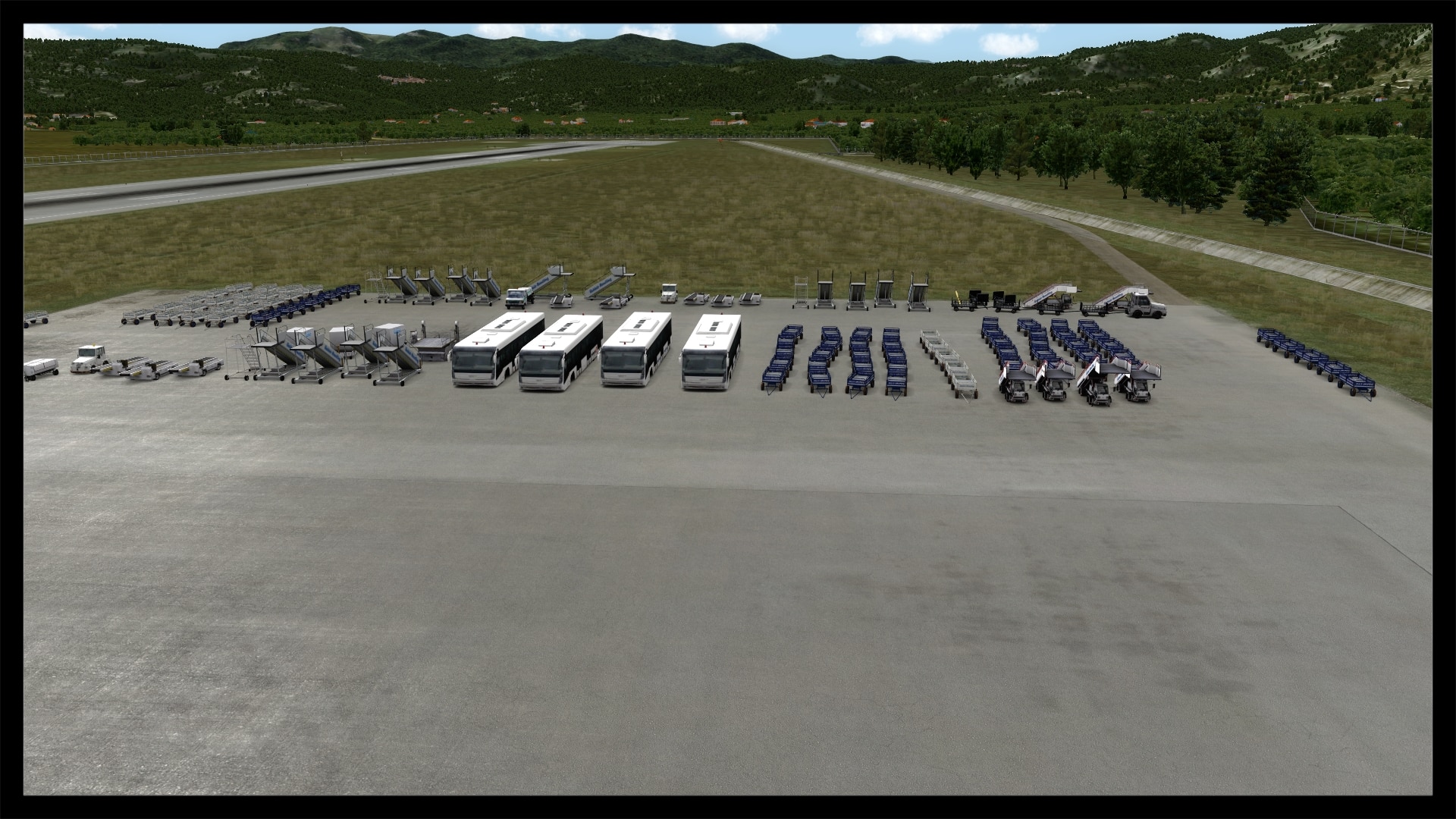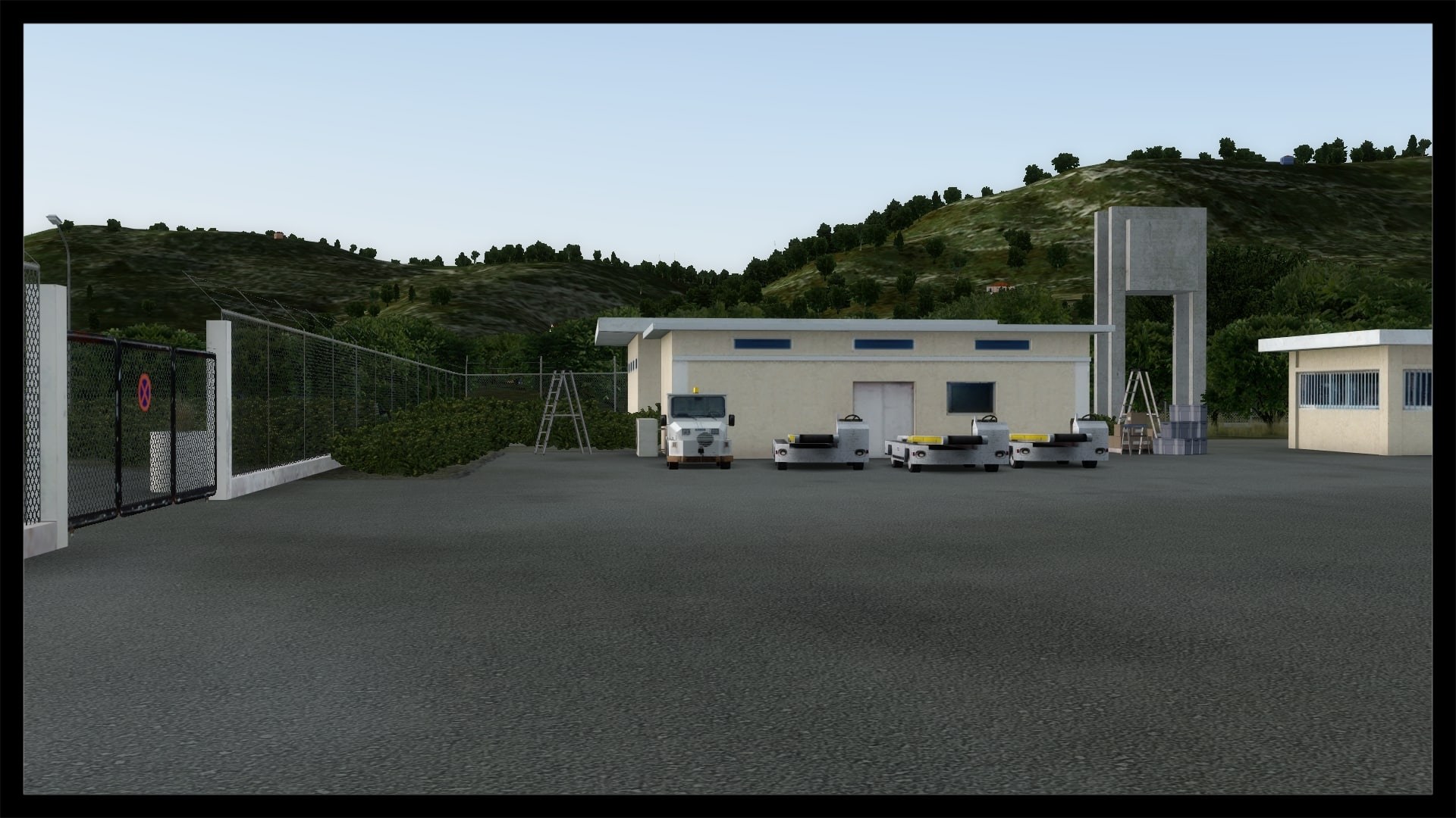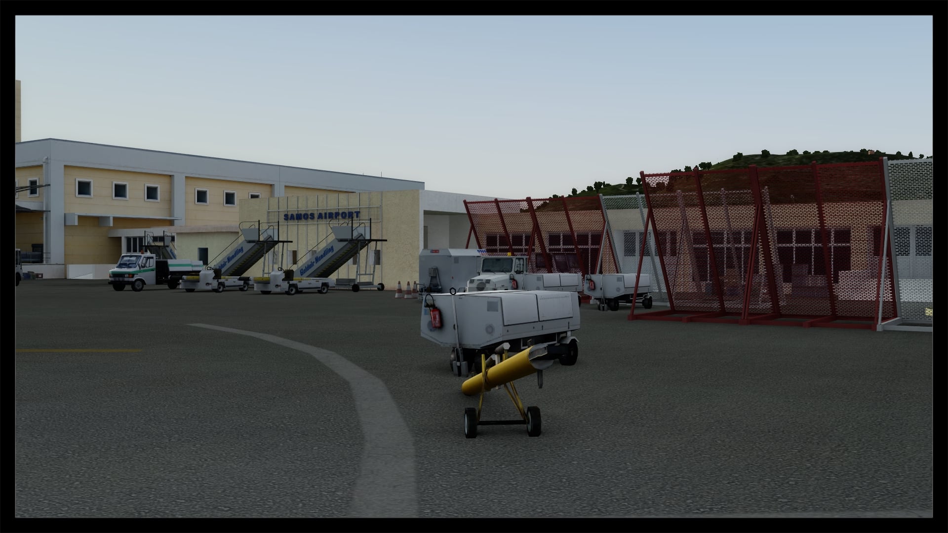 Samos International Airport „Aristarchos of Samos“, so der offizielle Name, kommt in der für kleinere Ferienflughäfen typischen Bauweise daher: Mittige Terminal-Anordnung und die Notwendigkeit, am Landekopf eine 180 Grad-Drehung zu vollziehen um starten zu können. Das Vorfeld fasst ungefähr 6 Boeing 737 und kommt in der Realität mit sehr abgenutzten, kaum sichtbaren Rollwegmarkierungen daher. Der Konfigurator erlaubt hier die Auswahl des Originalzustands, also ohne Markierungen oder eines angepassten Textursets, bei dem Vorfeldmarkierungen vorhanden sind. Die Texturen sind scharf, körnig und strukturiert, sie schaffen es so, ein schönes Betonabbild darzustellen. Dazu kommen Farbabweichungen, Schmutz und sogar kleine Grasbüschel an den Betonfugen.