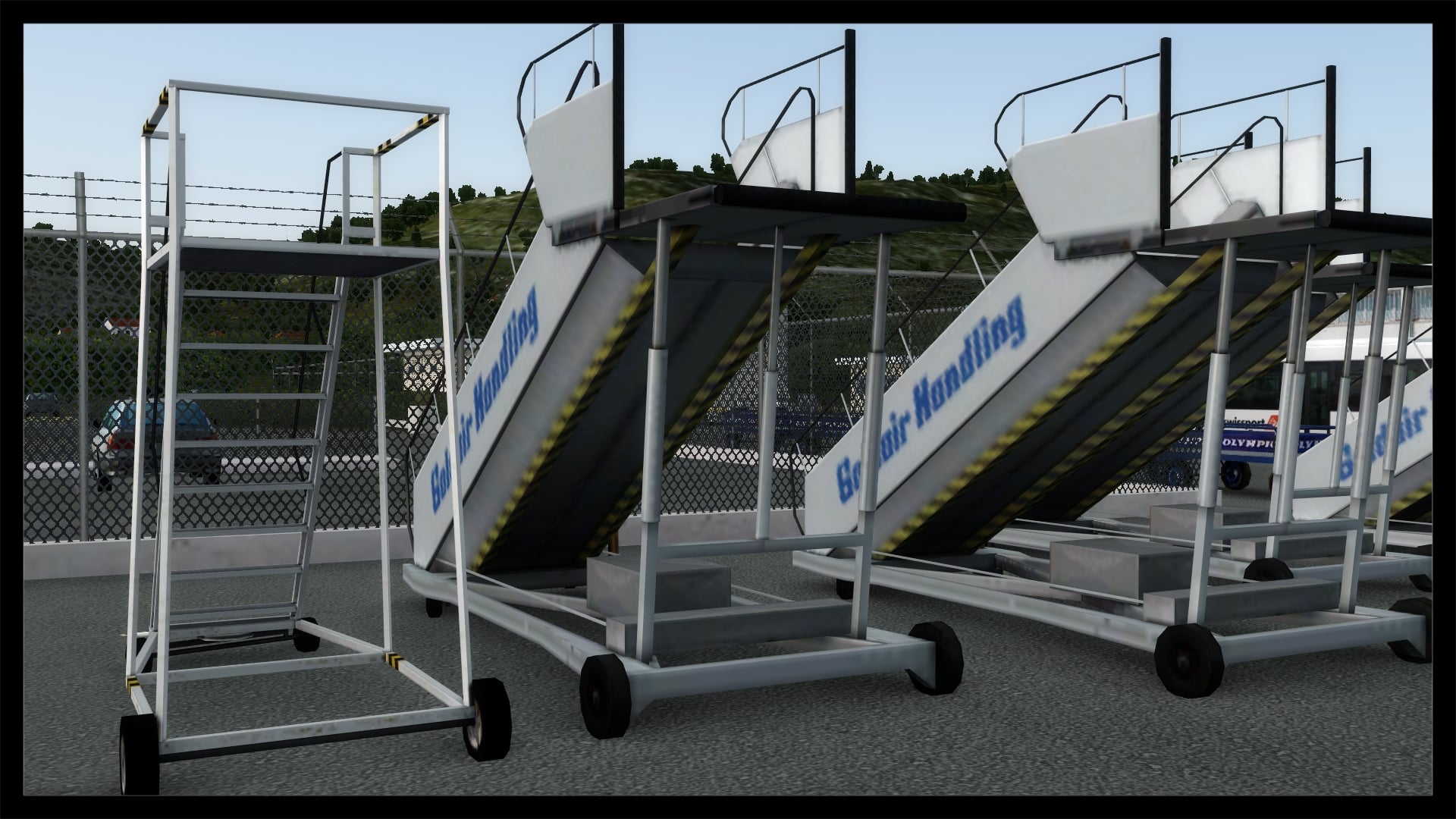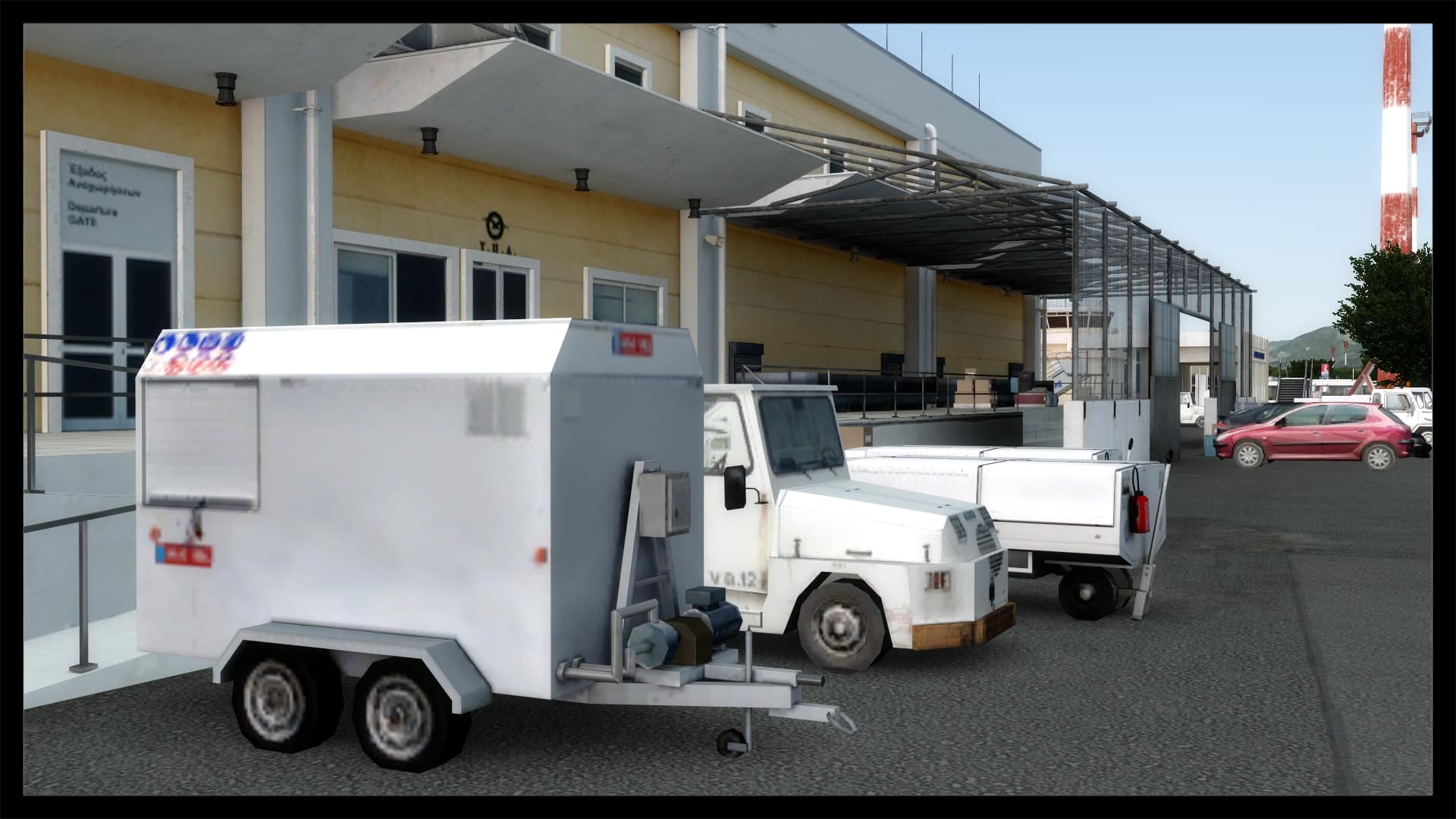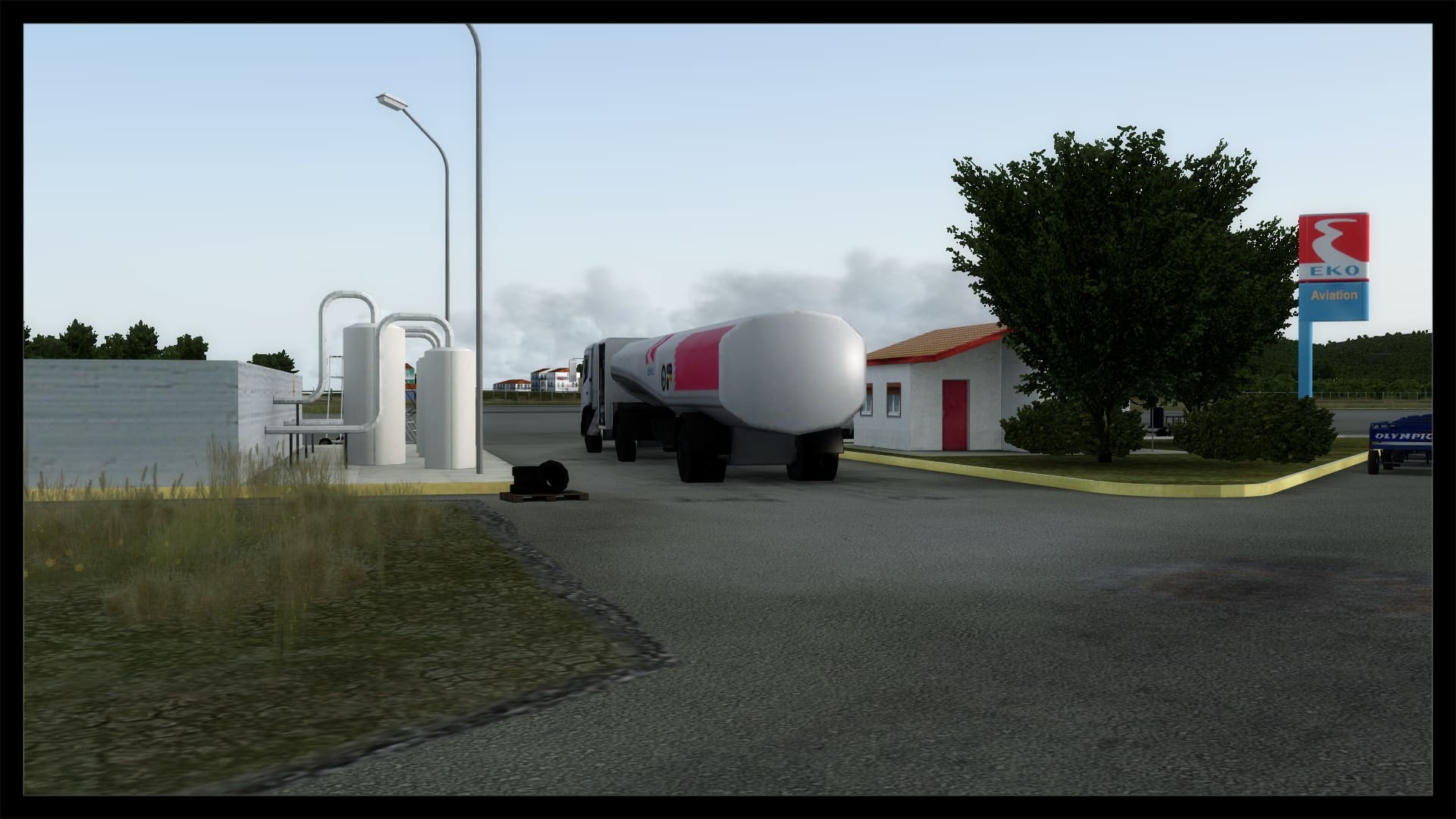 Samos International Airport „Aristarchos of Samos“, so der offizielle Name, kommt in der für kleinere Ferienflughäfen typischen Bauweise daher: Mittige Terminal-Anordnung und die Notwendigkeit, am Landekopf eine 180 Grad-Drehung zu vollziehen um starten zu können. Das Vorfeld fasst ungefähr 6 Boeing 737 und kommt in der Realität mit sehr abgenutzten, kaum sichtbaren Rollwegmarkierungen daher. Der Konfigurator erlaubt hier die Auswahl des Originalzustands, also ohne Markierungen oder eines angepassten Textursets, bei dem Vorfeldmarkierungen vorhanden sind. Die Texturen sind scharf, körnig und strukturiert, sie schaffen es so, ein schönes Betonabbild darzustellen. Dazu kommen Farbabweichungen, Schmutz und sogar kleine Grasbüschel an den Betonfugen.