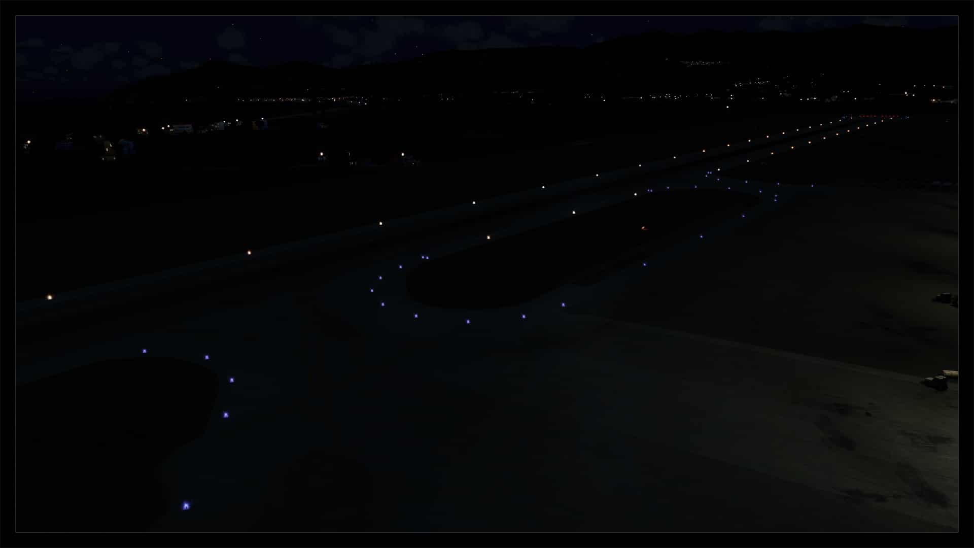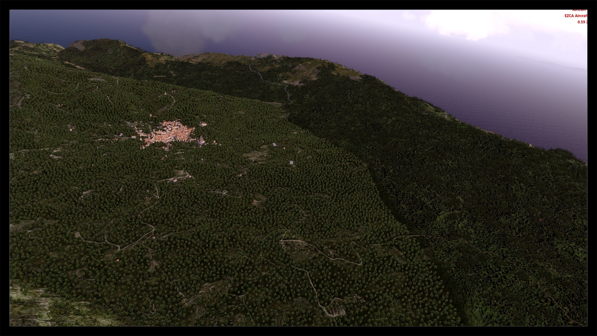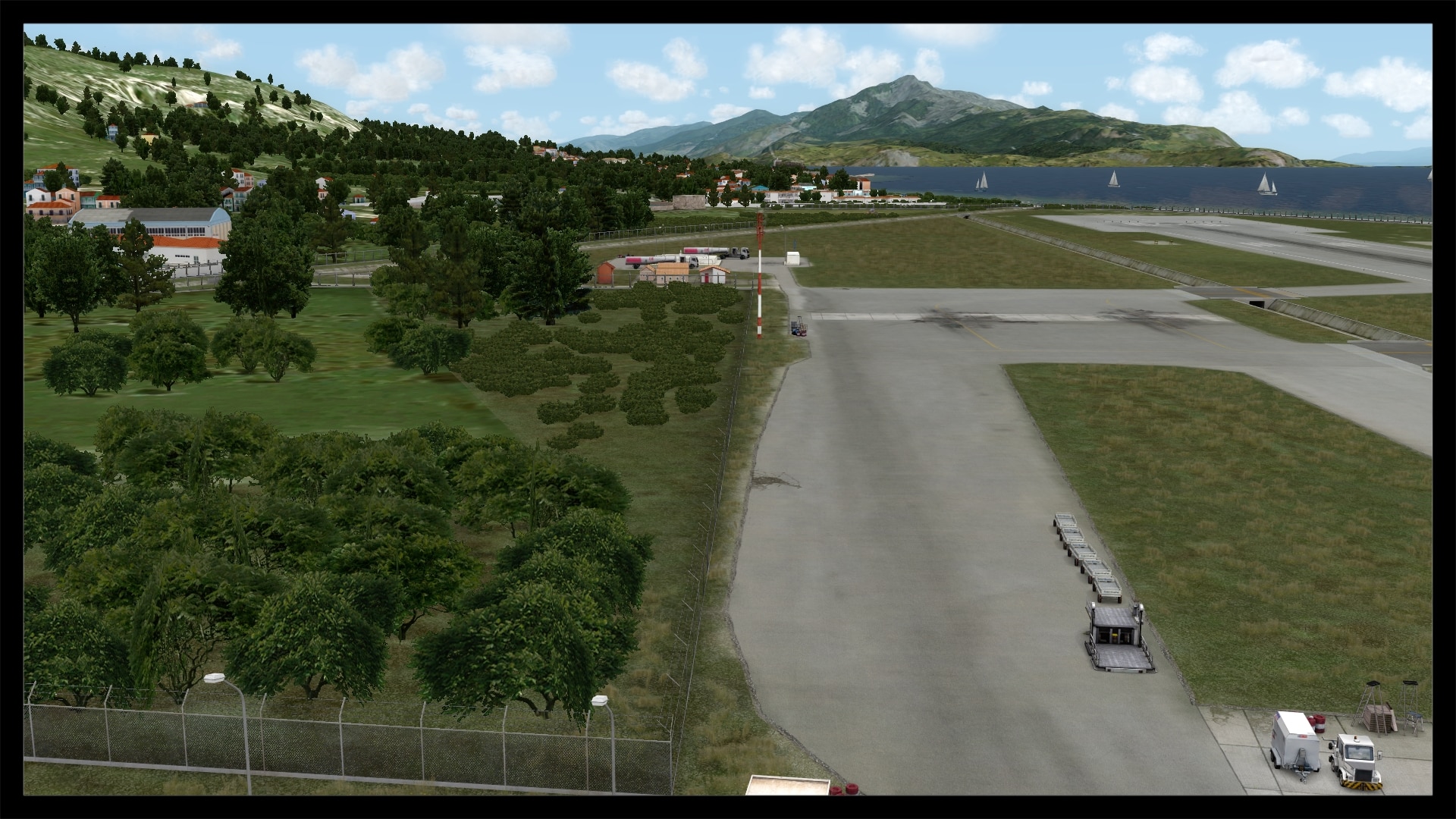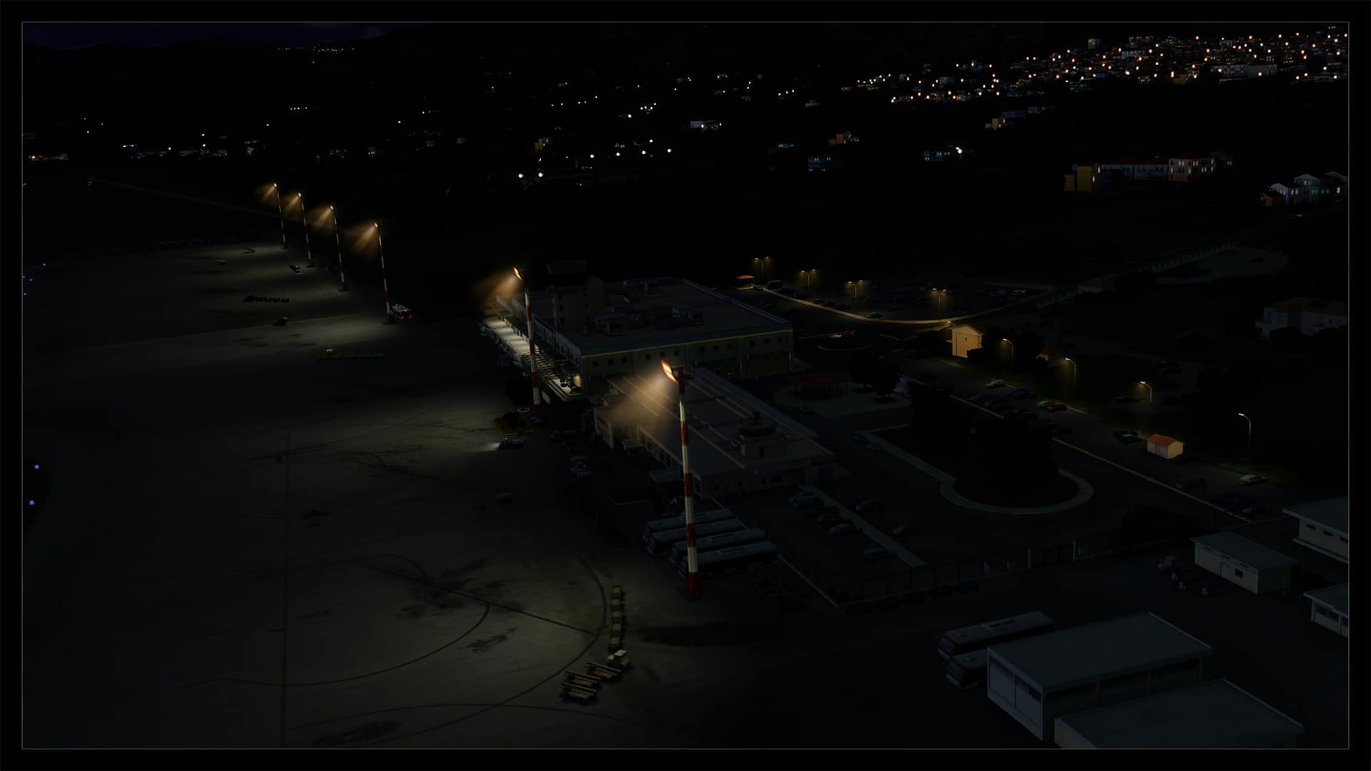 29 Palms haben, neben dem Flughafen, auch den Bereich der Anflüge mitumgesetzt. Zu dem 90 Quadratkilometer großen Luftbild hat 29Palms außerdem das Mesh und die Landklassen der kompletten Insel überarbeitet. Eine komplette Inselumsetzung ist jedoch nicht im Lieferumfang enthalten. Das verwendete Luftbild ist sehr gut und auch die platzierten Objekte sind stimmig und individuell erstellt. Besonders die wichtigen Landmarken im Anflug auf die Bahn 09 sind zu erkennen, dazu zählen das Pier bei „Ireo“, das kleine Dorf „Mili“ und die weißen Lagerhallen im Final. Die Kompatibilität zu Orbx Global und Vector ist gegeben, auch wenn man die Grenze zwischen 29 Palm und Orbx Gebiet aufgrund der Dichte und Farbe der Vegetation erkennt. Allerdings nicht so stark das es massiv stören würde.