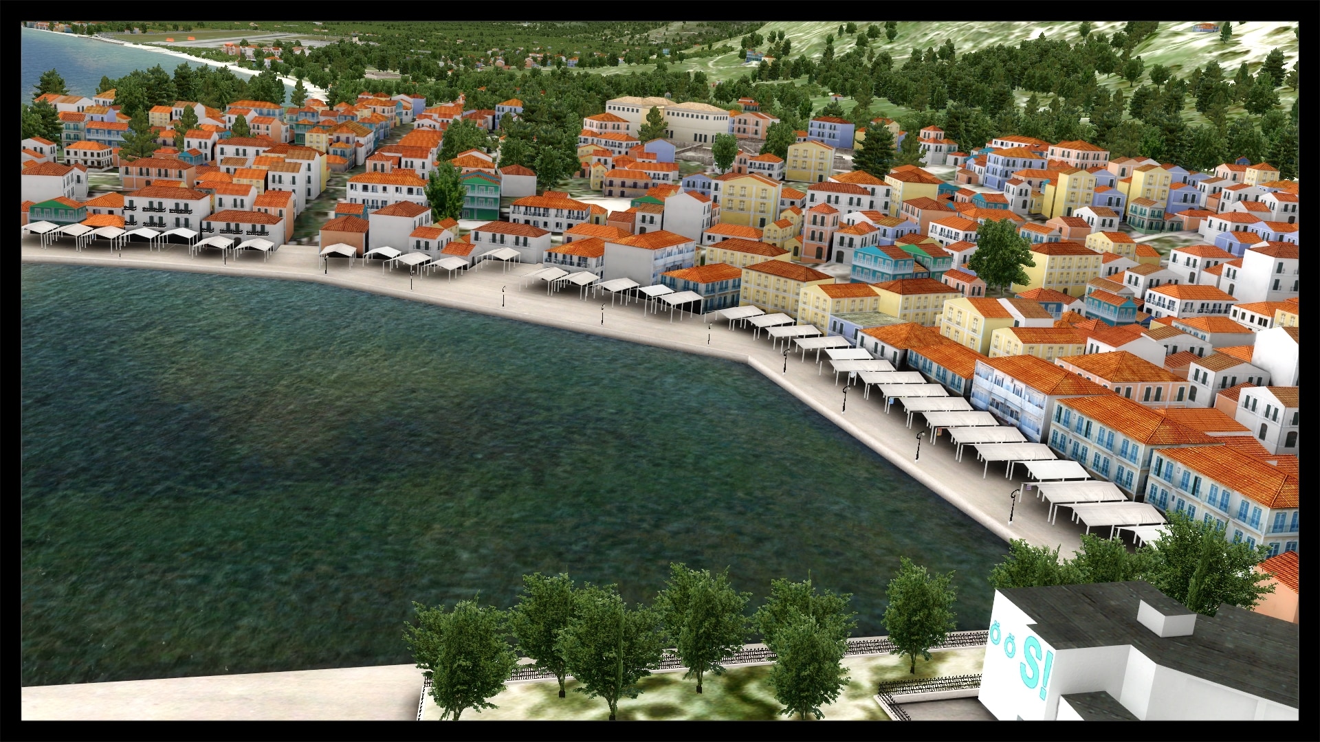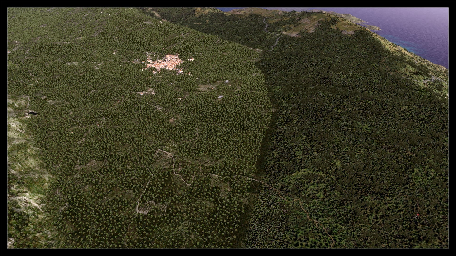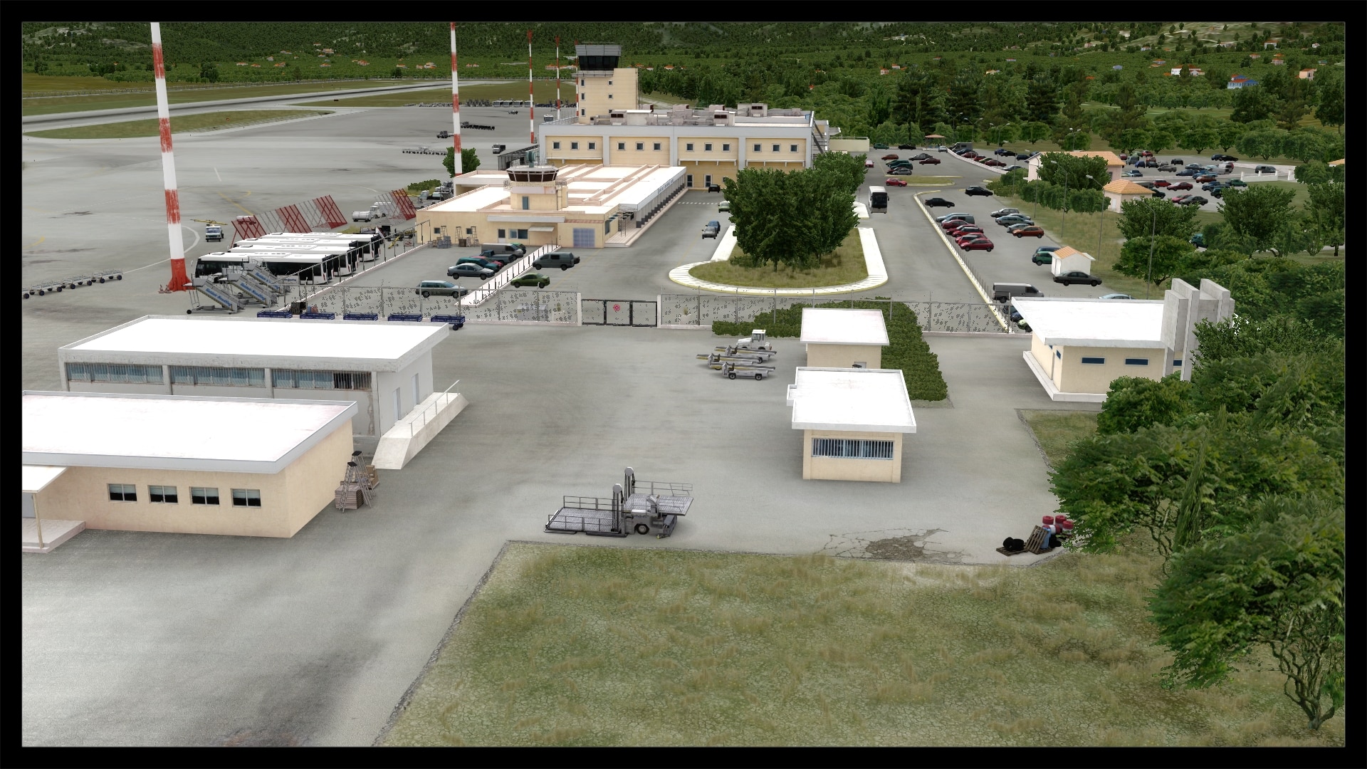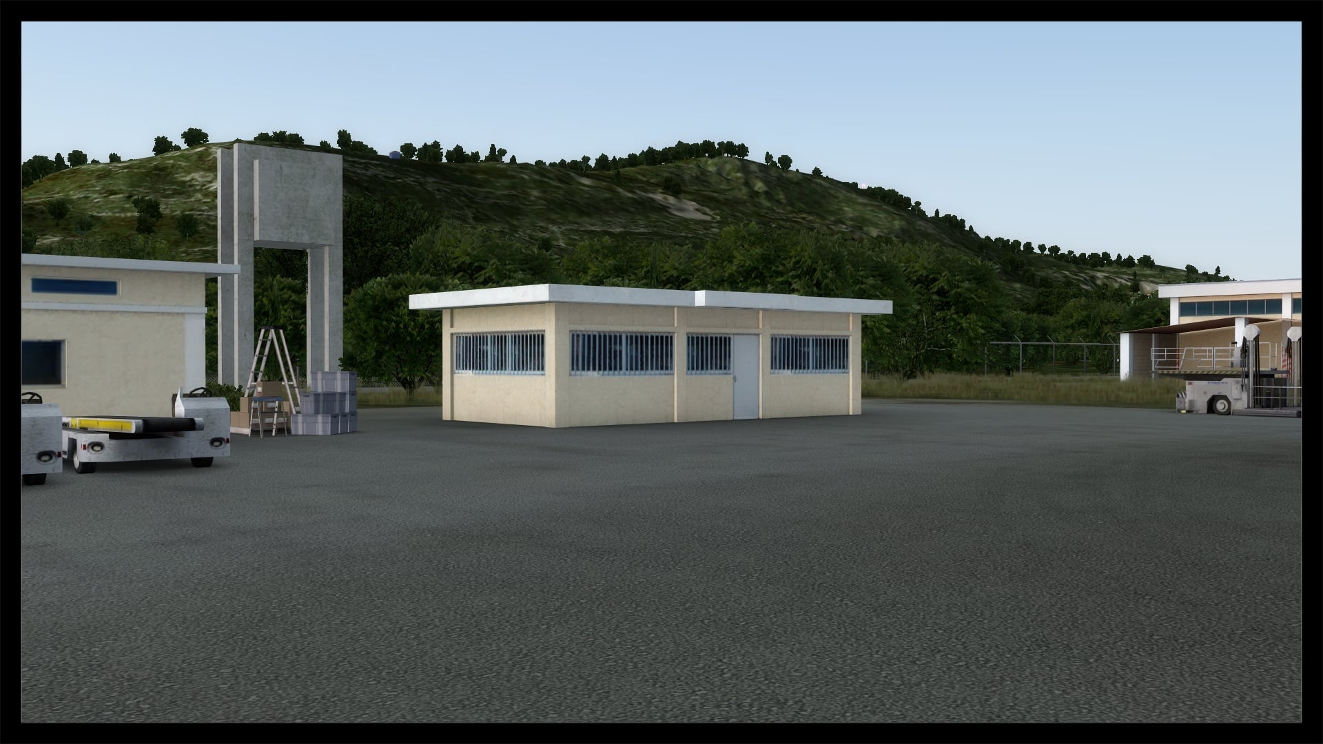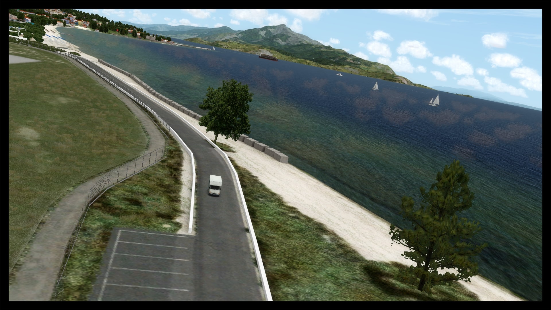 29 Palms haben, neben dem Flughafen, auch den Bereich der Anflüge mitumgesetzt. Zu dem 90 Quadratkilometer großen Luftbild hat 29Palms außerdem das Mesh und die Landklassen der kompletten Insel überarbeitet. Eine komplette Inselumsetzung ist jedoch nicht im Lieferumfang enthalten. Das verwendete Luftbild ist sehr gut und auch die platzierten Objekte sind stimmig und individuell erstellt. Besonders die wichtigen Landmarken im Anflug auf die Bahn 09 sind zu erkennen, dazu zählen das Pier bei „Ireo“, das kleine Dorf „Mili“ und die weißen Lagerhallen im Final. Die Kompatibilität zu Orbx Global und Vector ist gegeben, auch wenn man die Grenze zwischen 29 Palm und Orbx Gebiet aufgrund der Dichte und Farbe der Vegetation erkennt. Allerdings nicht so stark das es massiv stören würde.