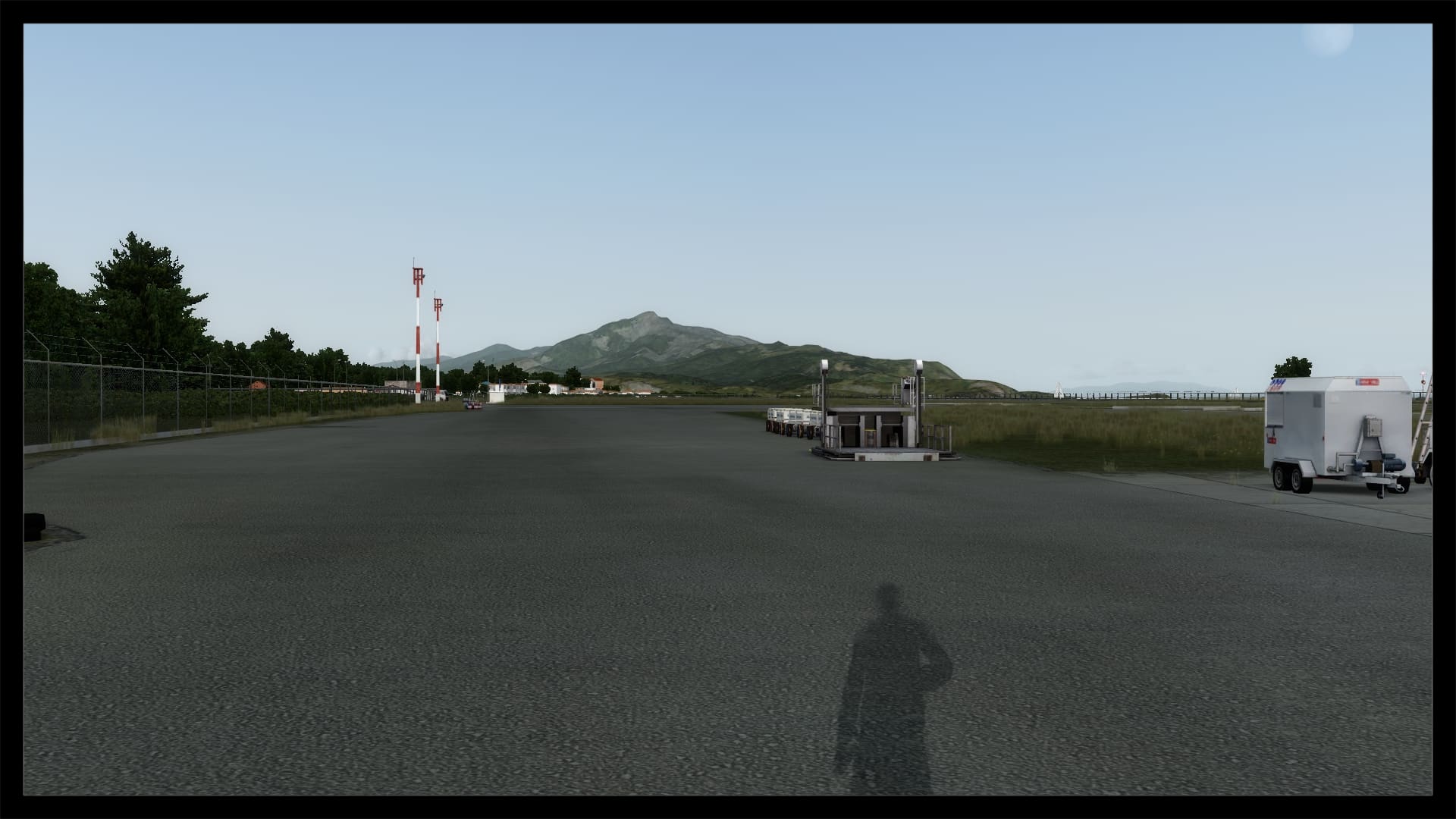 Das Luftbild des Flughafengeländes passt sich gut in das farbgebende Gespann, bestehend aus Orbx Global und der beinhalteten 29Palms Teilumsetzung der Insel ein. Die Auflösung ist sehr gut und per Konfigurator mit 3D Gras bepflanzbar. Eine Performanceeinbuße ist dabei nicht festzustellen. Sehr schön sind auch die Grasnarben aus Kies gestaltet, welche den Übergang von Beton zu Graß weich und nicht abgehackt erscheinen lassen.