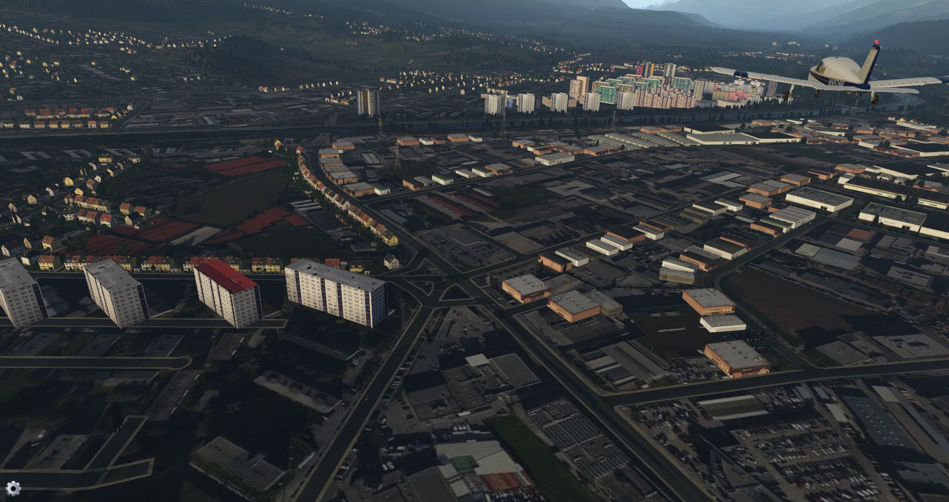 In Bezug auf die Stadt setzt man auf das neuen europäische AutoGen. Die Gebäudedichte wirkt zwar nicht so hoch wie zu X-Plane 10 Zeiten, dafür hat der Rechner jetzt auch deutlich mehr als 20 fps. Das war früher nur in größeren Abstand der Fall. Zum einen durch die zahlreichen Gebäude, wie auch die übergroßen Fototexturen. Für derart große Texturen empfiehlt Laminar eigentlich ein eigenes Mesh, das so etwas deutlich Resourcen sparender anzeigen kann.