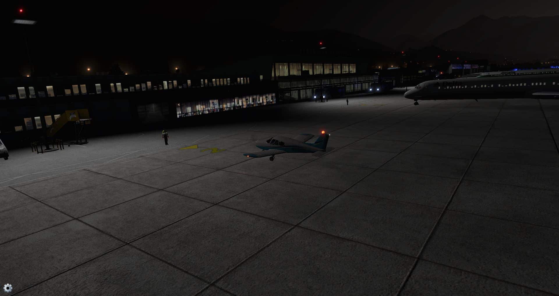 Wenden wir den Blick nun auf den Flughafen selbst. Die Standplätze sind nun korrekt einzelnen Flugzeugklassen zugeteilt. So finden wir uns mit einem kleinen GA Flugzeug, wie der Cherokee weiter außen wieder.