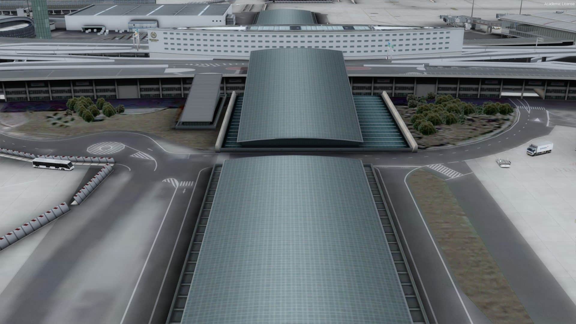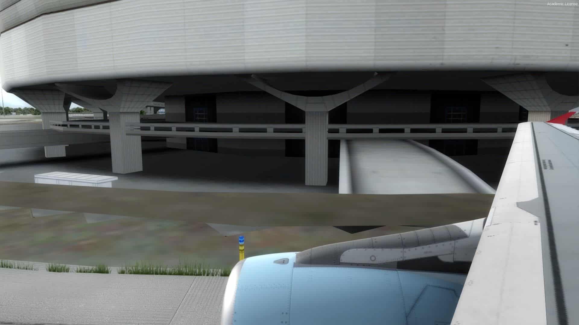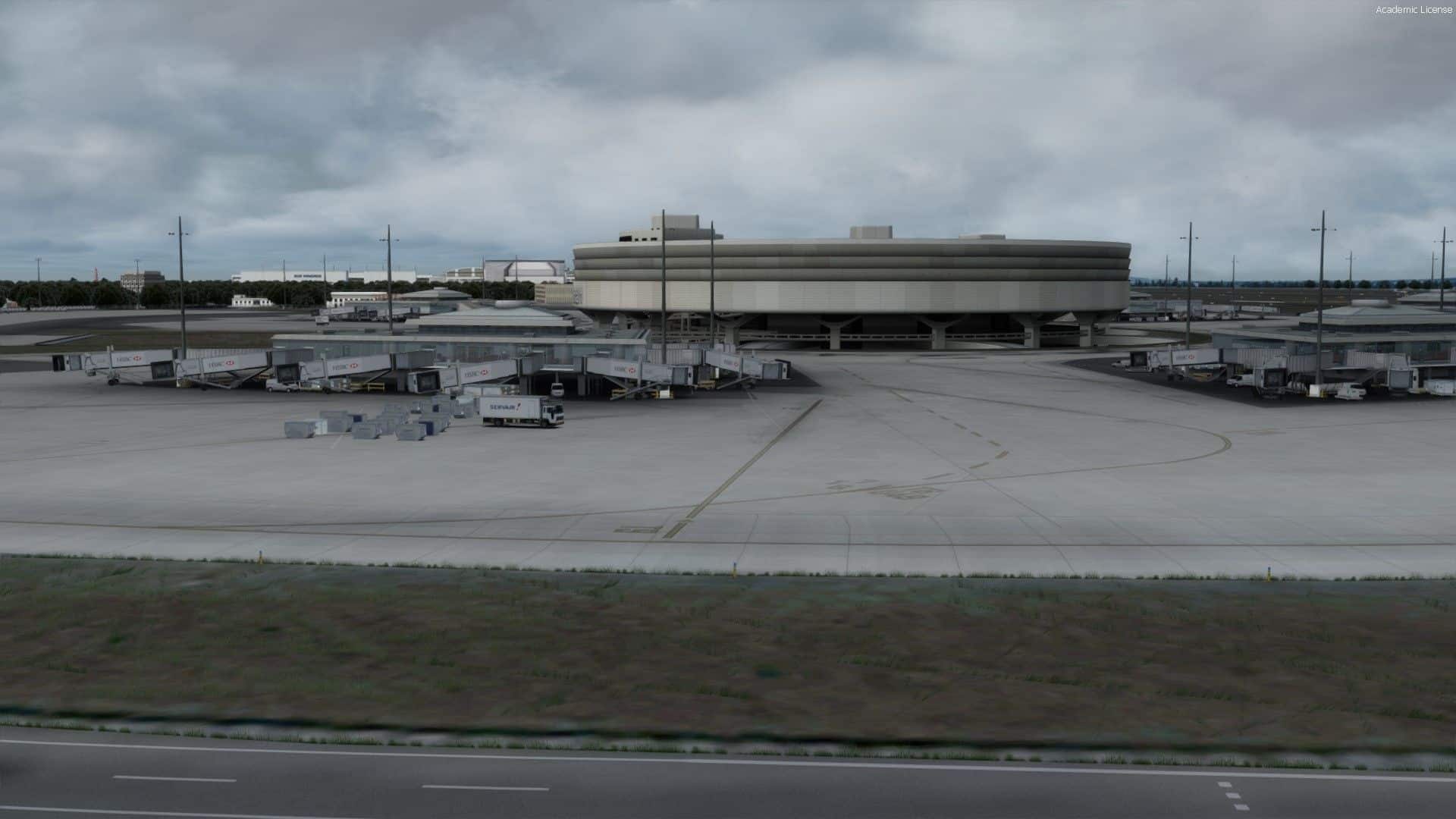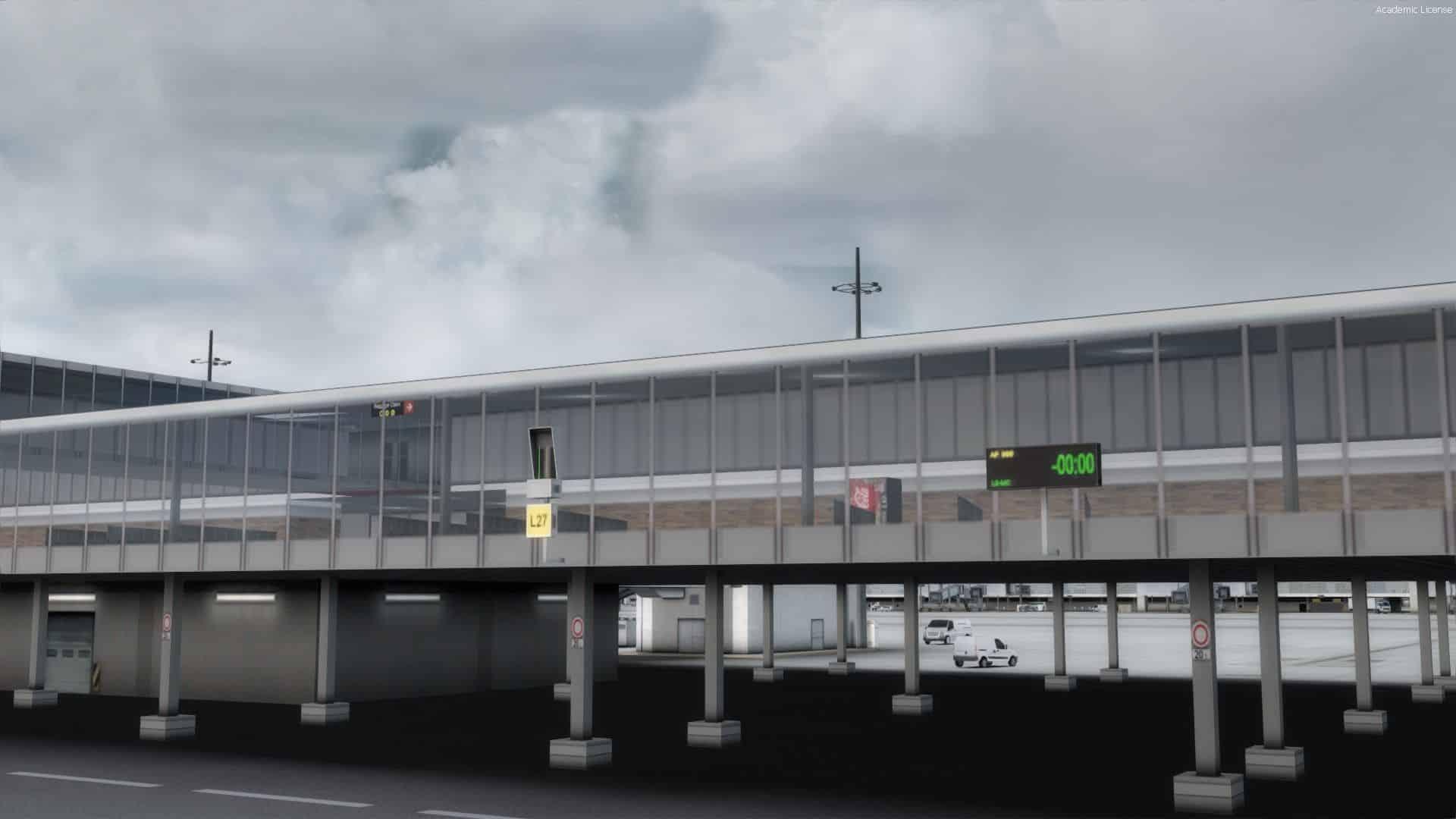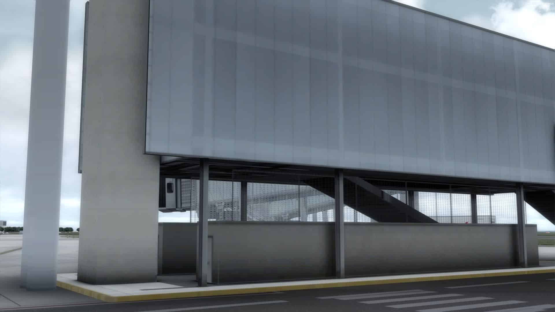Die sogenannte Landside, der Bereich in dem Passagiere mit Auto, Taxi oder Bus ankommen bzw. abgeholt werden, ist bei dieser speziellen Bauform des Terminals direkt vom Rollfeld einzusehen. Sie befindet sich unterhalb des runden Gebäudes, ist aber von Taxi2Gate nicht mit besonderen Einzelheiten ausgestattet worden. Die Frage ob derartige Bereiche mit aufwendigeren Details dekortiert werden sollten, ist oftmals ein großer Streitpunkt bei neuen Szenerien. Eine Option (beispielsweise in einem Konfigurationstool o.ä.) für mehr Details wie zum Bespiel Fahrzeuge oder Laternen, die den Bereich lebendiger machen, hätte meiner Meinung nach einen guten Kompromiss zwischen Performance und „Eye-Candy“ dargestellt.