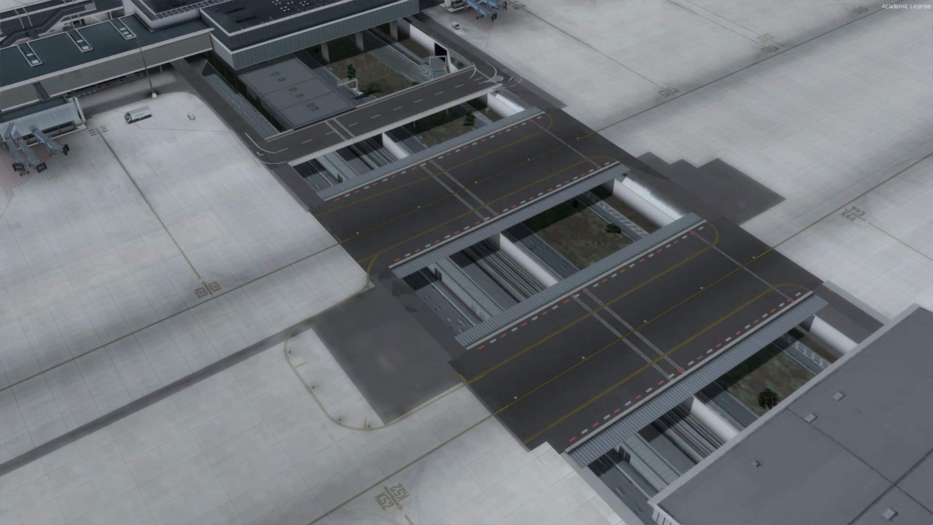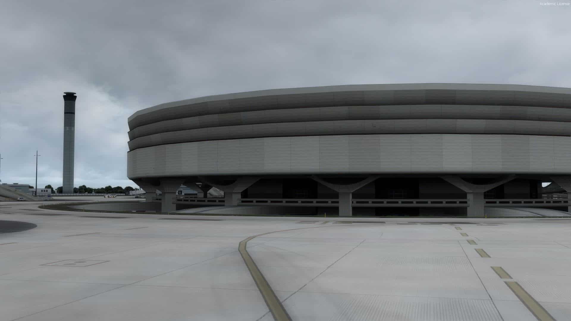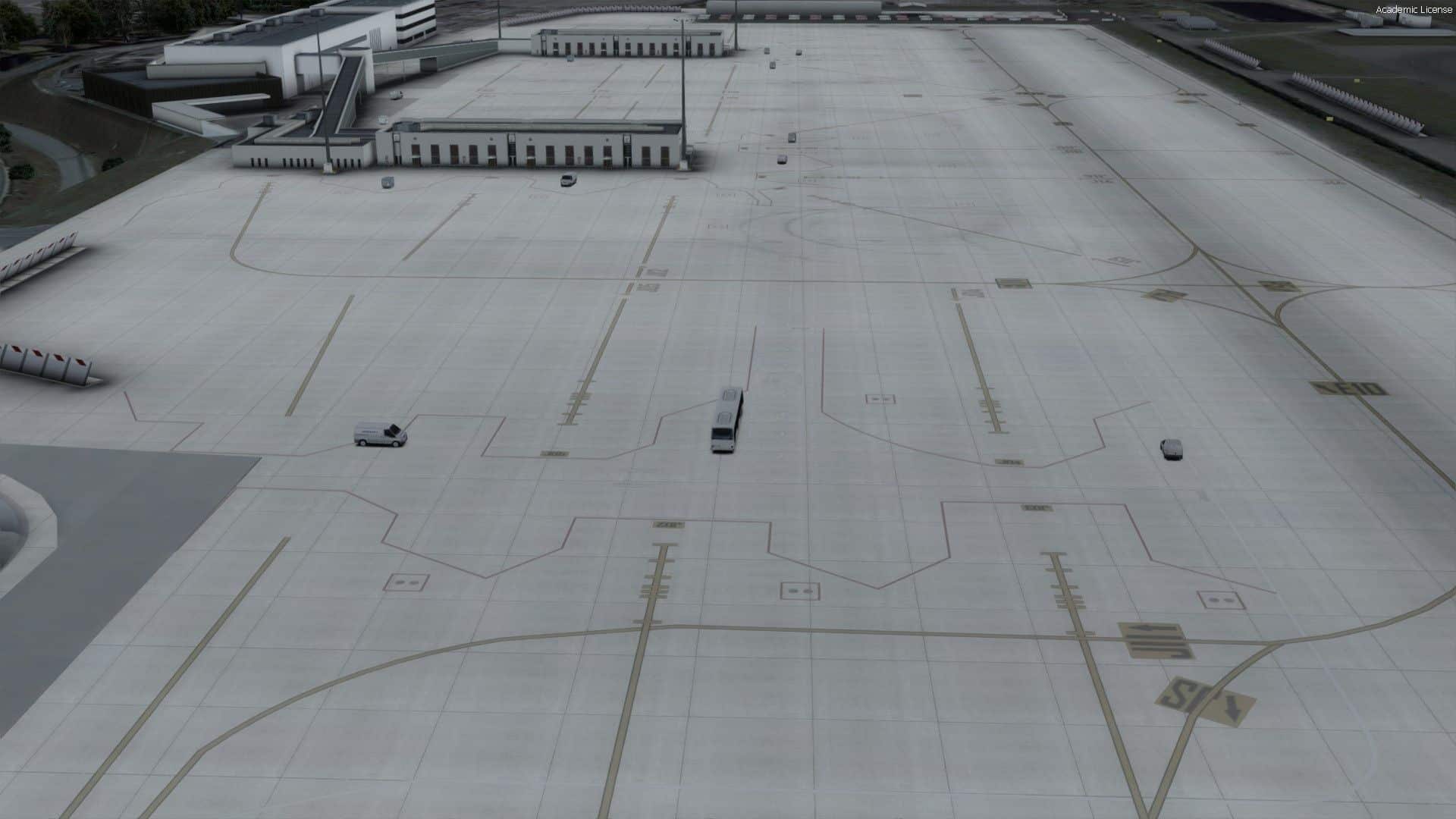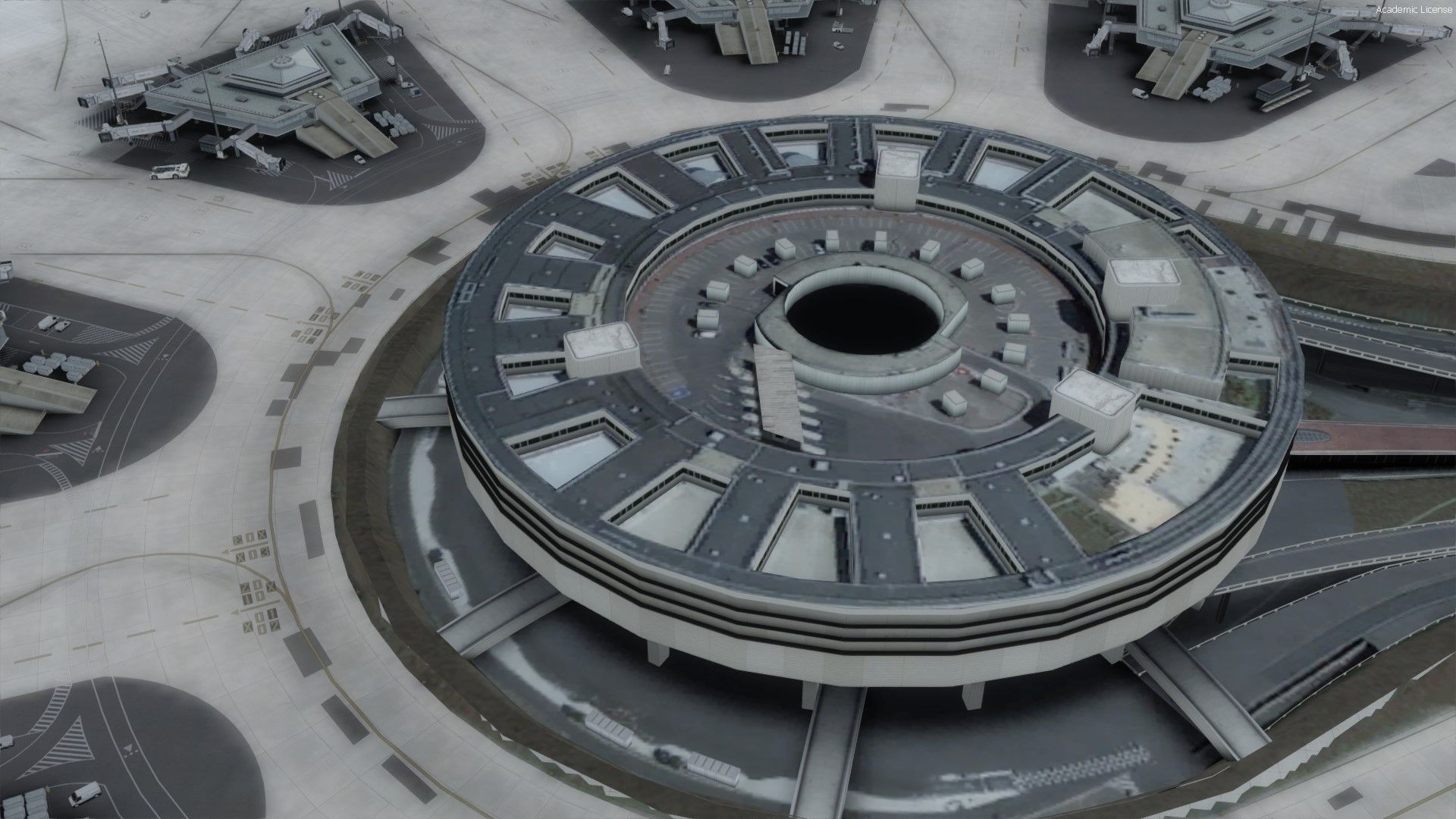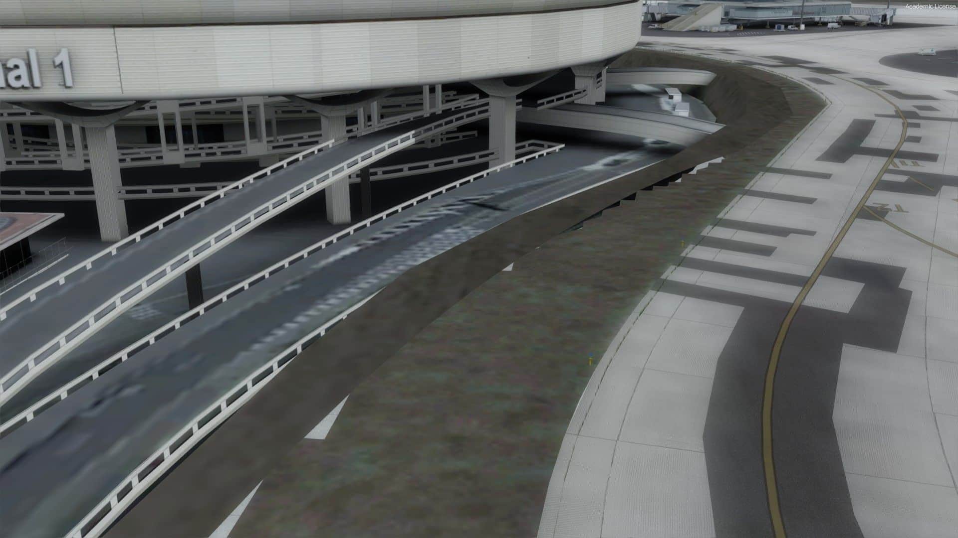 Die sogenannte Landside, der Bereich in dem Passagiere mit Auto, Taxi oder Bus ankommen bzw. abgeholt werden, ist bei dieser speziellen Bauform des Terminals direkt vom Rollfeld einzusehen. Sie befindet sich unterhalb des runden Gebäudes, ist aber von Taxi2Gate nicht mit besonderen Einzelheiten ausgestattet worden. Die Frage ob derartige Bereiche mit aufwendigeren Details dekortiert werden sollten, ist oftmals ein großer Streitpunkt bei neuen Szenerien. Eine Option (beispielsweise in einem Konfigurationstool o.ä.) für mehr Details wie zum Bespiel Fahrzeuge oder Laternen, die den Bereich lebendiger machen, hätte meiner Meinung nach einen guten Kompromiss zwischen Performance und „Eye-Candy“ dargestellt.