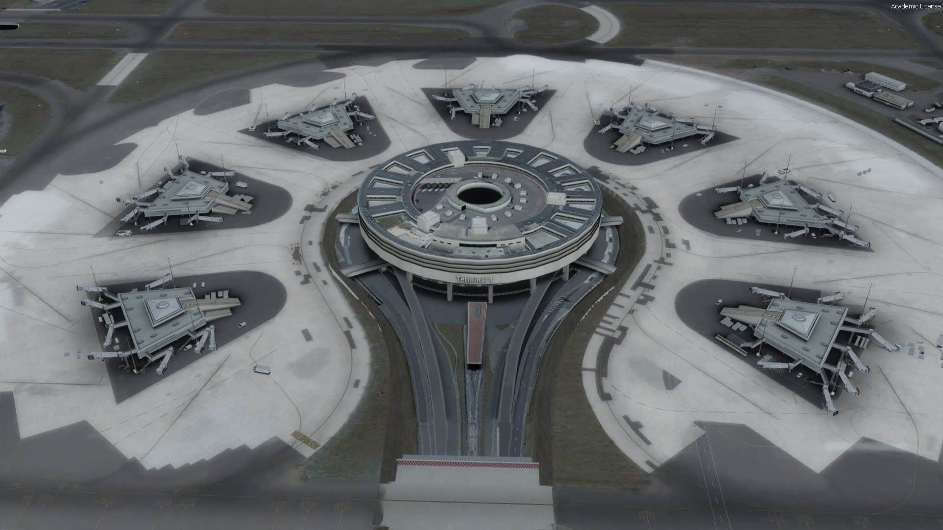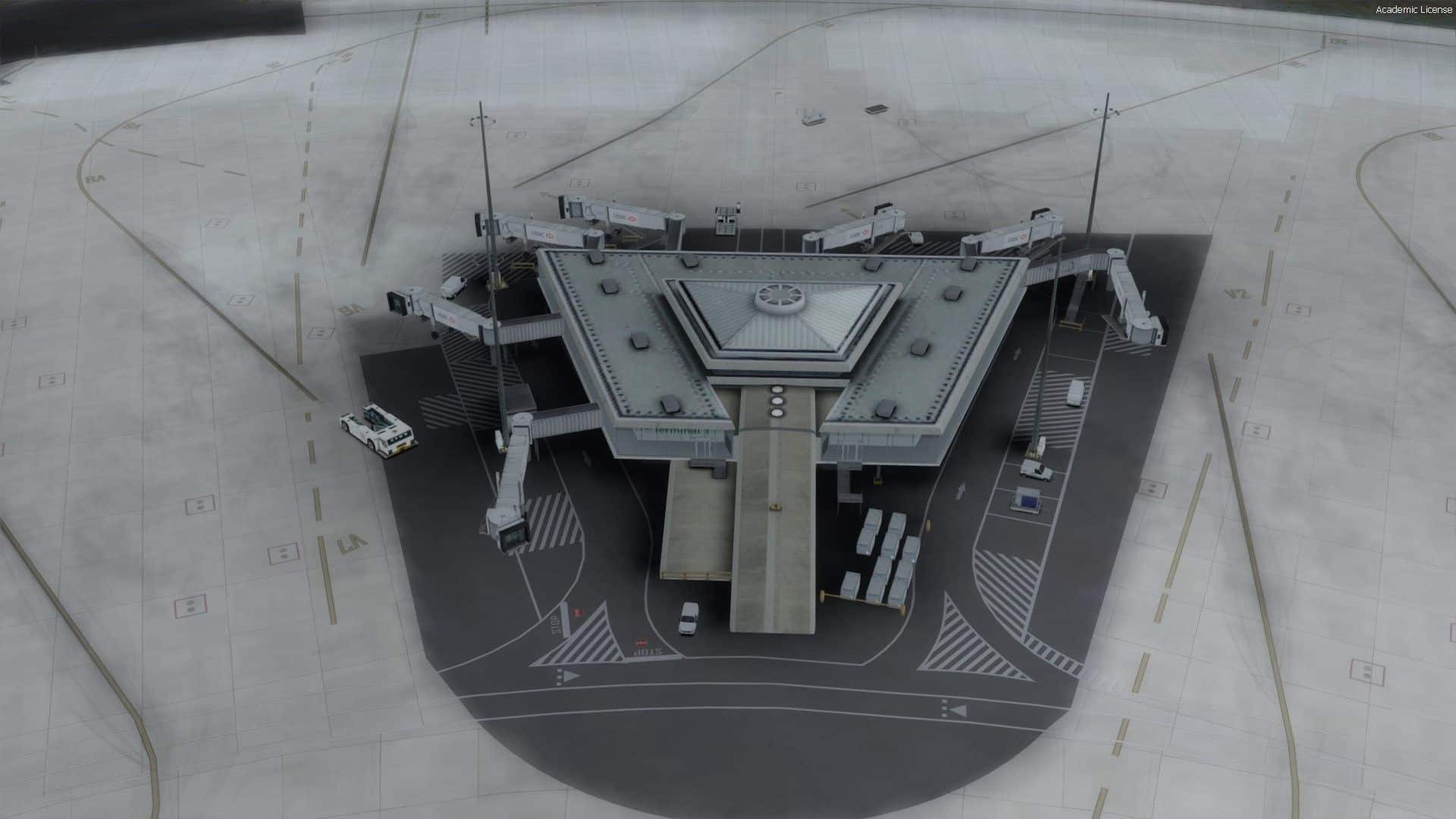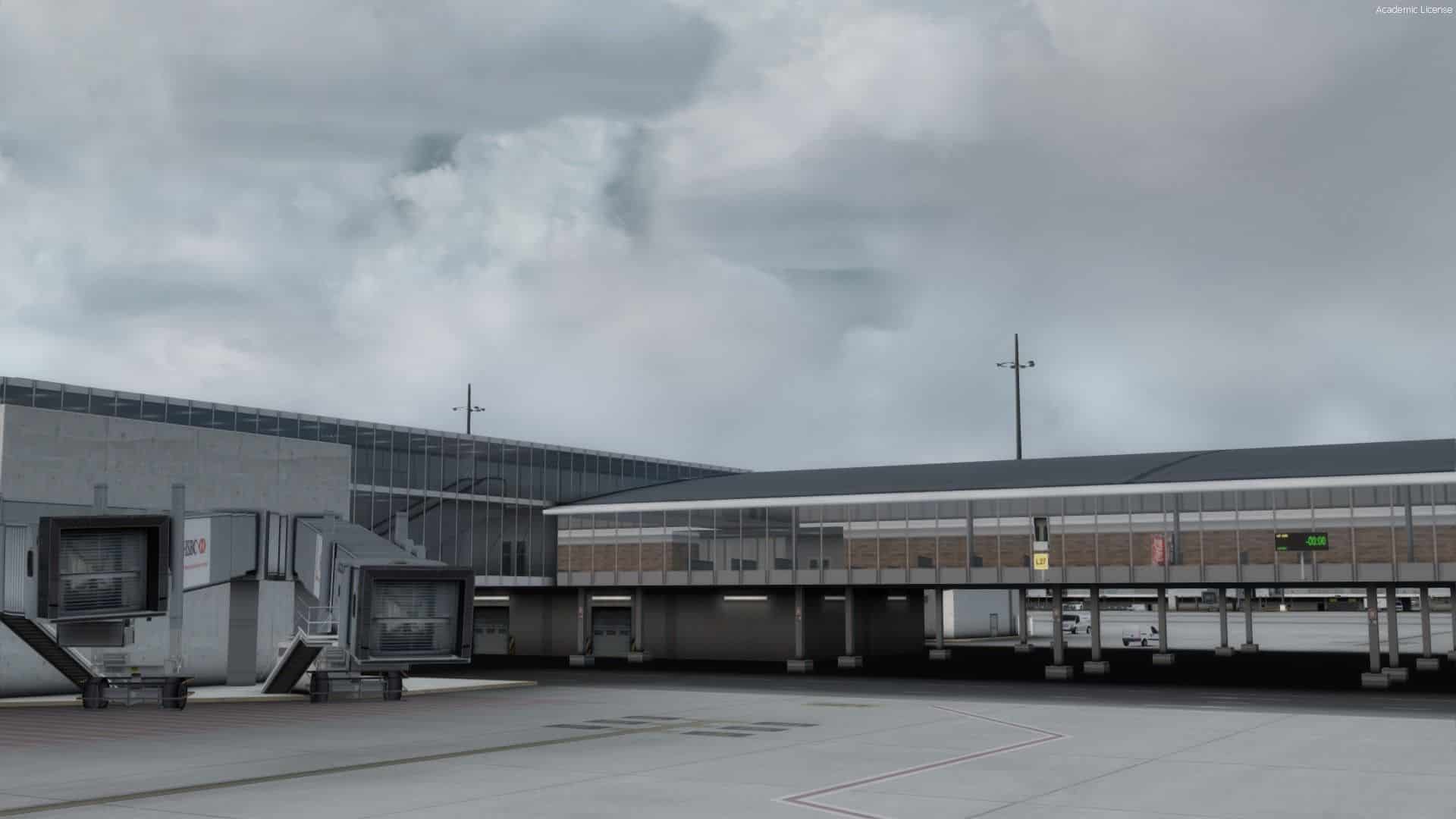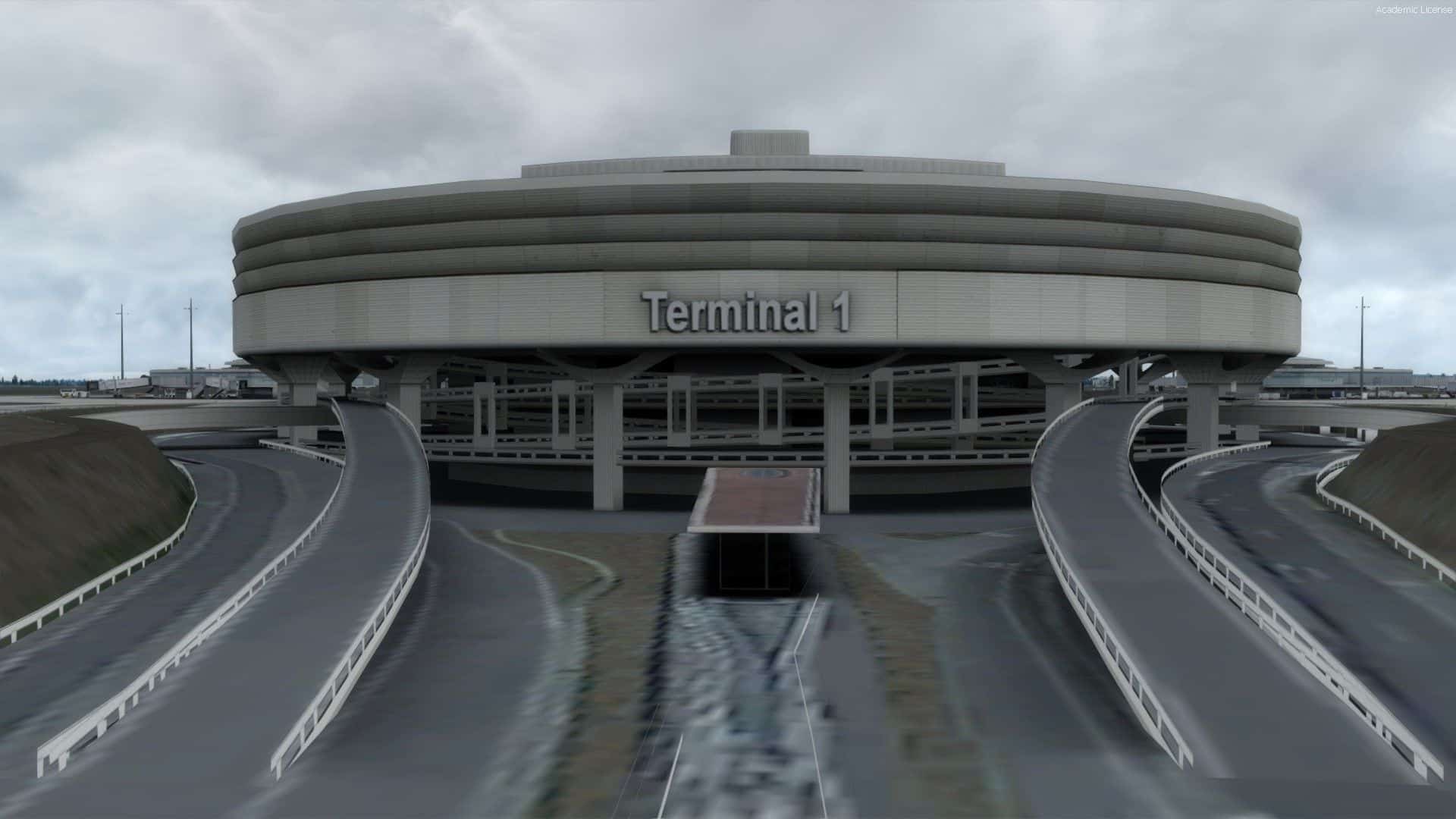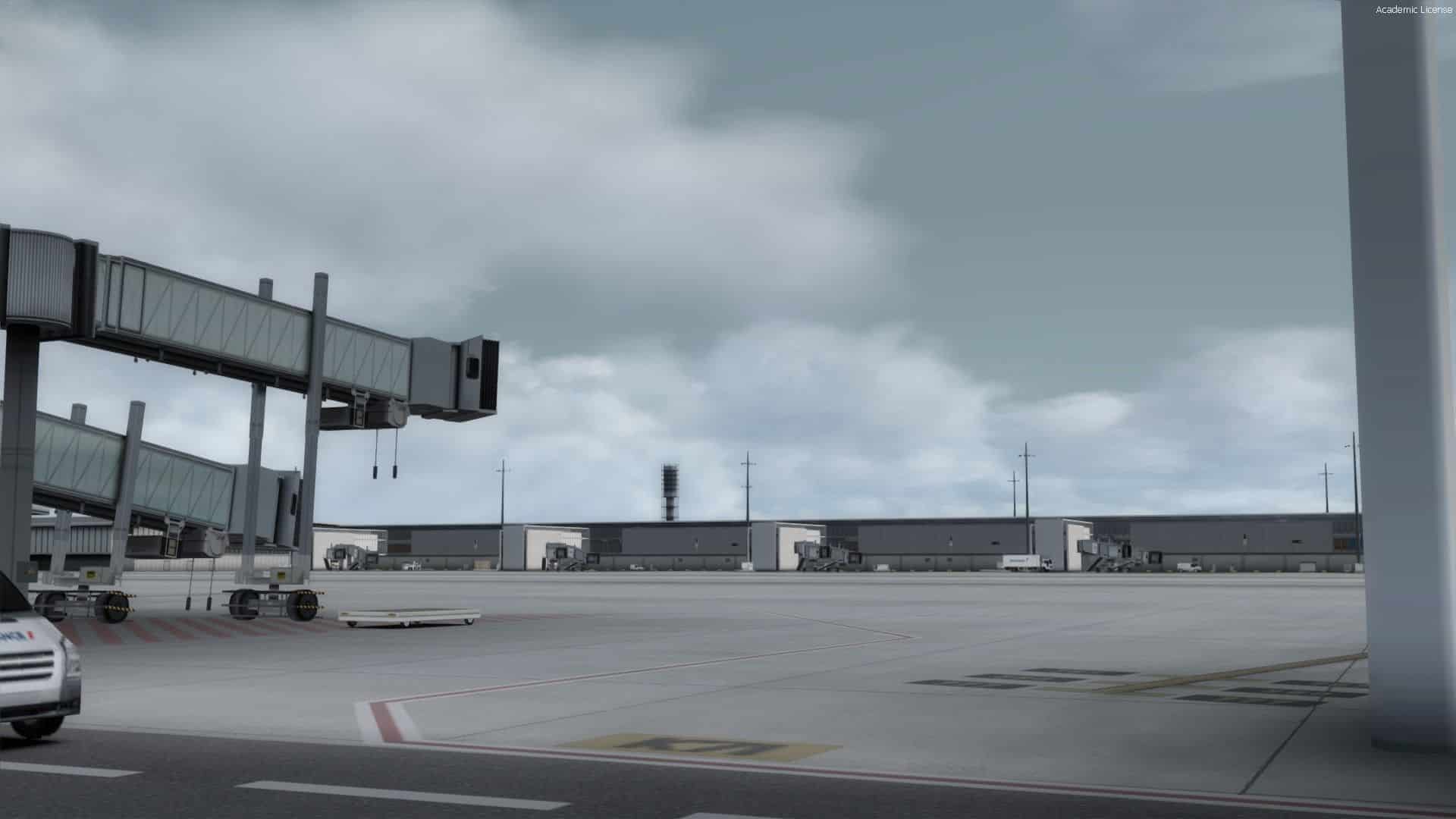 Die sogenannte Landside, der Bereich in dem Passagiere mit Auto, Taxi oder Bus ankommen bzw. abgeholt werden, ist bei dieser speziellen Bauform des Terminals direkt vom Rollfeld einzusehen. Sie befindet sich unterhalb des runden Gebäudes, ist aber von Taxi2Gate nicht mit besonderen Einzelheiten ausgestattet worden. Die Frage ob derartige Bereiche mit aufwendigeren Details dekortiert werden sollten, ist oftmals ein großer Streitpunkt bei neuen Szenerien. Eine Option (beispielsweise in einem Konfigurationstool o.ä.) für mehr Details wie zum Bespiel Fahrzeuge oder Laternen, die den Bereich lebendiger machen, hätte meiner Meinung nach einen guten Kompromiss zwischen Performance und „Eye-Candy“ dargestellt.
