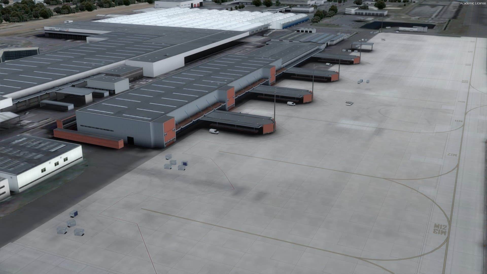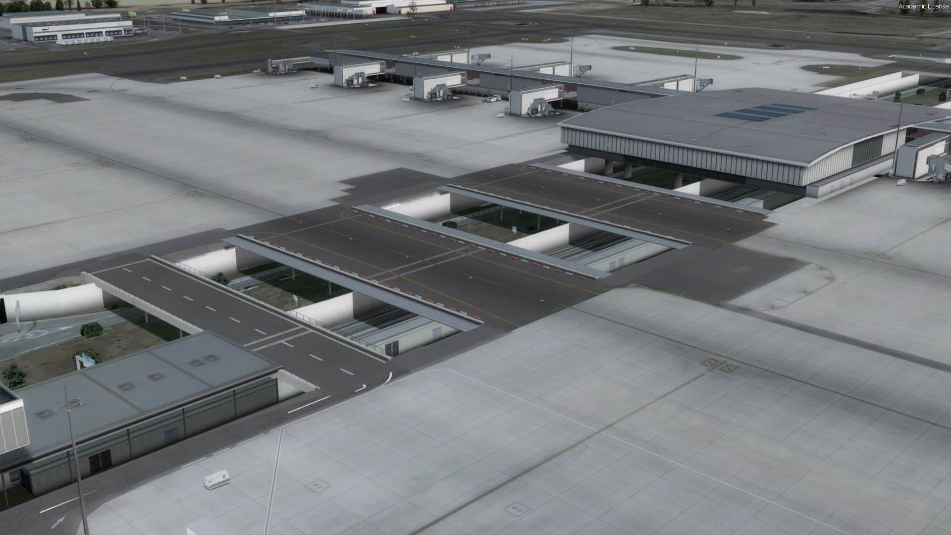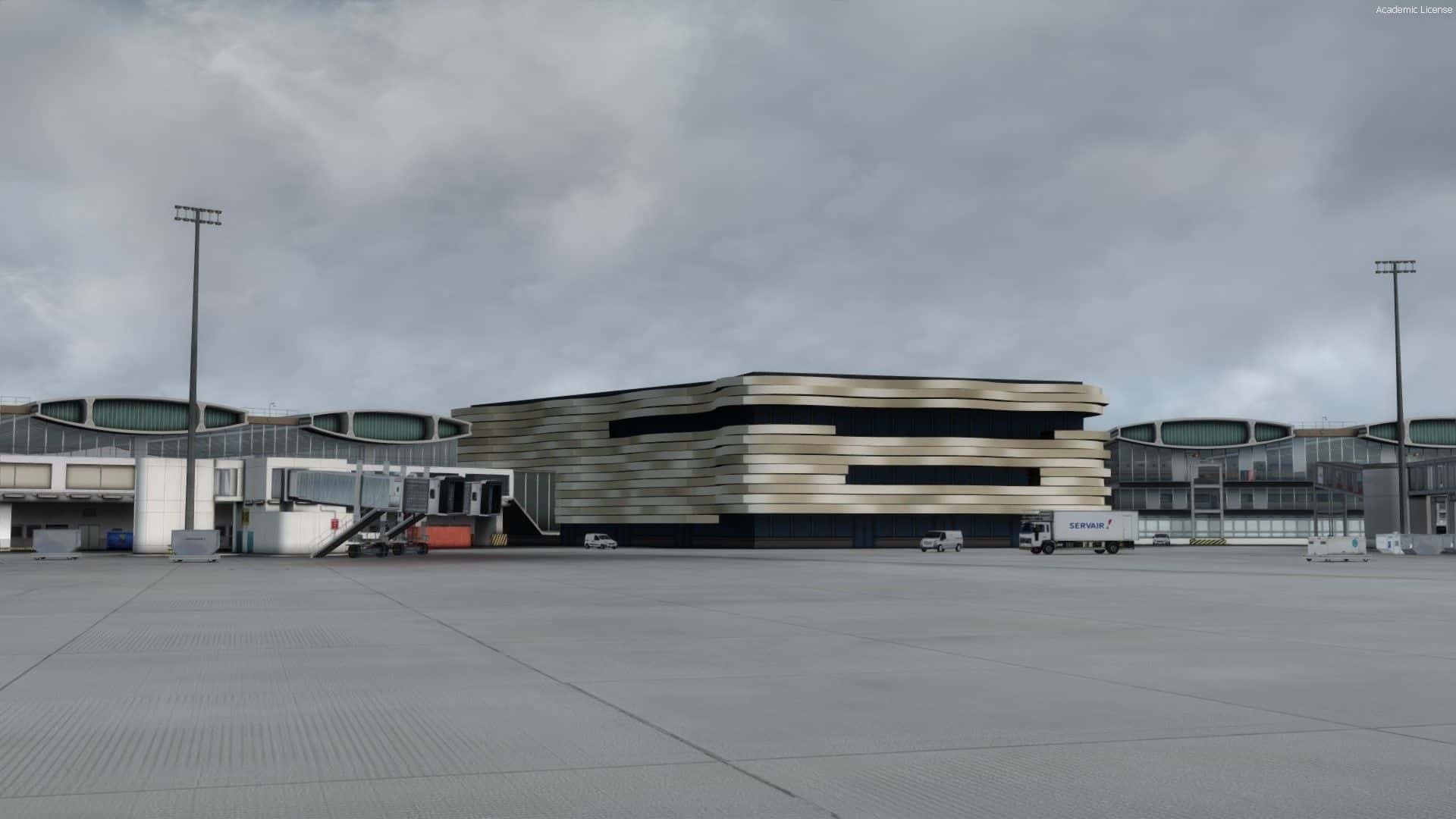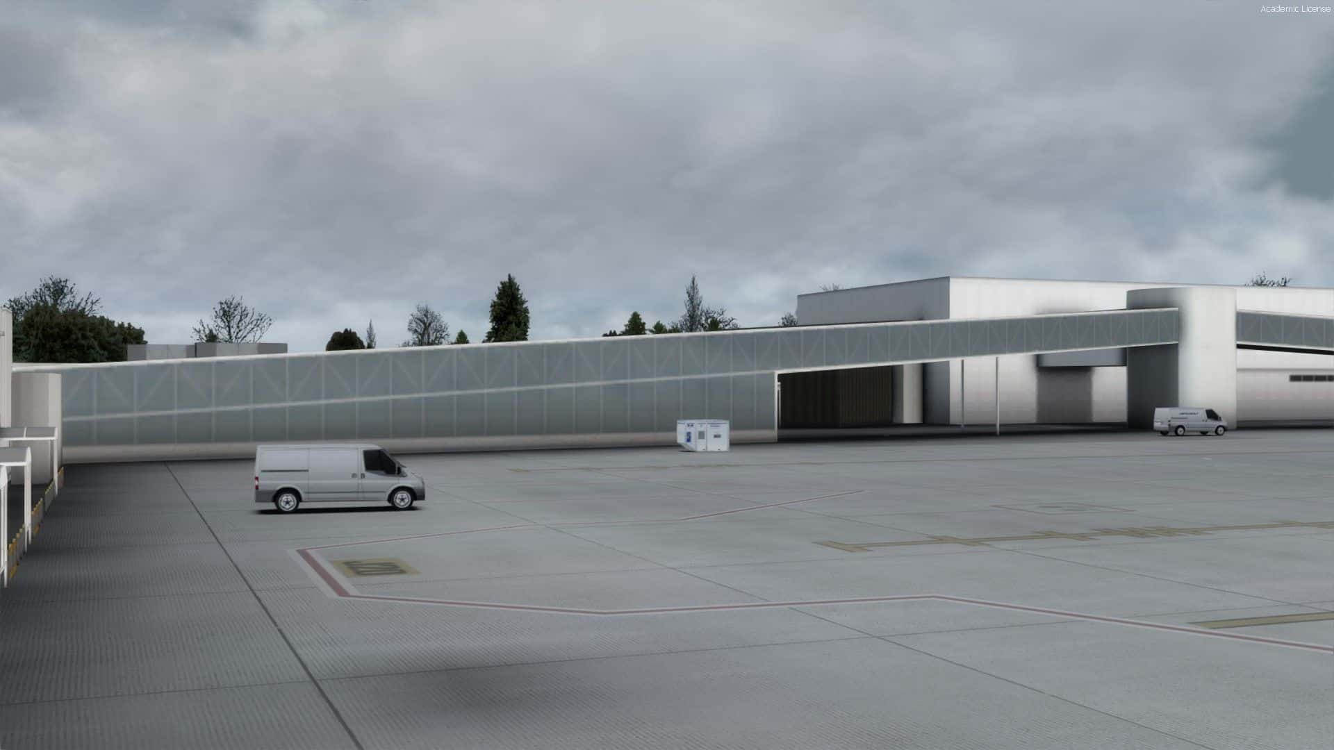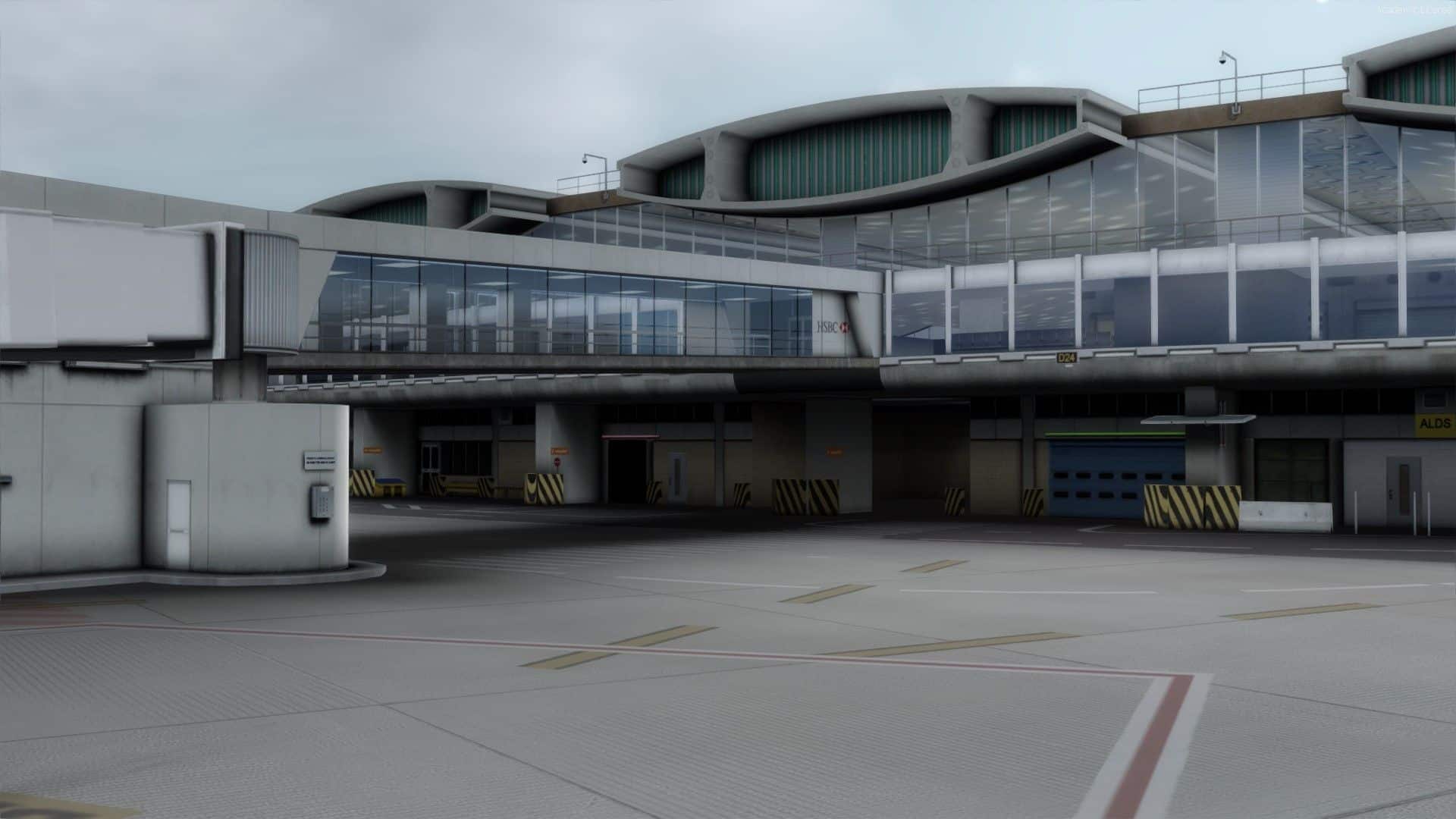 Die sogenannte Landside, der Bereich in dem Passagiere mit Auto, Taxi oder Bus ankommen bzw. abgeholt werden, ist bei dieser speziellen Bauform des Terminals direkt vom Rollfeld einzusehen. Sie befindet sich unterhalb des runden Gebäudes, ist aber von Taxi2Gate nicht mit besonderen Einzelheiten ausgestattet worden. Die Frage ob derartige Bereiche mit aufwendigeren Details dekortiert werden sollten, ist oftmals ein großer Streitpunkt bei neuen Szenerien. Eine Option (beispielsweise in einem Konfigurationstool o.ä.) für mehr Details wie zum Bespiel Fahrzeuge oder Laternen, die den Bereich lebendiger machen, hätte meiner Meinung nach einen guten Kompromiss zwischen Performance und „Eye-Candy“ dargestellt.
