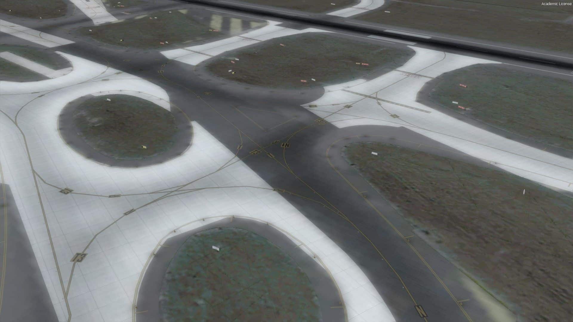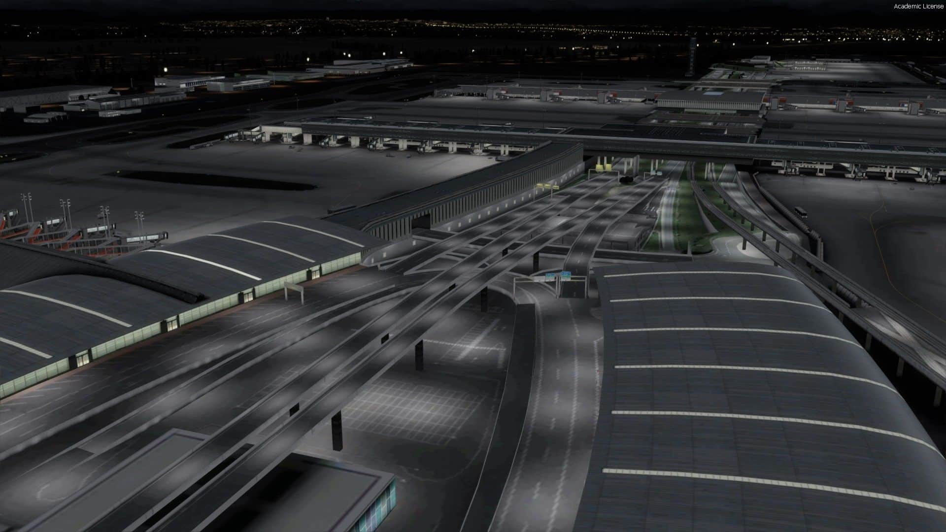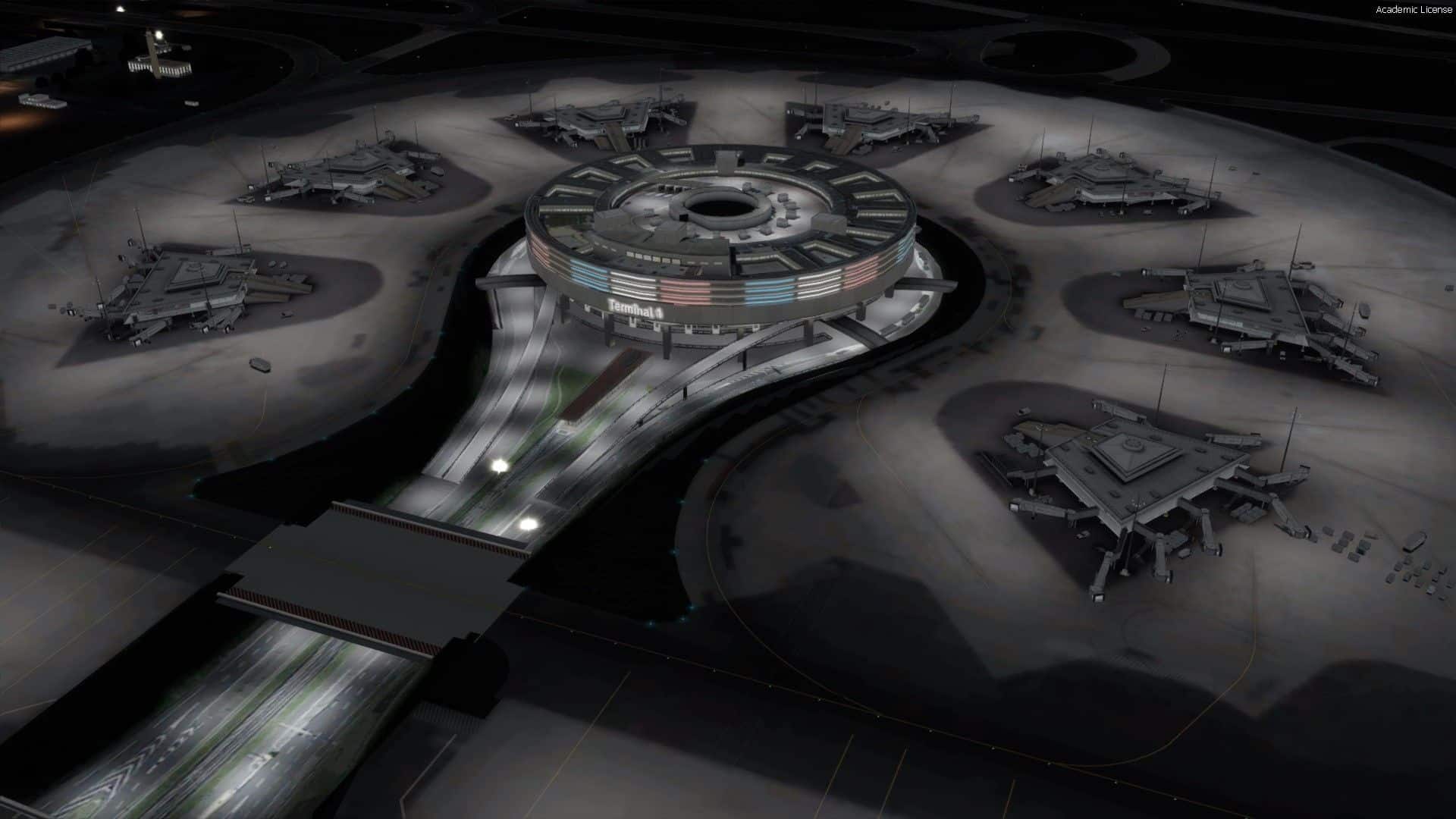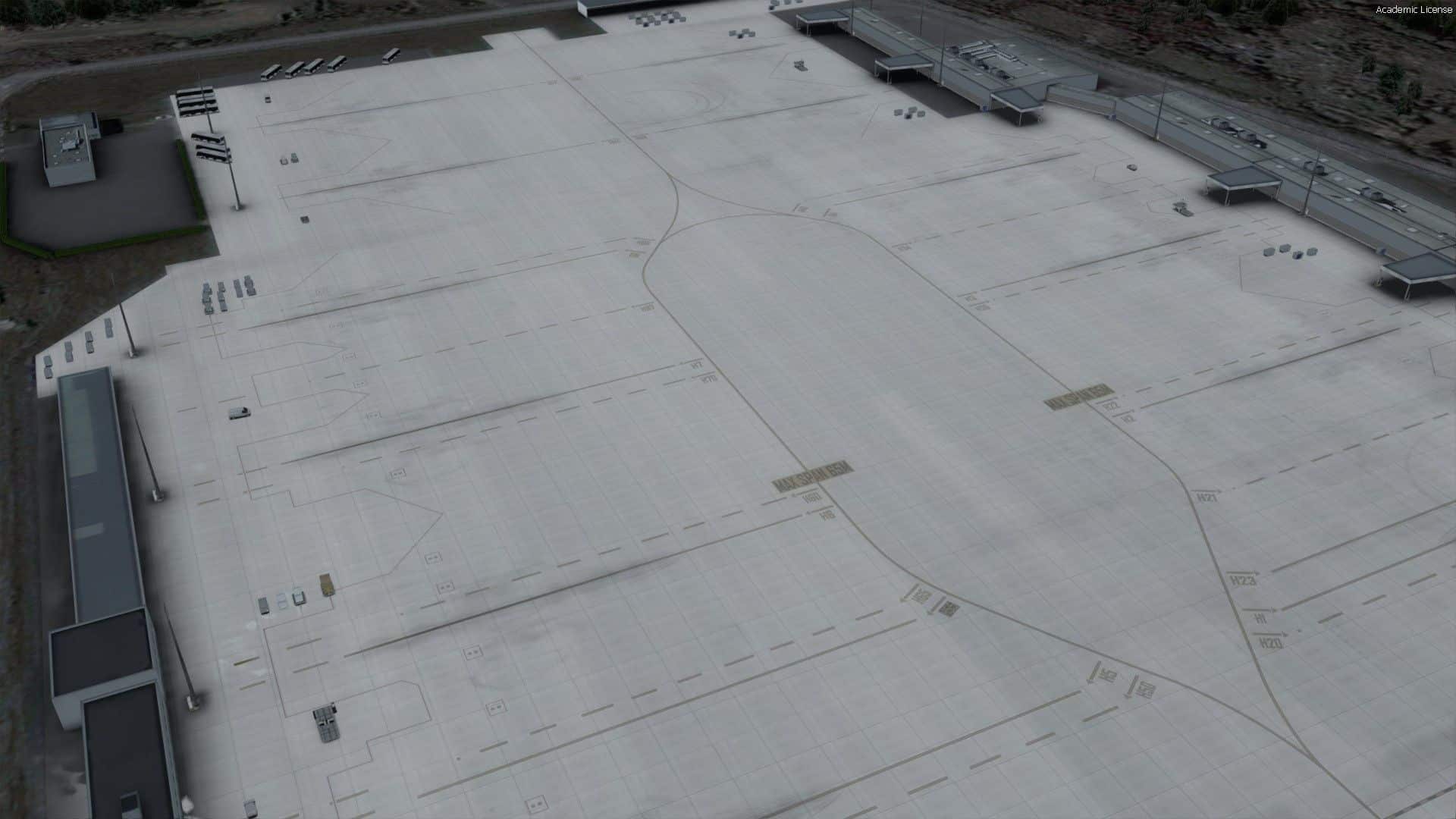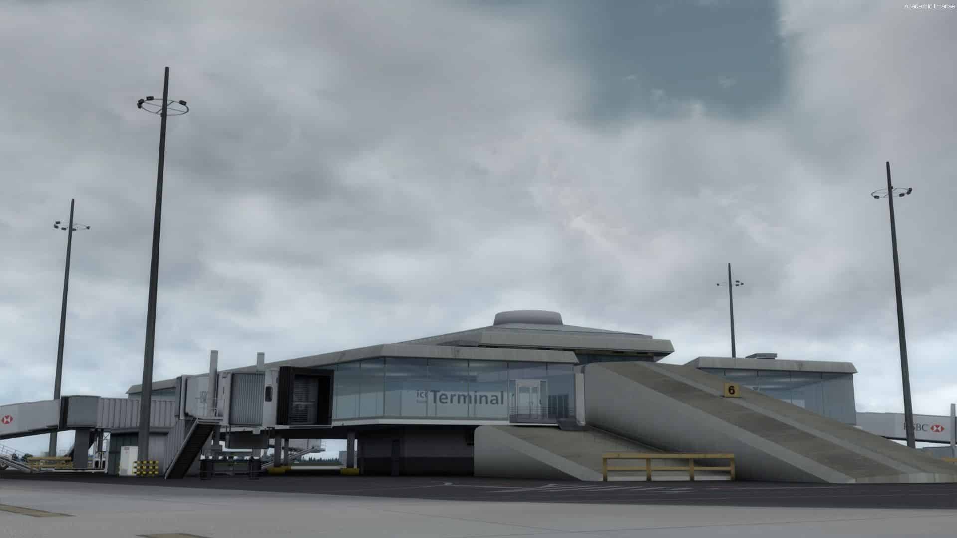 Die sogenannte Landside, der Bereich in dem Passagiere mit Auto, Taxi oder Bus ankommen bzw. abgeholt werden, ist bei dieser speziellen Bauform des Terminals direkt vom Rollfeld einzusehen. Sie befindet sich unterhalb des runden Gebäudes, ist aber von Taxi2Gate nicht mit besonderen Einzelheiten ausgestattet worden. Die Frage ob derartige Bereiche mit aufwendigeren Details dekortiert werden sollten, ist oftmals ein großer Streitpunkt bei neuen Szenerien. Eine Option (beispielsweise in einem Konfigurationstool o.ä.) für mehr Details wie zum Bespiel Fahrzeuge oder Laternen, die den Bereich lebendiger machen, hätte meiner Meinung nach einen guten Kompromiss zwischen Performance und „Eye-Candy“ dargestellt.