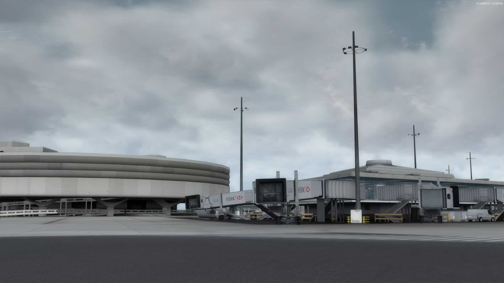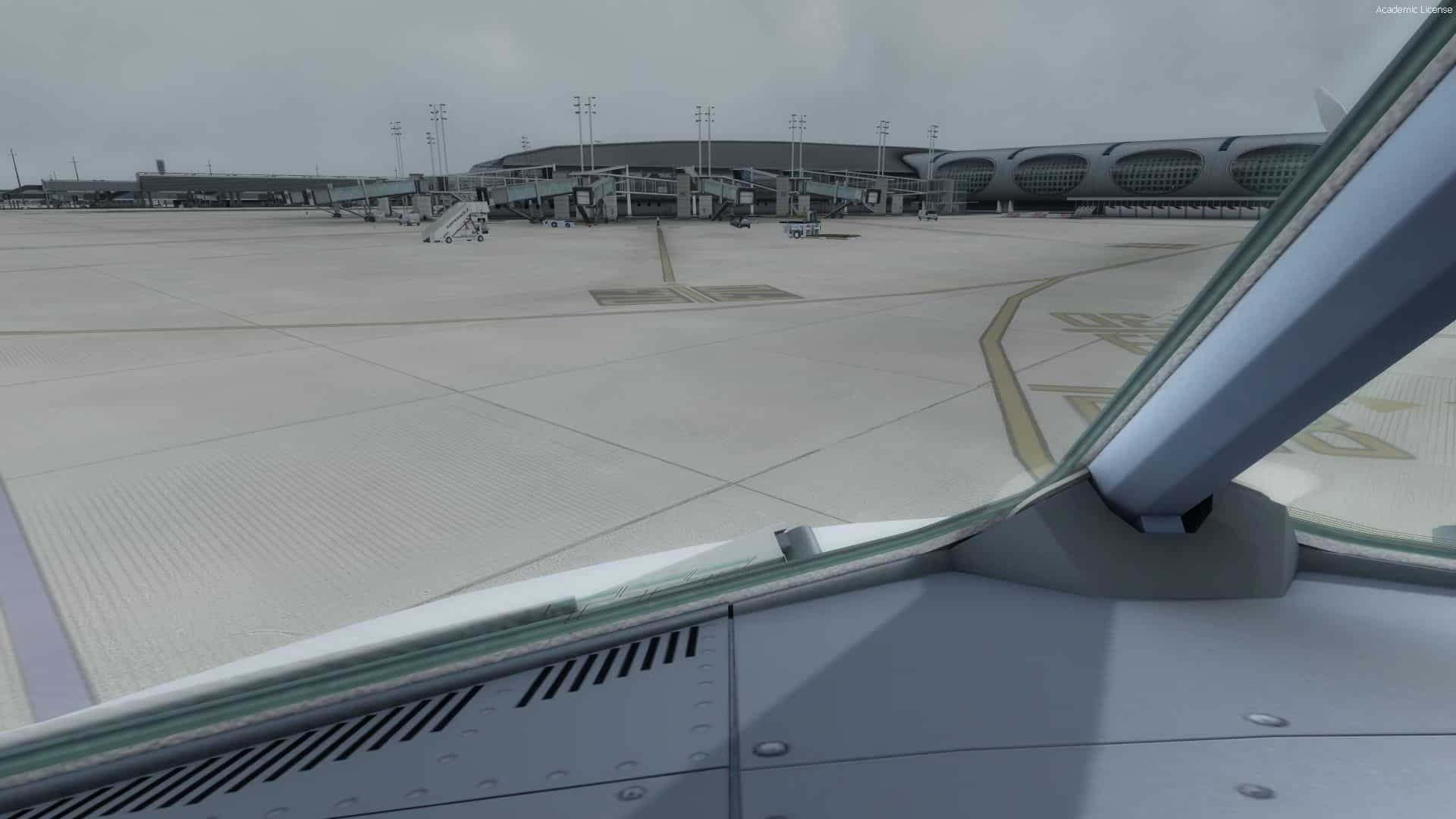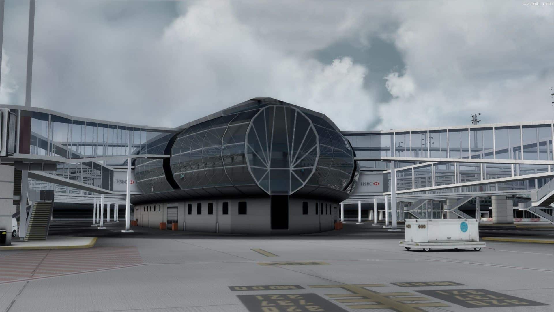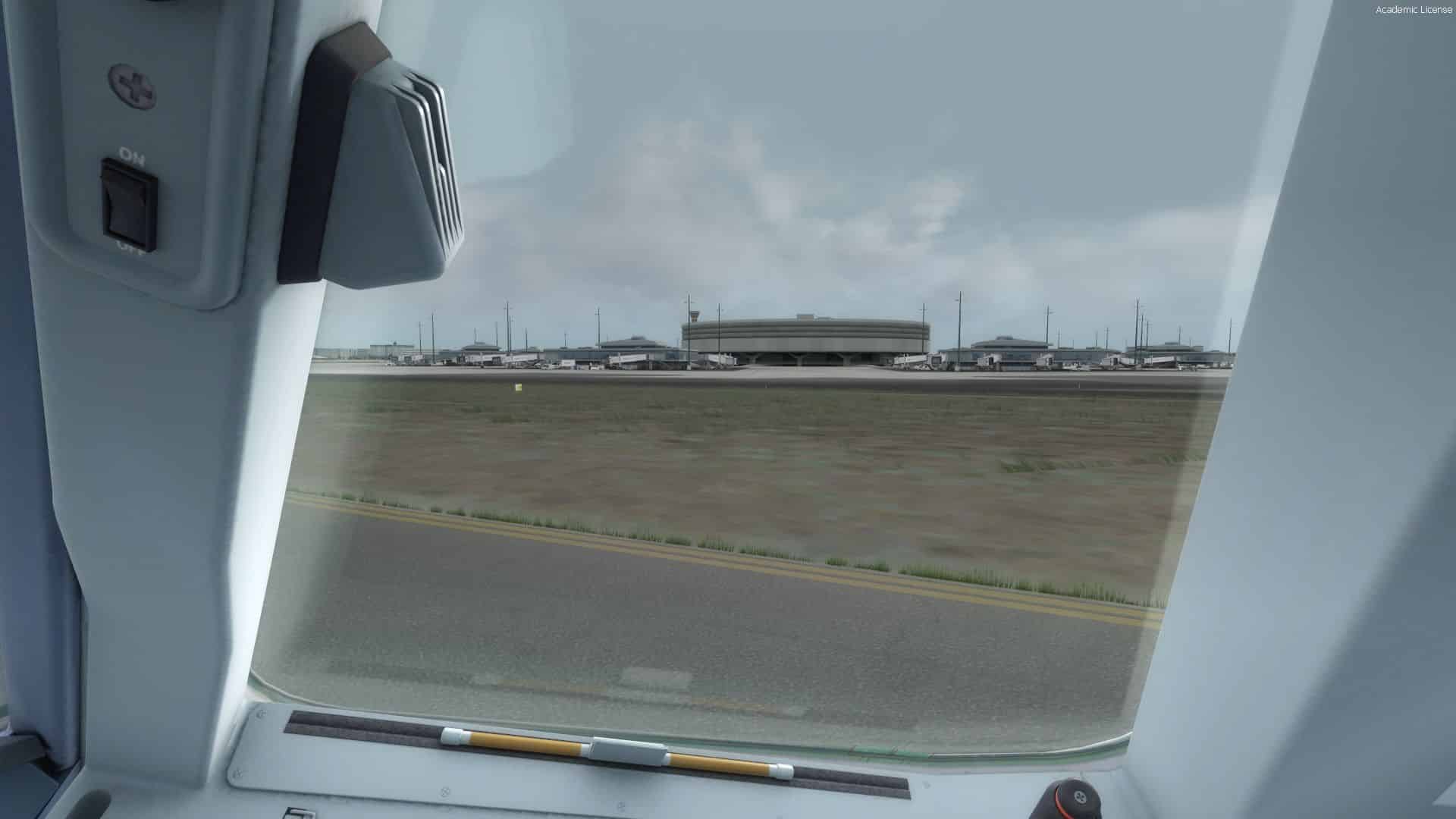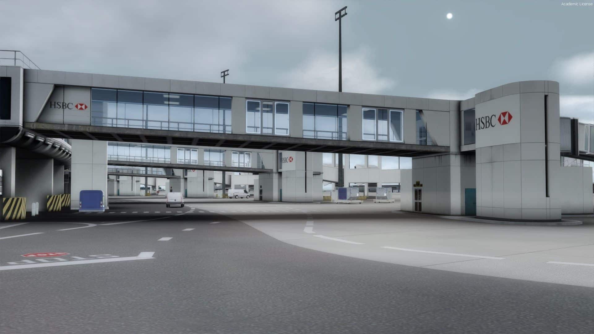 Die sogenannte Landside, der Bereich in dem Passagiere mit Auto, Taxi oder Bus ankommen bzw. abgeholt werden, ist bei dieser speziellen Bauform des Terminals direkt vom Rollfeld einzusehen. Sie befindet sich unterhalb des runden Gebäudes, ist aber von Taxi2Gate nicht mit besonderen Einzelheiten ausgestattet worden. Die Frage ob derartige Bereiche mit aufwendigeren Details dekortiert werden sollten, ist oftmals ein großer Streitpunkt bei neuen Szenerien. Eine Option (beispielsweise in einem Konfigurationstool o.ä.) für mehr Details wie zum Bespiel Fahrzeuge oder Laternen, die den Bereich lebendiger machen, hätte meiner Meinung nach einen guten Kompromiss zwischen Performance und „Eye-Candy“ dargestellt.